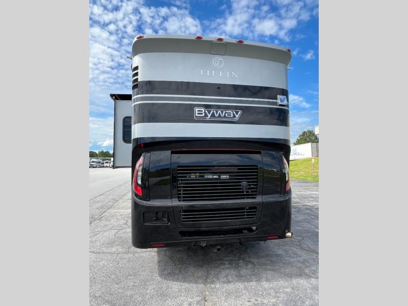 Say hello to affordable luxury with the Byway Class A diesel motorhomes by Tiffin Motorhomes. Each model includes an Allison 2500 MH 6-speed automatic transmission for power you can feel, and a Freightliner XCS straight rail rear engine diesel chassis for a strong foundation. All of your power needs will be met with an 8.0kW Onan Quiet diesel generator, 2,000-watt Pure Sine wave inverter, and (4) 6-volt, 230-amp hours flooded lead-acid house batteries. A Truma AquaGo comfort instant water heater is a feature you won't want to travel without, and the Spyder controls multiplex system keeps you in control of your units functions. It won't be hard to find luxury features inside, like the handcrafted overhead cabinetry, solid surface countertops, full tile backsplash in the kitchen, and Ultrafabrics Montage captain's seats. The driver will also love the 7" high-def LED multichannel monitor for the side-view and back up cameras plus an in-dash navigation system to help you arrive at your destination!