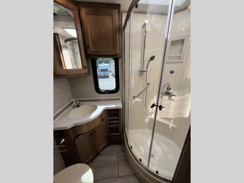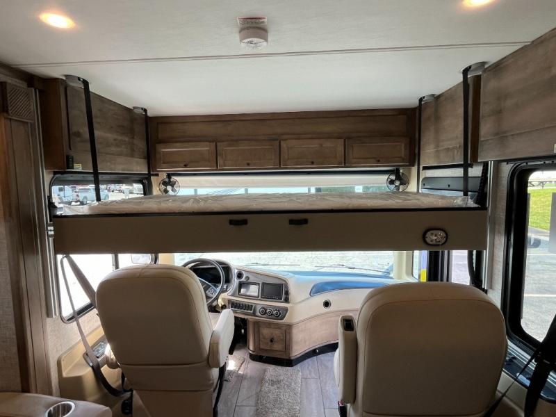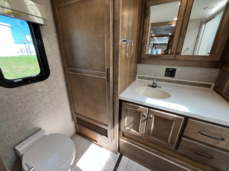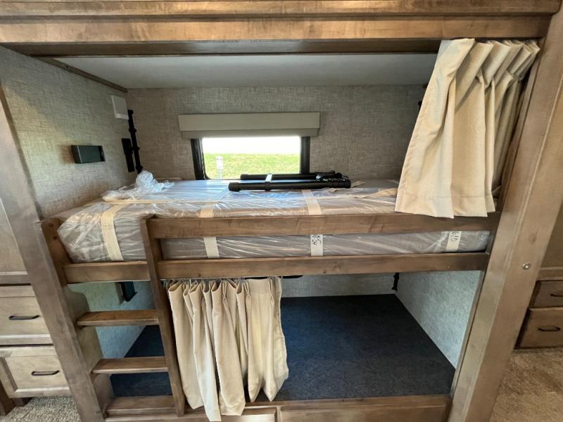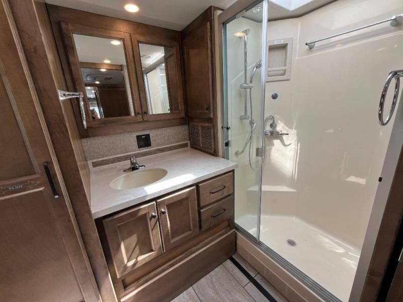 A full-wall slide plus two additional slides provides ample room to stretch out in this coach! It will be so easy to travel with a larger group since there is a full rear bath, bunk beds, plus a second full bath right across the bunks for convenience! You will surely appreciate the master bedroom with dual bedroom wardrobes and nightstands, a king bed slide out, and quick entrance into the rear bath. In the morning, you can prepare breakfast for everyone on the three burner cooktop or in the 1.5 cu. ft. Smart convection microwave, and the perishables can go back in the 18 cu. ft. residential refrigerator when you're done. Your crew can also make themselves comfortable on the air coil sofa and booth dinette sleeper, and these areas can double as sleeping space as well. If you need more sleeping space, you might want to add the optional drop-down front bunk!
