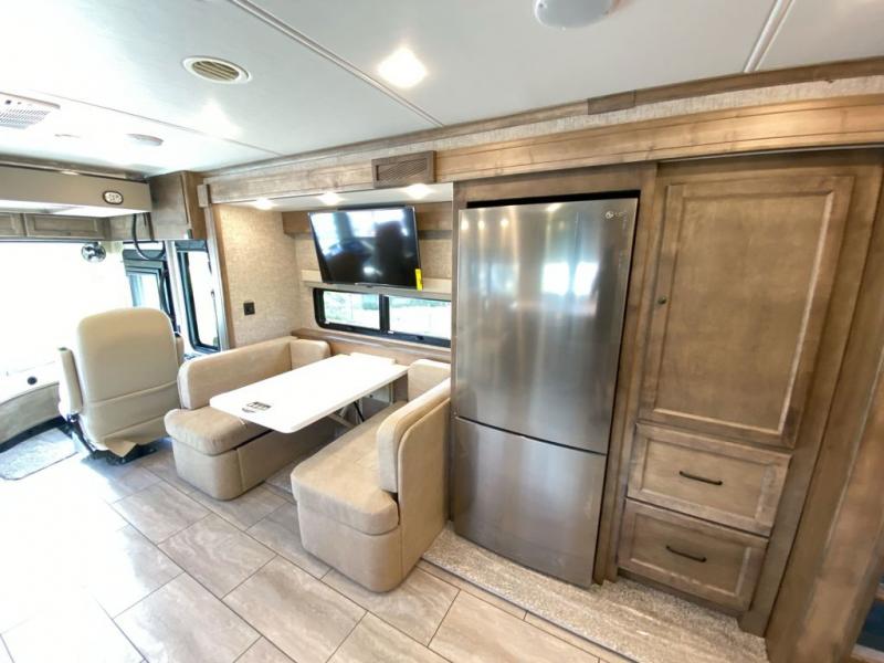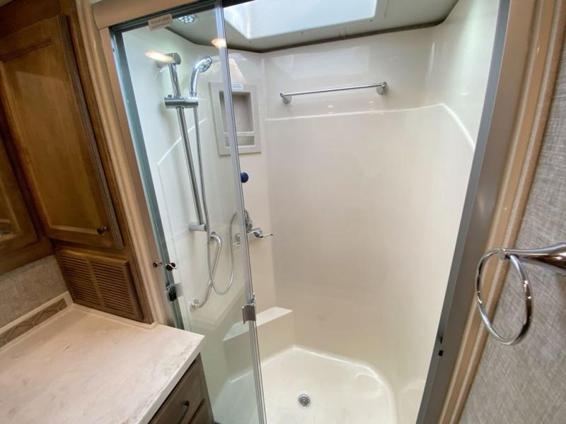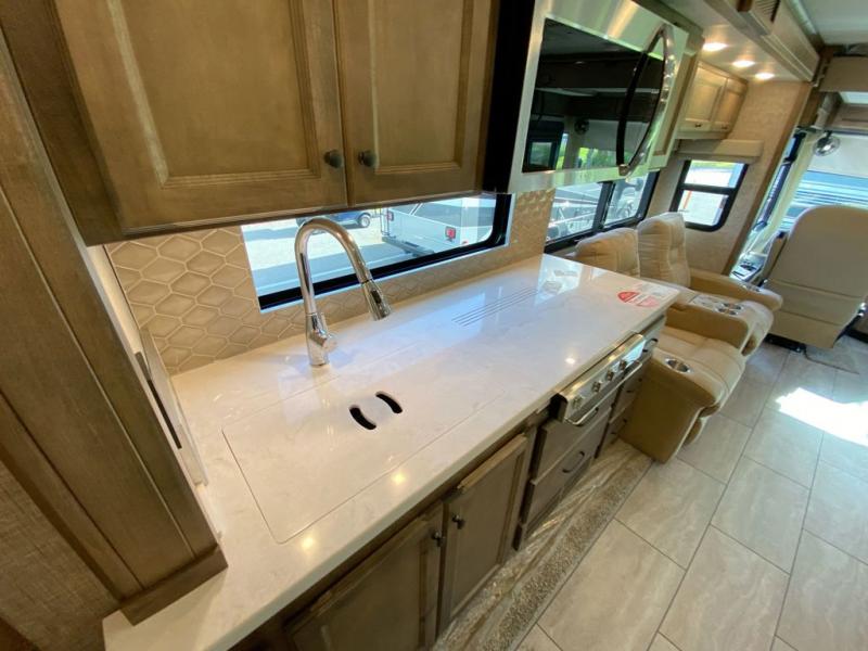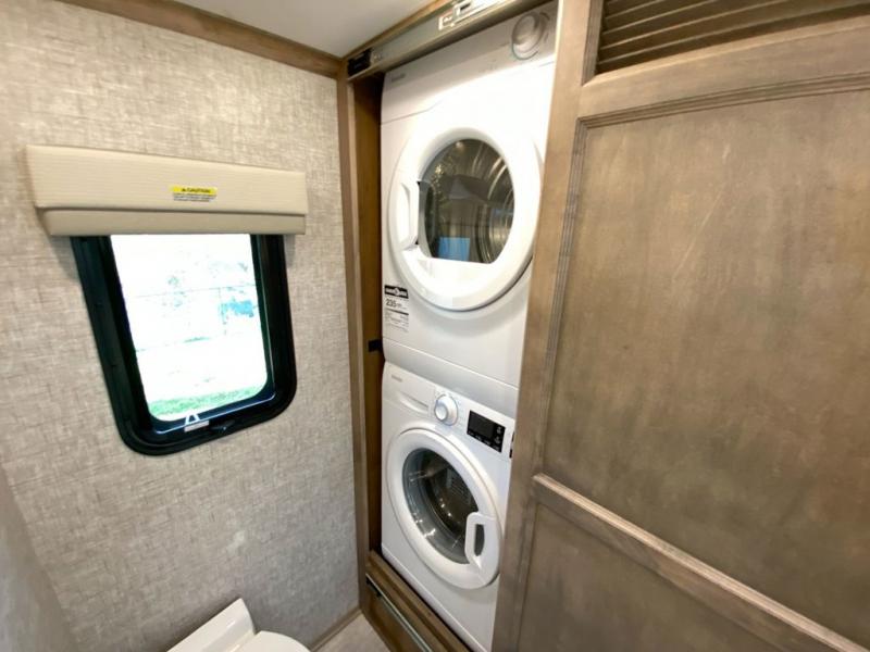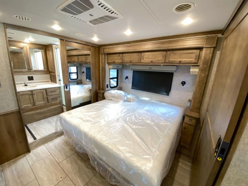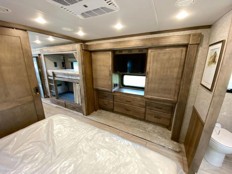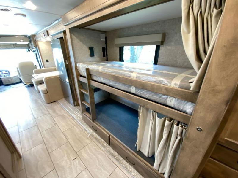 A full-wall slide plus two additional slides provides ample room to stretch out in this coach! It will be so easy to travel with a larger group since there is a full rear bath, bunk beds, plus a second full bath right across the bunks for convenience! You will surely appreciate the master bedroom with dual bedroom wardrobes and nightstands, a king bed slide out, and quick entrance into the rear bath. In the morning, you can prepare breakfast for everyone on the three burner cooktop or in the 1.5 cu. ft. Smart convection microwave, and the perishables can go back in the 18 cu. ft. residential refrigerator when you're done. Your crew can also make themselves comfortable on the air coil sofa and booth dinette sleeper, and these areas can double as sleeping space as well. If you need more sleeping space, you might want to add the optional drop-down front bunk!