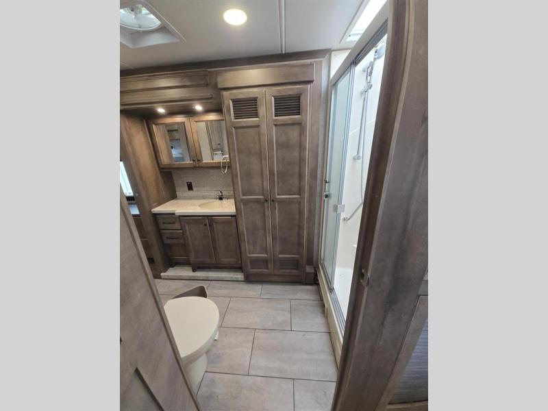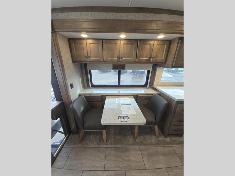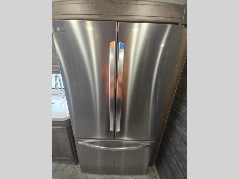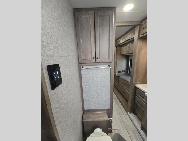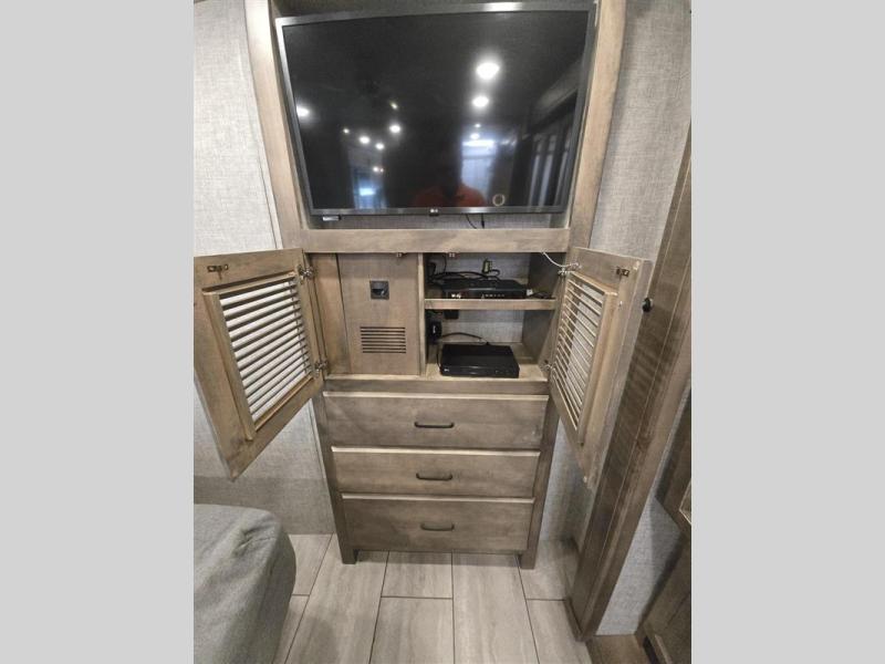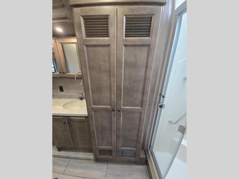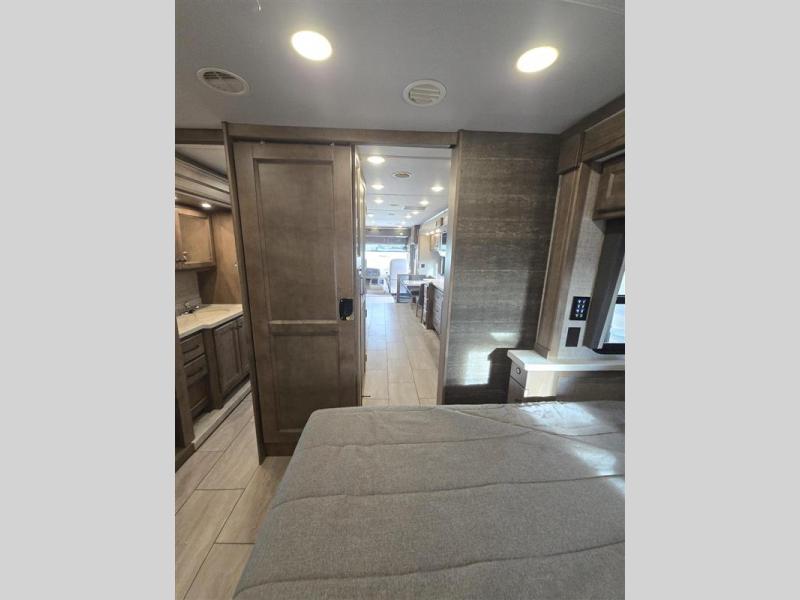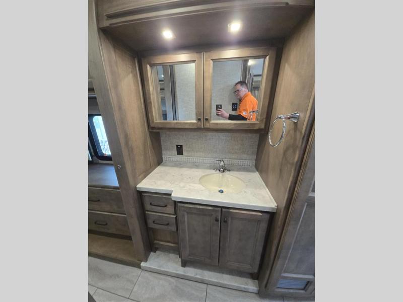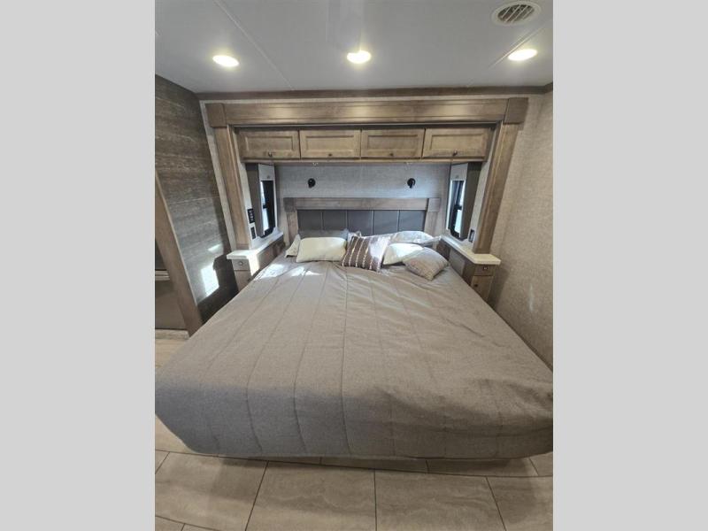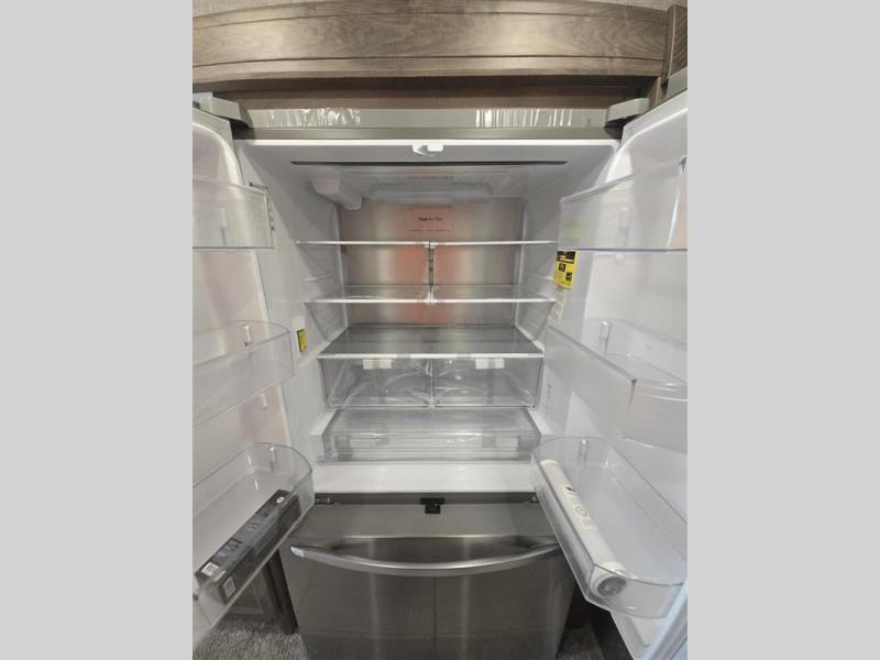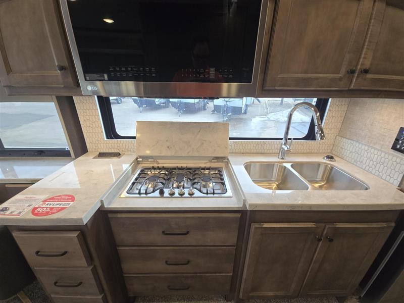 There are many standard luxurious features you will love about this motorhome! It also has many optional features you can add like the optional drop-down front bunk, the super sofa, the air coil sofa bed, or the theater seating. The king bed slide in the rear private bedroom offers a comfortable place to sleep, as well as the flip and fold sofa bed in the living area. You will love the dinette bar with a lift TV, a flip-up countertop, and two chairs that will make this the perfect place to get some work done while you're on the road. The kitchen includes everything you need to prepare meals each day, including a 1.7 cu. ft. smart convection microwave with an air fryer, a three burner liquid propane cooktop, and a 23 cu. ft. stainless steel residential refrigerator with French doors and a bottom freezer. Head to the rear master bedroom with a queen bed slide out, a large wardrobe, a cabinet with a TV and drawers below, plus a private entrance into the dual entry bath!