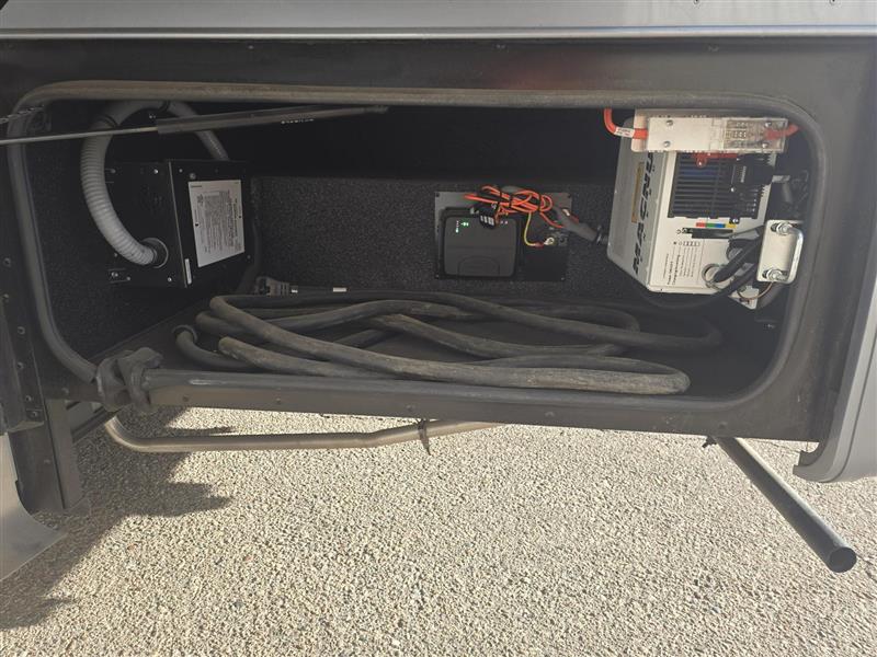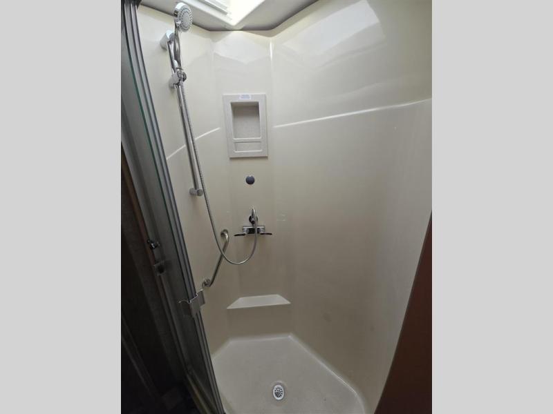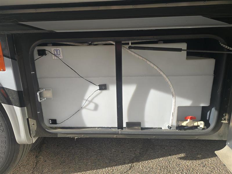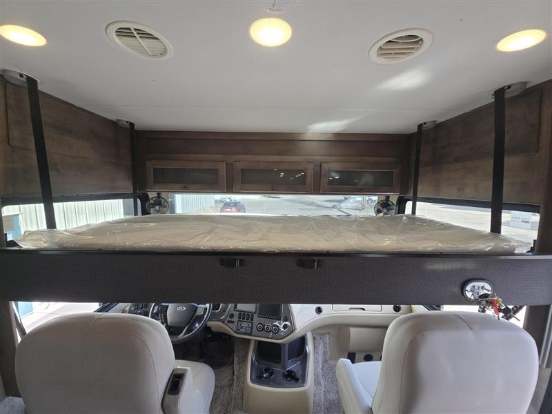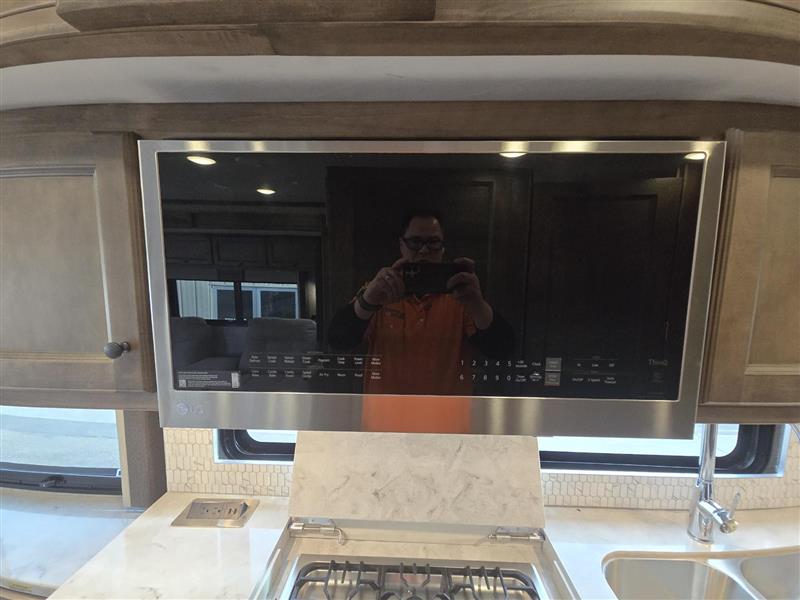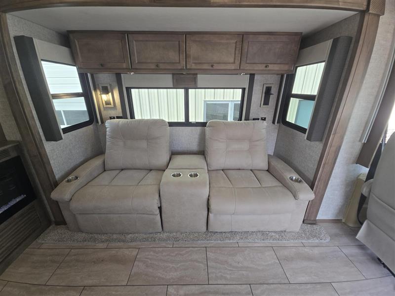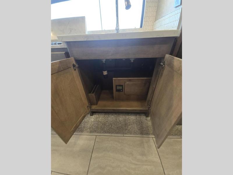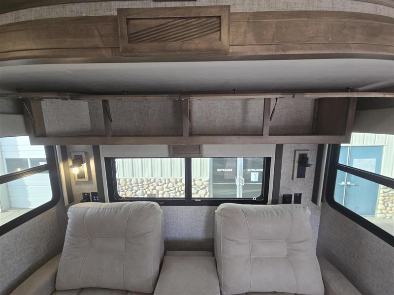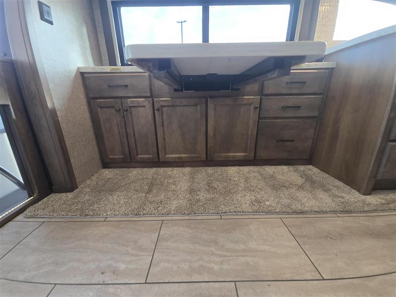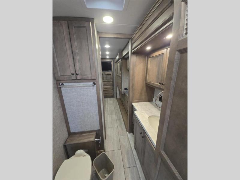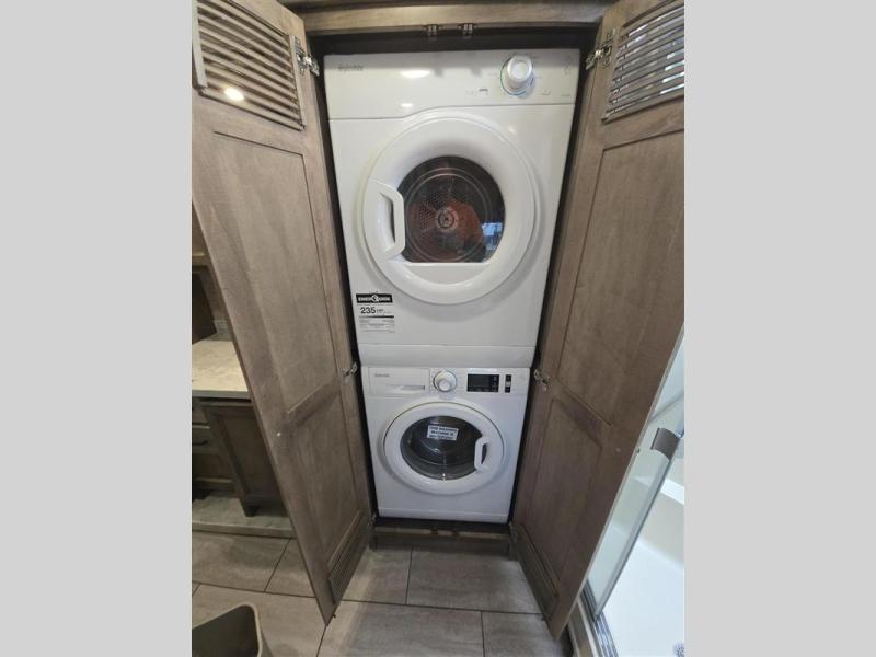 There are many standard luxurious features you will love about this motorhome! It also has many optional features you can add like the optional drop-down front bunk, the super sofa, the air coil sofa bed, or the theater seating. The king bed slide in the rear private bedroom offers a comfortable place to sleep, as well as the flip and fold sofa bed in the living area. You will love the dinette bar with a lift TV, a flip-up countertop, and two chairs that will make this the perfect place to get some work done while you're on the road. The kitchen includes everything you need to prepare meals each day, including a 1.7 cu. ft. smart convection microwave with an air fryer, a three burner liquid propane cooktop, and a 23 cu. ft. stainless steel residential refrigerator with French doors and a bottom freezer. Head to the rear master bedroom with a queen bed slide out, a large wardrobe, a cabinet with a TV and drawers below, plus a private entrance into the dual entry bath!