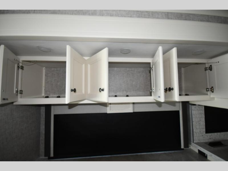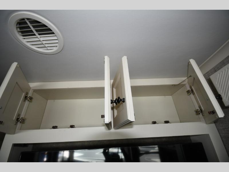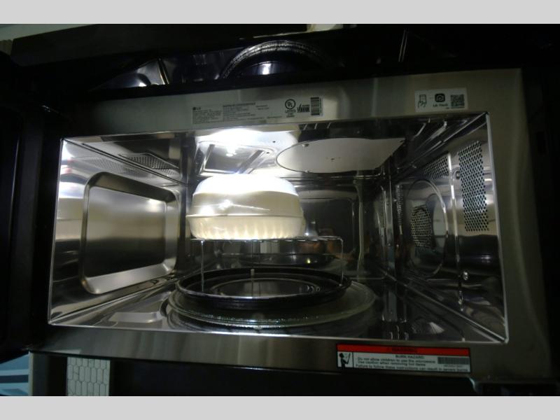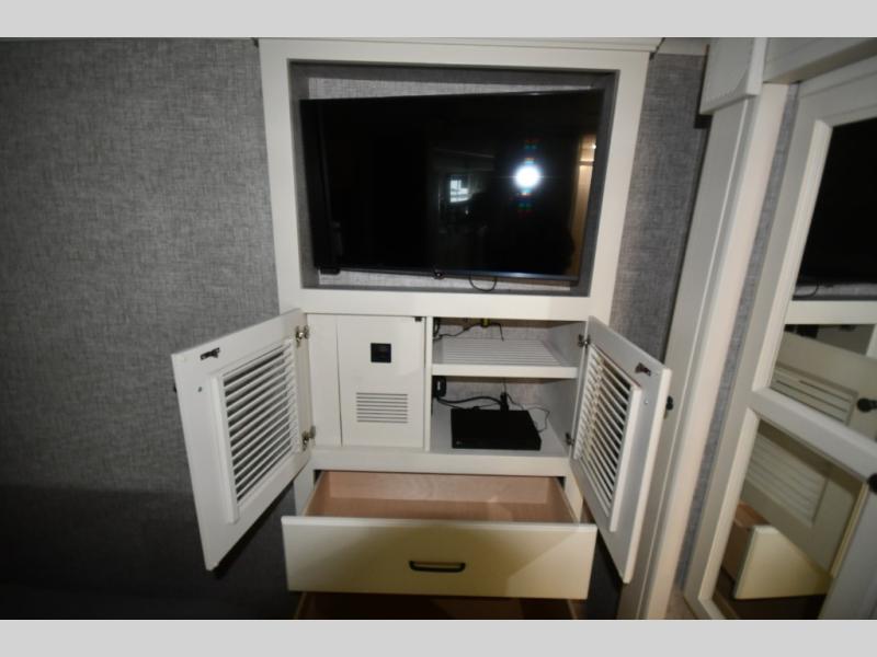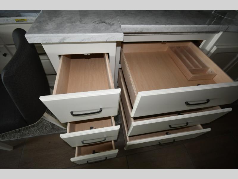 There are many standard luxurious features you will love about this motorhome! It also has many optional features you can add like the optional drop-down front bunk, the super sofa, the air coil sofa bed, or the theater seating. The king bed slide in the rear private bedroom offers a comfortable place to sleep, as well as the flip and fold sofa bed in the living area. You will love the dinette bar with a lift TV, a flip-up countertop, and two chairs that will make this the perfect place to get some work done while you're on the road. The kitchen includes everything you need to prepare meals each day, including a 1.7 cu. ft. smart convection microwave with an air fryer, a three burner liquid propane cooktop, and a 23 cu. ft. stainless steel residential refrigerator with French doors and a bottom freezer. Head to the rear master bedroom with a queen bed slide out, a large wardrobe, a cabinet with a TV and drawers below, plus a private entrance into the dual entry bath!