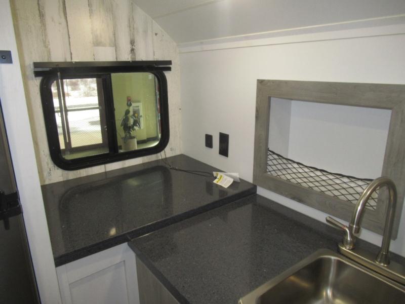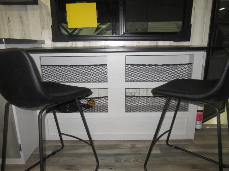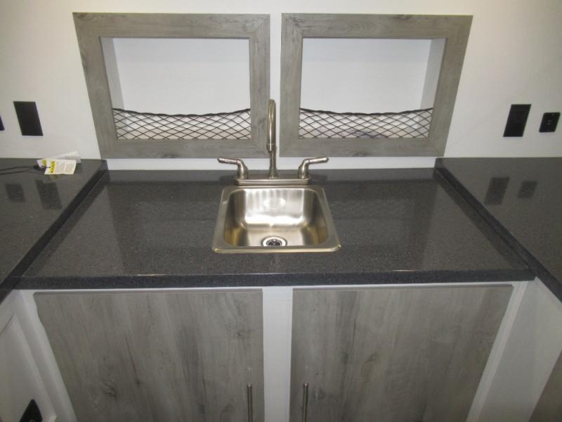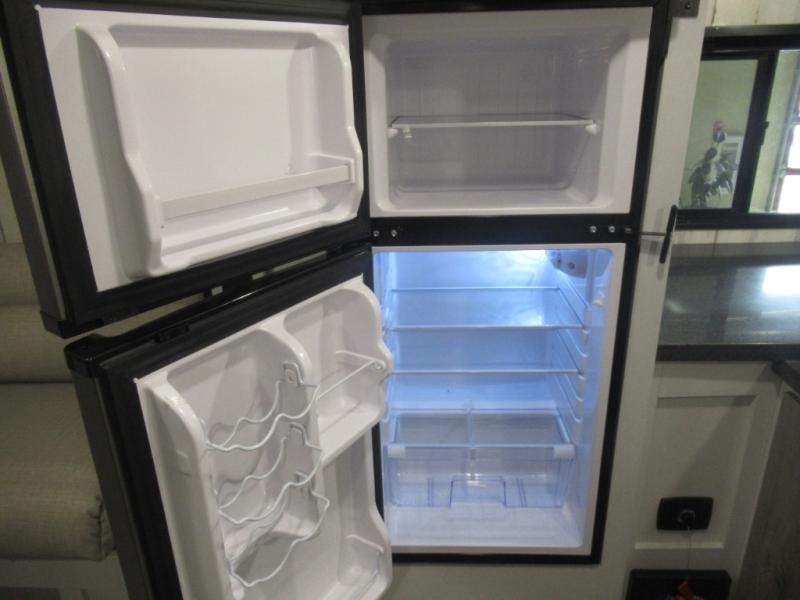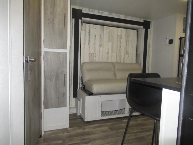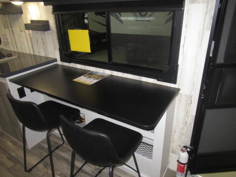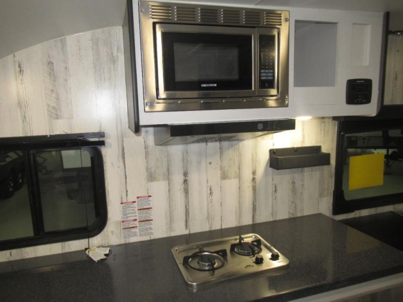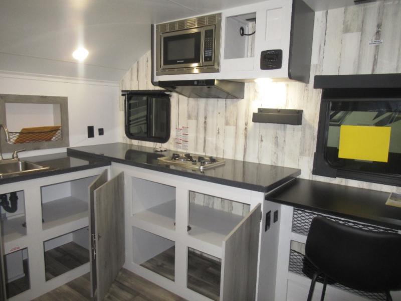 The rear bathroom is a serene oasis, complete with a spacious 24” x 36” shower and medicine cabinet for all your storage needs. The living area features a convenient roll-over sofa/Murphy bed, perfect for relaxing and taking a nap on the road. The bar table top dinette provides additional seating and a great place to enjoy meals. The front kitchen is the perfect blend of convenience and efficiency, featuring a refrigerator, a two-burner countertop, and overhead cabinets for all your cooking and dining needs. Whether cooking up the greatest dinner or enjoying a quiet breakfast, this kitchen has everything you need to make mealtime a breeze.