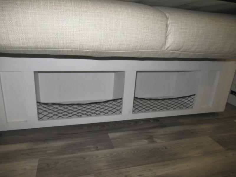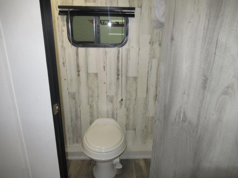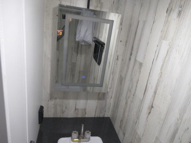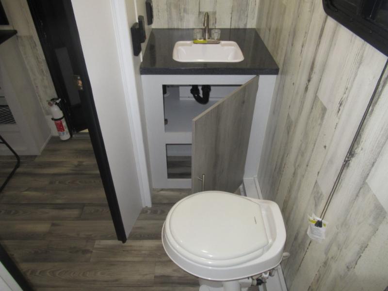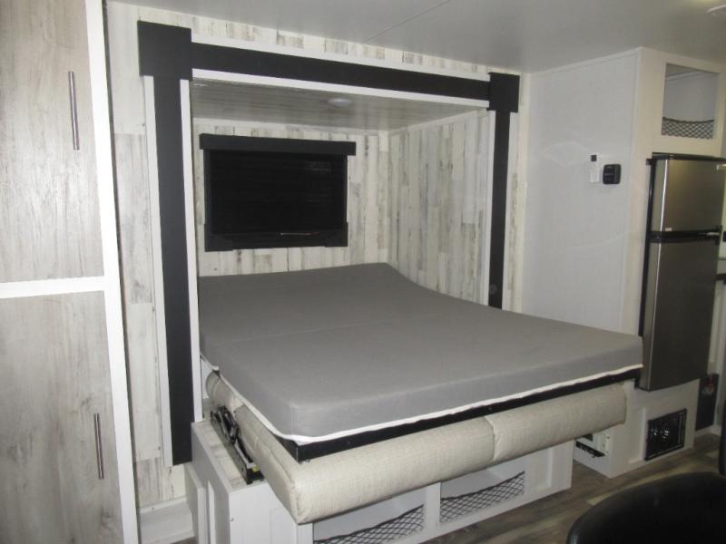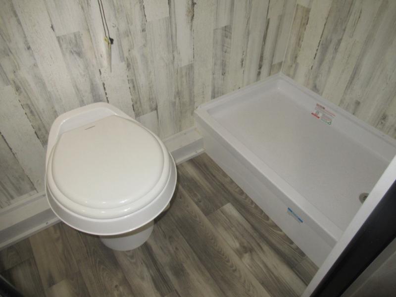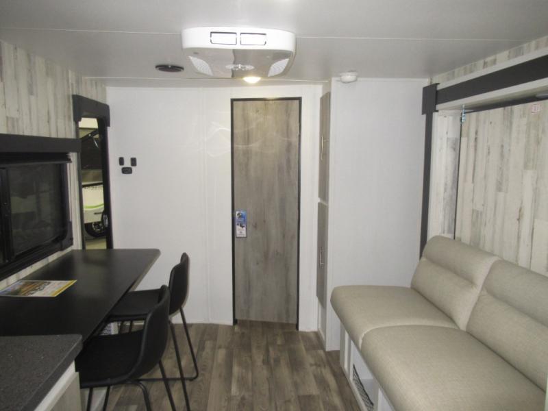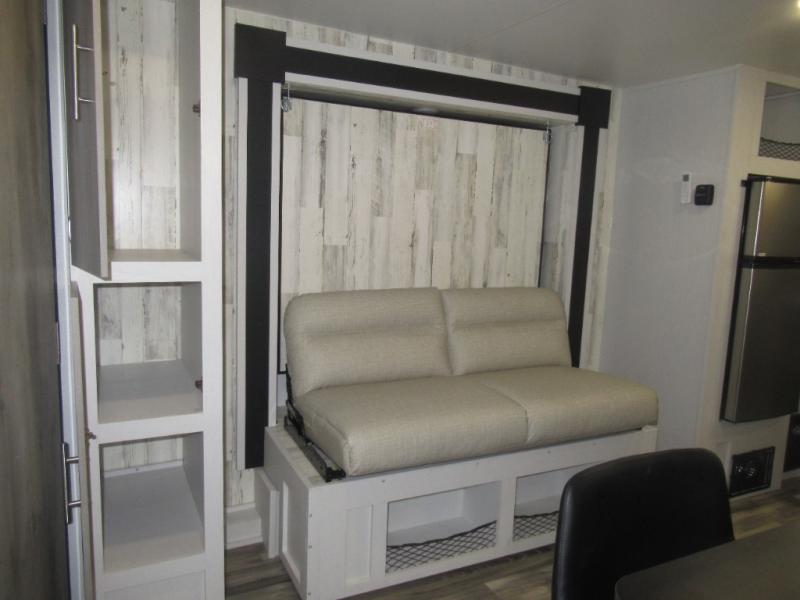 The rear bathroom is a serene oasis, complete with a spacious 24” x 36” shower and medicine cabinet for all your storage needs. The living area features a convenient roll-over sofa/Murphy bed, perfect for relaxing and taking a nap on the road. The bar table top dinette provides additional seating and a great place to enjoy meals. The front kitchen is the perfect blend of convenience and efficiency, featuring a refrigerator, a two-burner countertop, and overhead cabinets for all your cooking and dining needs. Whether cooking up the greatest dinner or enjoying a quiet breakfast, this kitchen has everything you need to make mealtime a breeze.