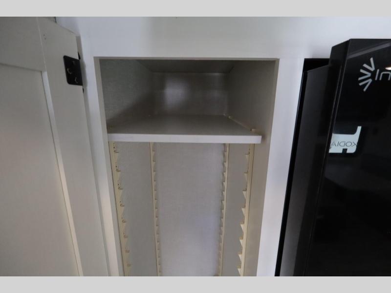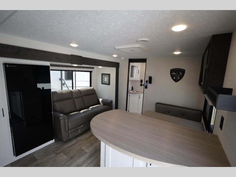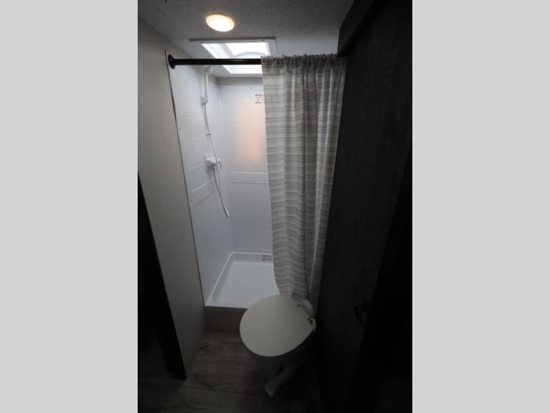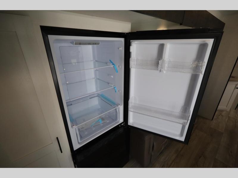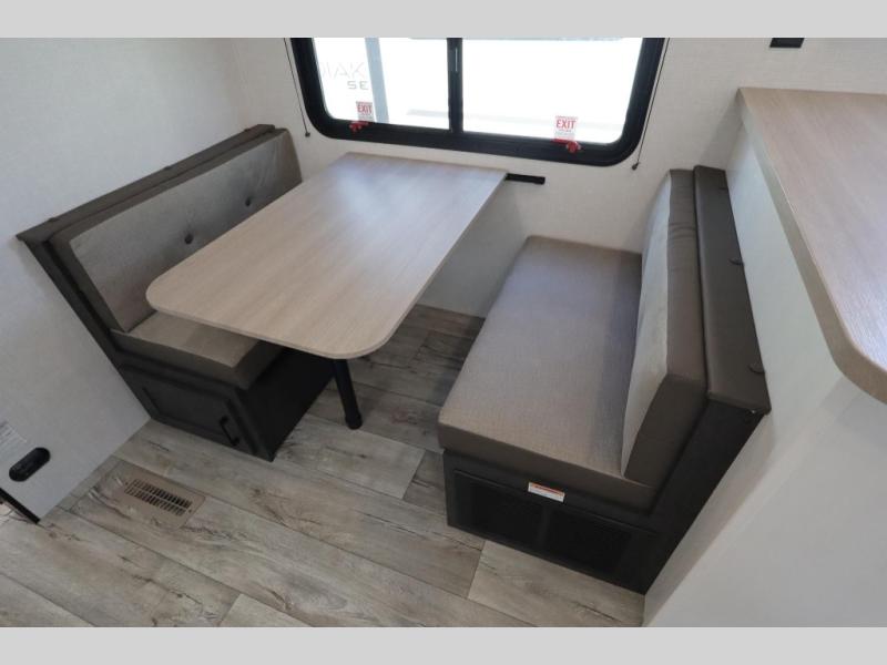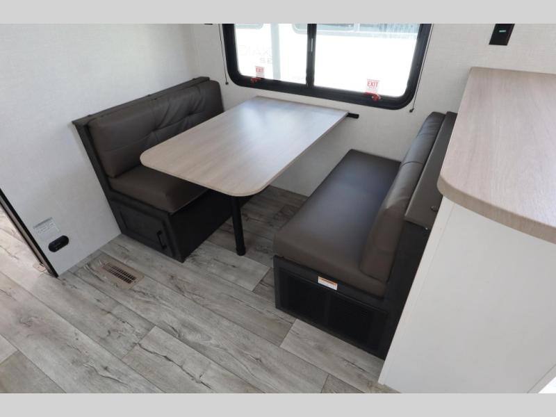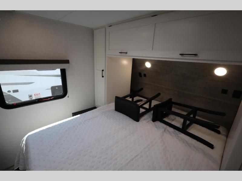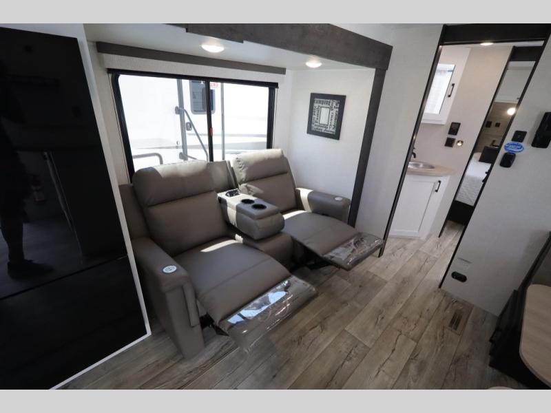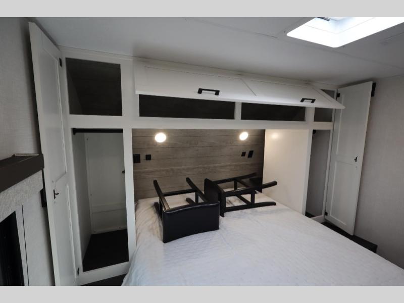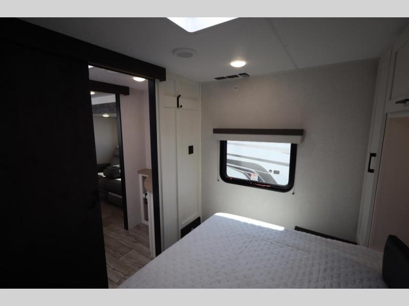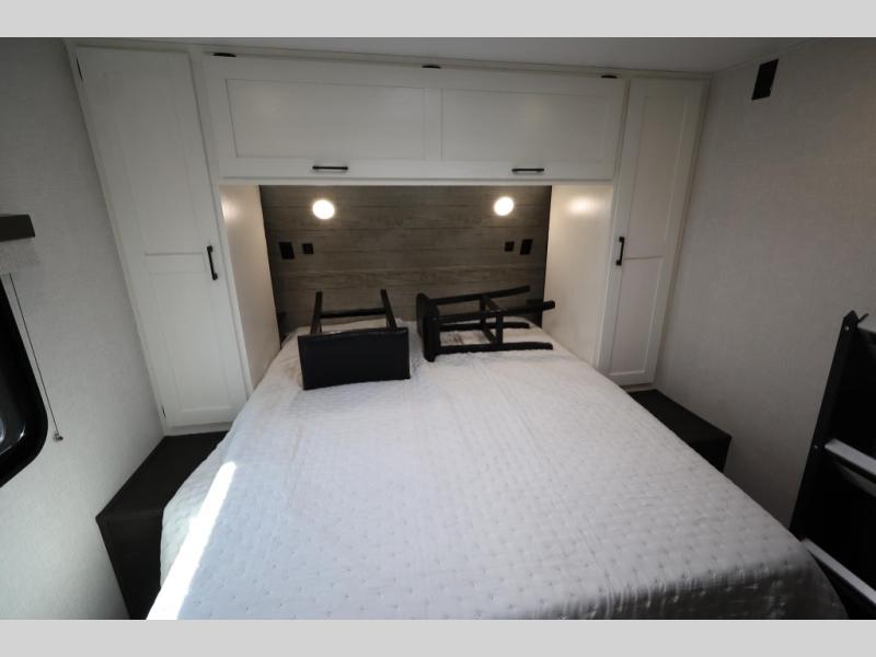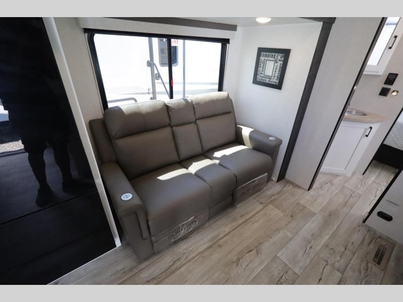 You'll love every minute spent in this dual entry travel trailer. The front master bedroom includes one of these doors, along with a Sleep Tight queen bed, dual wardrobes, and easy access into the walk-thru bath. Your crew can relax on the theater seating within the large slide out, play a game at the Sit N' Slide table with flipside reversible cushions, or dine at the bartop with stools. There is also a rear kitchen with ample counter space. Head outdoors to enjoy the 20' power awning in your camp chairs!