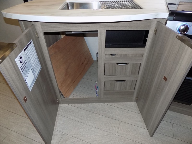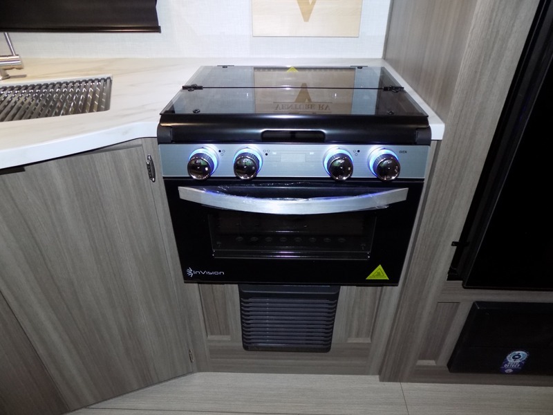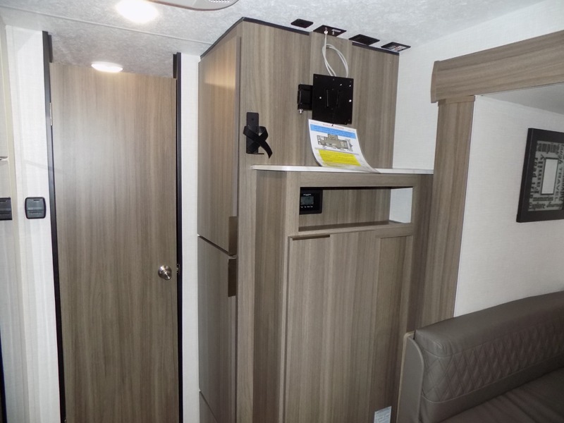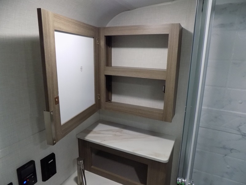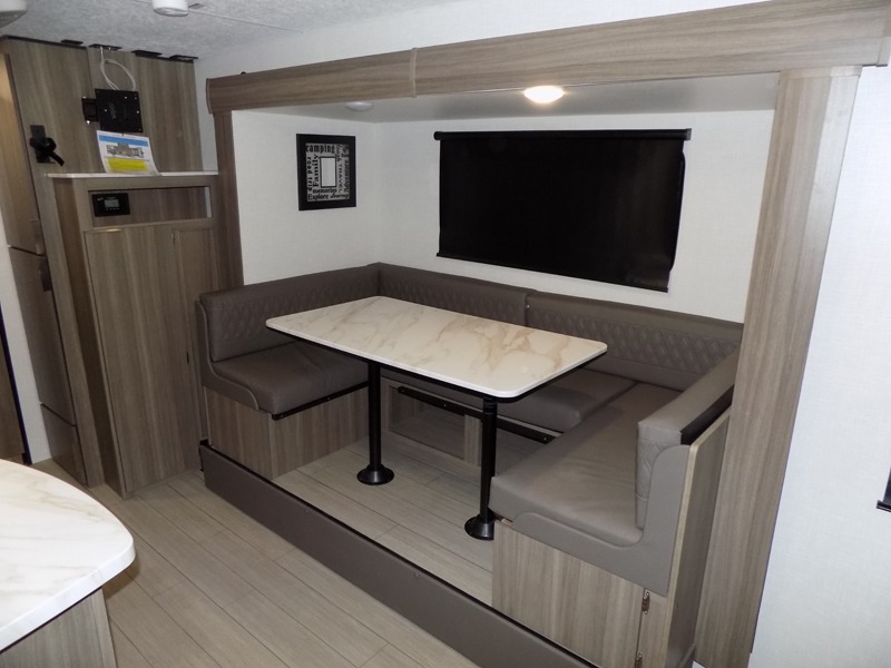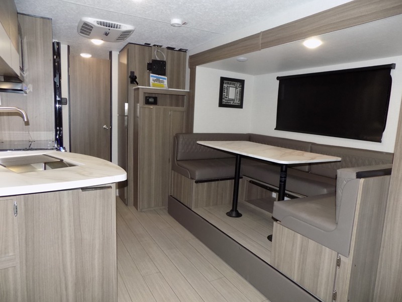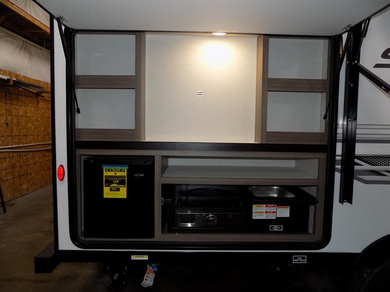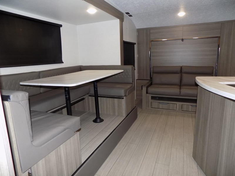 A cook will love this trailer with the choice to make meals inside with full amenities including an 8 cu. ft. refrigerator and a pantry, or outside while using the campfire cafe which offers a griddle and refrigerator, plus counter space to prepare and serve meals. There is sleeping space for four when you utilize the U-shaped dinette slide out that also provides more interior floor space along with the versatile Murphy bed and sofa up front. You will also find a privacy curtain that will section off this area that also features StorMore bedside nightstands with a 110V outlet and USB charging, and two wardrobes.