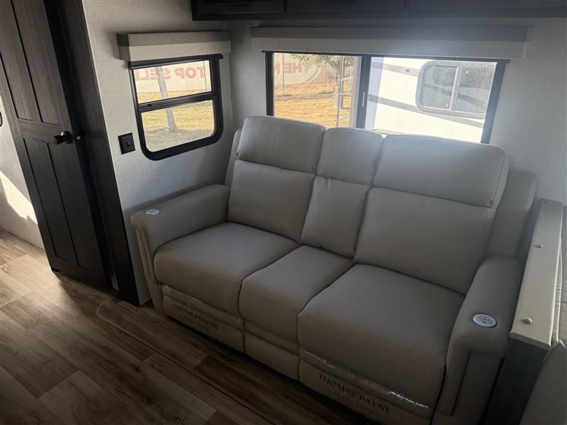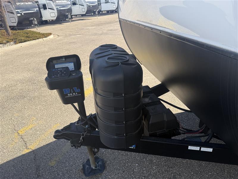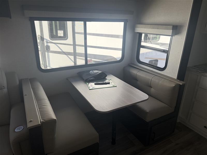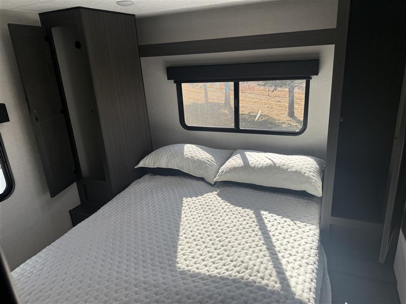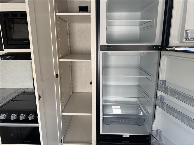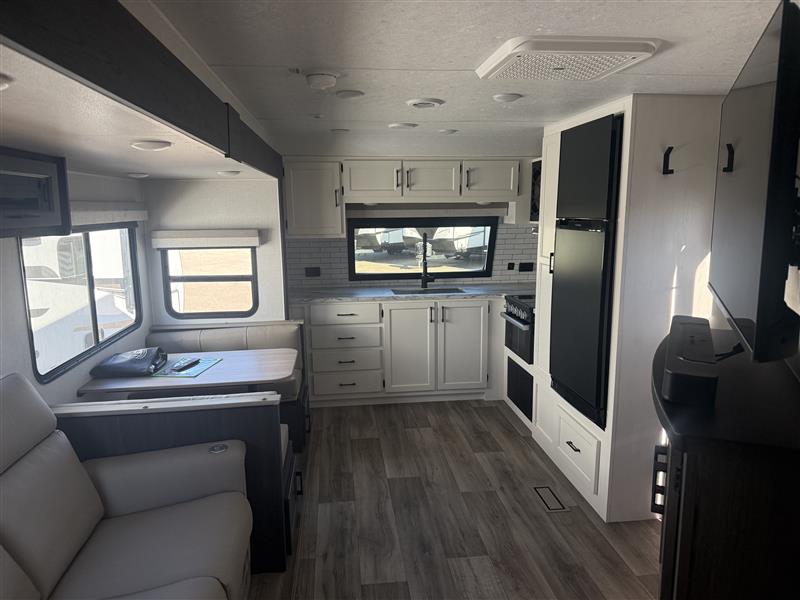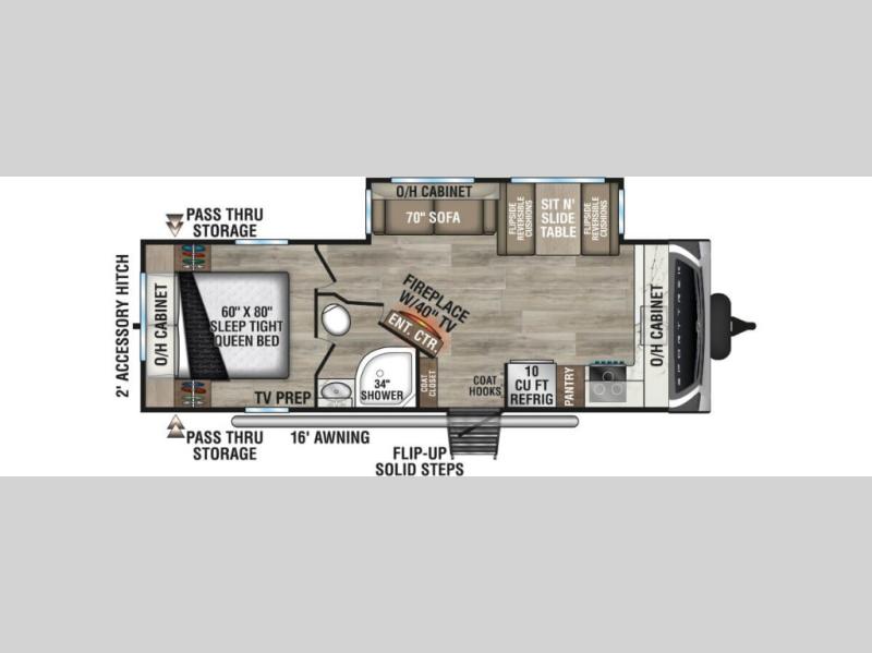 A front kitchen in this travel trailer provides more interior space! Once you have prepared your best meals with the Furrion oven and three burner cooktop, you can head to the Sit N' Slide table with flipside reversible cushions to dine. The 70" sofa also offers a comfortable place to take an afternoon nap or sit while enjoying the entertainment center with a frameless electric fireplace and 40" TV on a swing arm. A dual entry bathroom makes it easy for all to enter and has a 34" radius shower to freshen up in each morning. The rear private bedroom has a Sleep Tight queen bed for a good night's rest, wardrobes on either side of it, and an entrance into the bathroom too!
