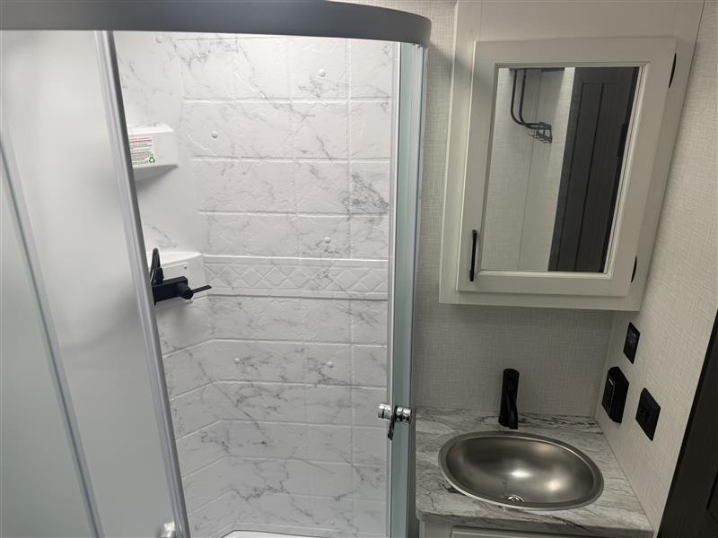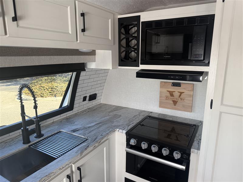 Every Venture RV SportTrek lightweight travel trailer is constructed to offer peace of mind and the comforts of home! Their purposeful residential kitchens are packed with handy features like a Furrion oven and three burner cooktop, a large stainless steel sink with a cover and dish drying rack, plus a 12V refrigerator. You will find plenty of storage throughout, including Safe-Tek hidden storage with a charging center and StorMore nightstands on either side of the bed behind the full-length closets. And the magnetic slam-latch baggage doors and spacious pass-through storage area will hold your outdoor gear in place. They even come with a hot and cold exterior shower and SporTrek's Weather Shield which includes a forced air heated and enclosed underbelly, high output A/C ducting, and more features that will let you extend your camping season. You will also love the new residential upgraded furniture, Serta memory foam mattress, barn style passage doors, and many more comforts!