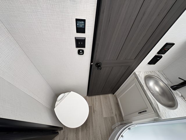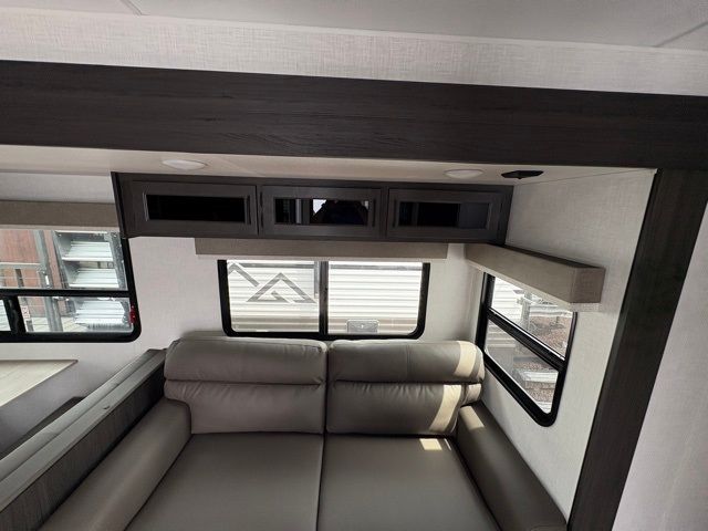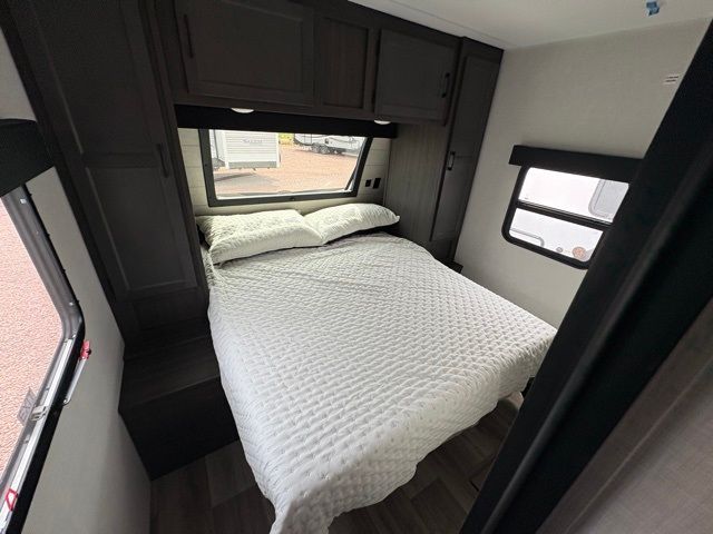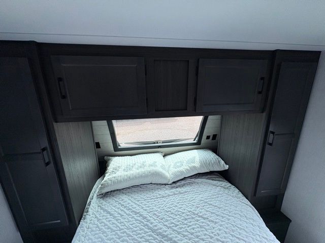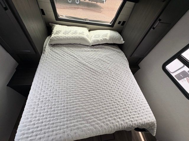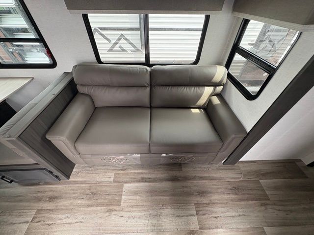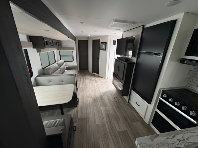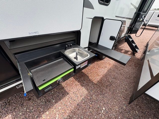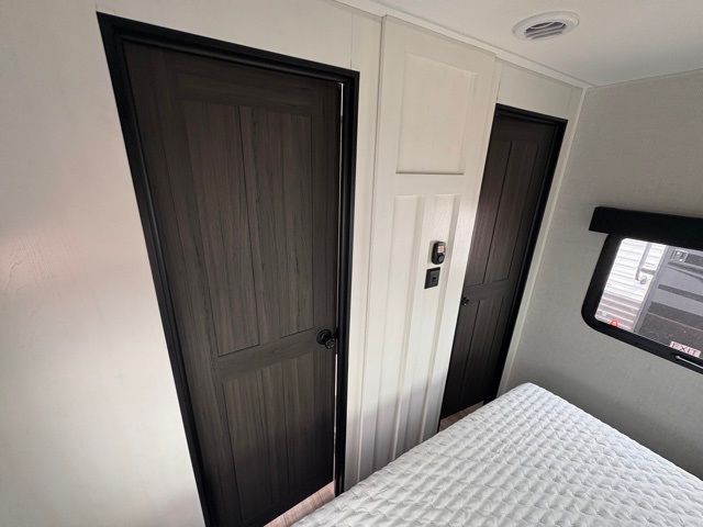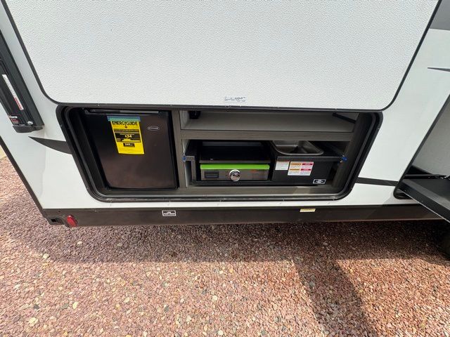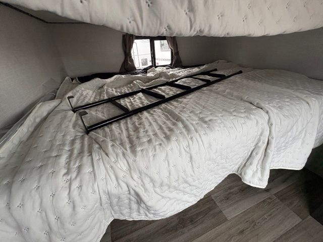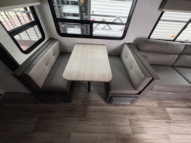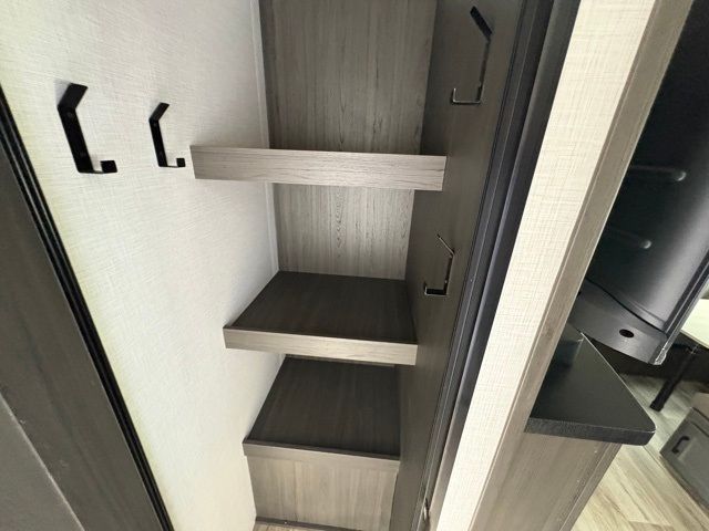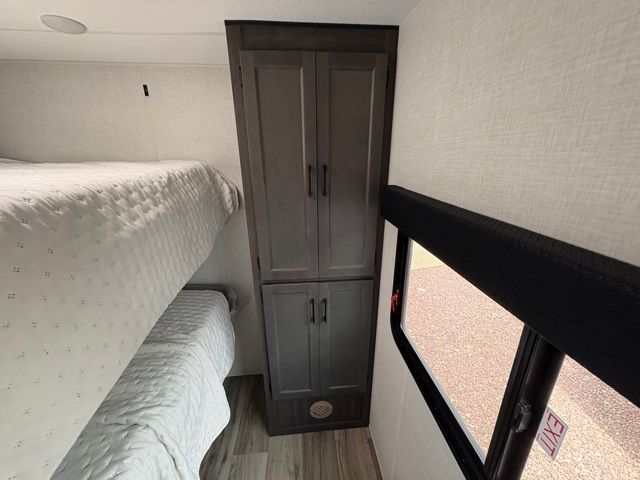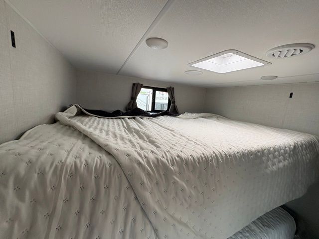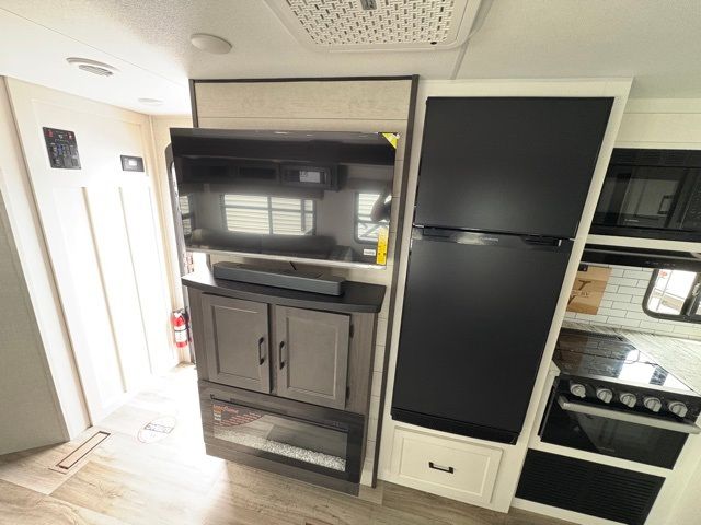 A front master bedroom with a Sleep Tight queen bed is sure to make you feel at home, while your guests take the queen-size bunks in the bunkhouse. There is also a TV mount here if you want to add a television plus a closet to keep clothes wrinkle-free. The large slide out in the main living area houses the 70" sofa and Sit N' Slide table with flipside reversible cushions, and there is a fireplace opposite here for a more cozy feel. There is plenty of storage space, including a walk-in pantry with coat hooks, dual bedside closets to keep clothes organized, and an exterior pass-thru storage for camp gear! A full kitchen inside will let you cook in comfort when the weather isn't cooperating, and an exterior campfire cafe includes an outdoor refrigerator, sink, and griddle for a sunrise breakfast!