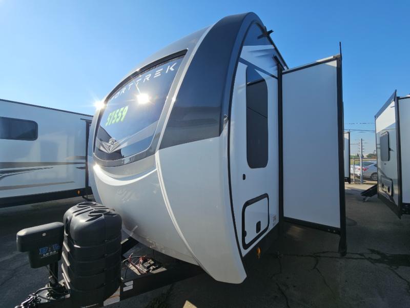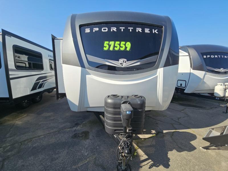 An elegant design and new features come with every one of these Venture RV SportTrek Touring Edition travel trailers! The NXG Huck bolt frame holds these units together and a walkable roof covers them. Heads will turn down the highway and at the campsite with an upgraded graphics package and a painted fiberglass front cap with integrated LED light. The exterior pass-through storage area has slam latch baggage doors with magnetic catches so you don't have to worry about them closing on you and a motion activated light to see your items clearly even at night. Luxury abounds throughout these units, especially with the mandatory Interior Luxury package which comes with solid surface kitchen countertops, designer valances with fabric nightshades, two 30" frameless fireplaces, and Beauflor wood plank flooring that is easy to clean. Come find your favorite model today!