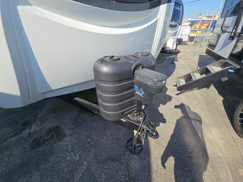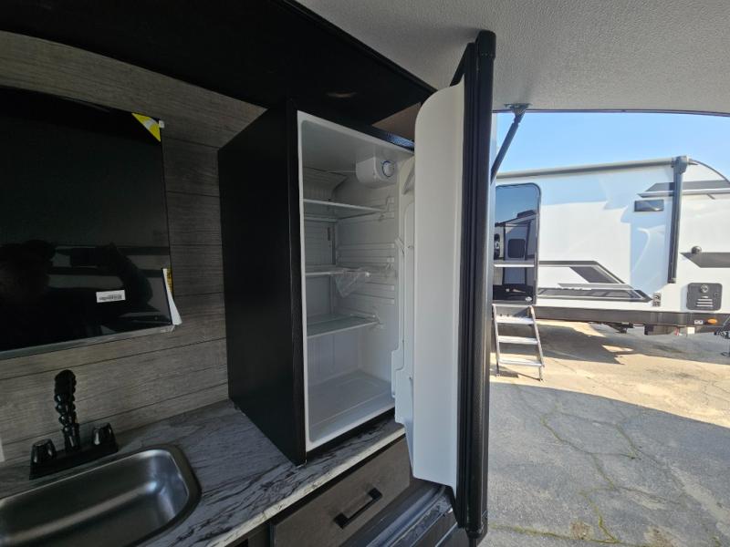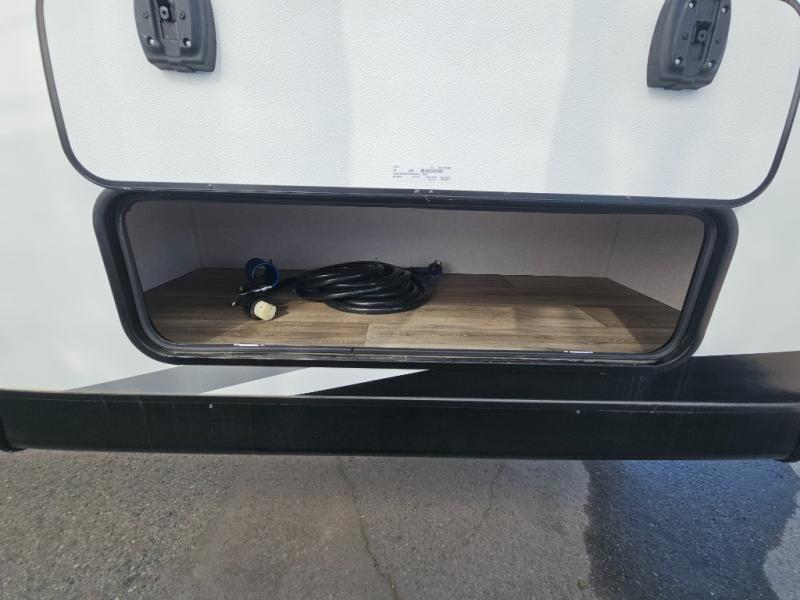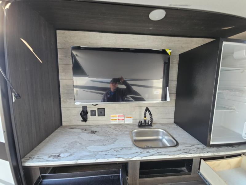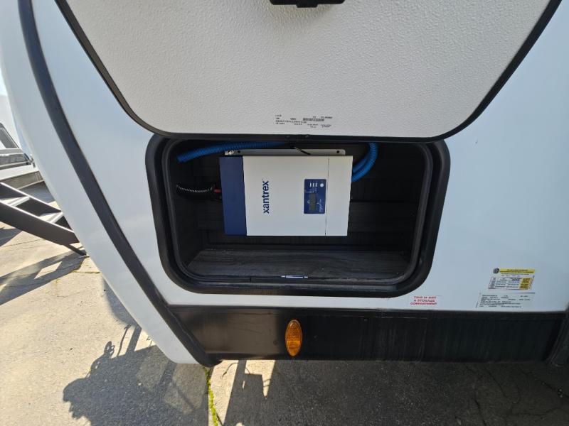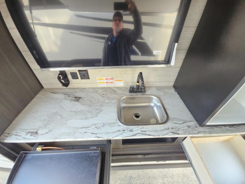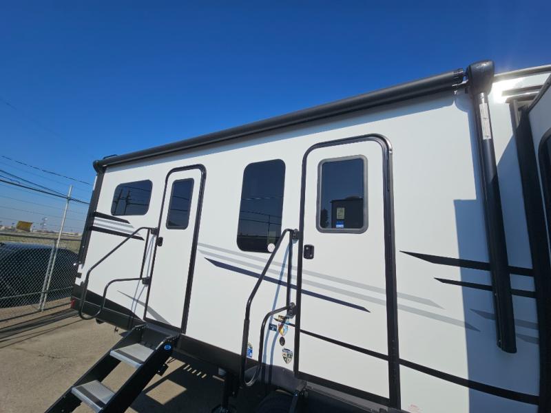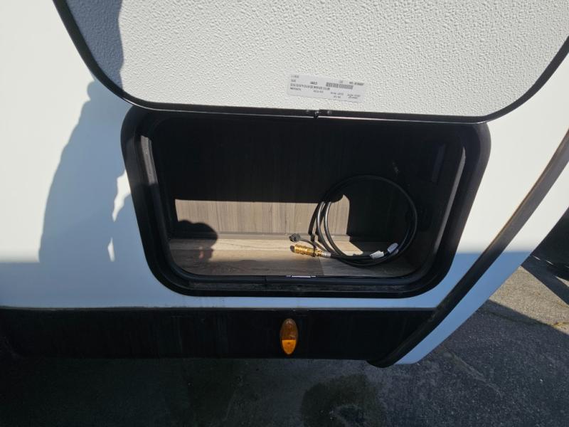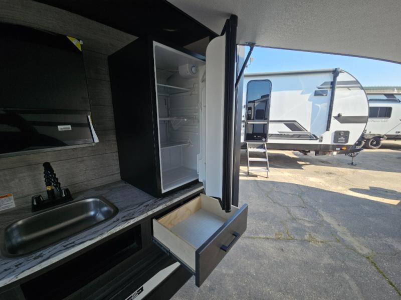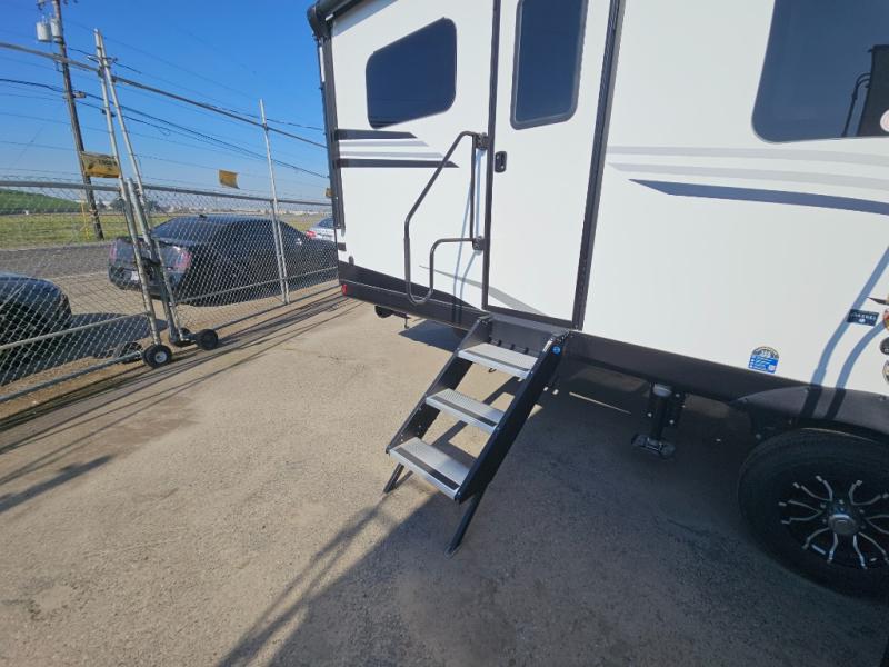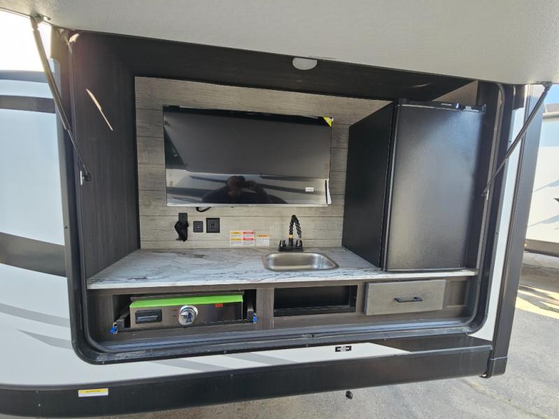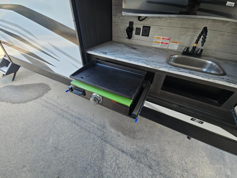 Come see all that this travel trailer has to offer! Relax in true comfort in the front living area with a 70" tri-fold sofa with end tables on either side or in the theater seating across from the entertainment center with a TV and 30" frameless fireplace. The kitchen island will make your meal prepping easier and you can enjoy them at the table and chairs then play a card game or two. You could even cook your meals at the exterior campfire café with a refrigerator, a sink with countertop space, and a griddle. The full bathroom has a 30" x 36" shower for you to freshen up in each morning. Enjoy a good night's rest each night on the 70" x 80" sleep tight king bed slide across from a dresser with a 30" frameless fireplace in the rear private bedroom, plus there is a wardrobe with washer and dryer prep and one of the dual entry doors with triple pull-out aluminum steps!