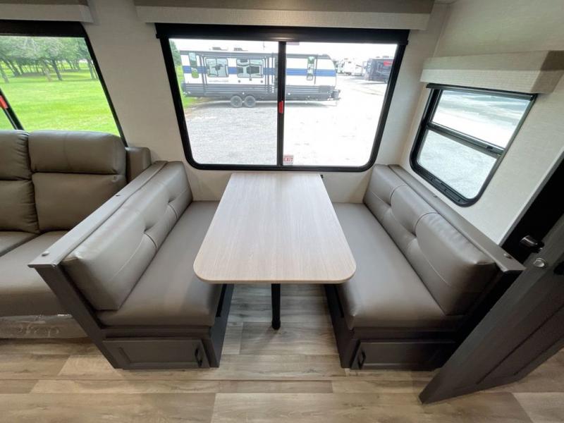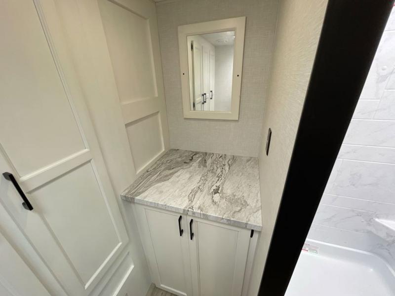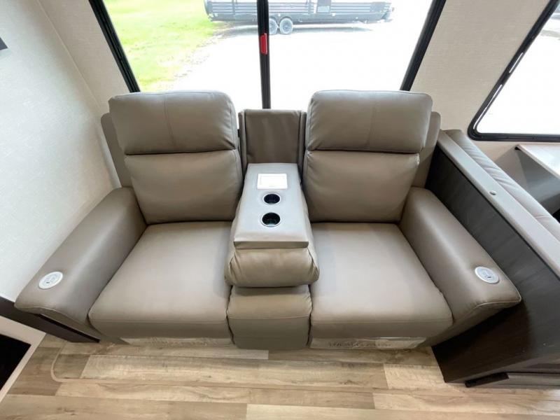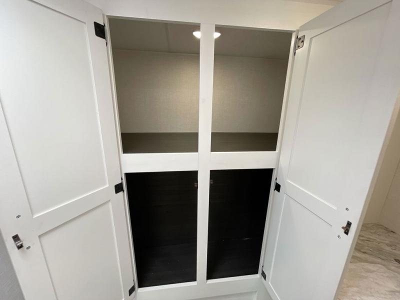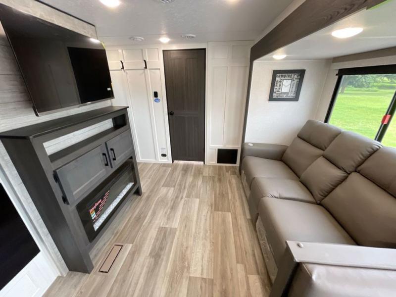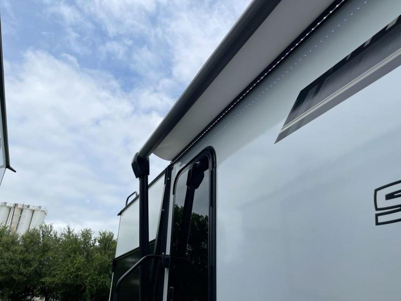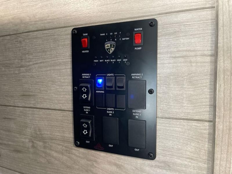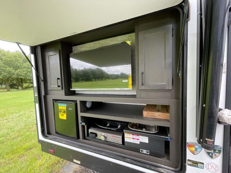 You're going to feel right at home in this Stratus single slide unit! There is not only a fully equipped kitchen with a three burner cooktop, but also an outside campfire café with a griddle, refrigerator, sink, and even an exterior 40" TV for your entertainment. As you enter the unit, you will notice to the right a walk-in pantry with coat hooks, and to the left is the full rear bathroom with a 30" x 36" shower, a three door linen closet, and a cabinet prepped to add an optional washer and dryer. If mother nature rains on your parade then relax inside on either the 70" sofa or the sit n' slide table dinette across from the entertainment center.
