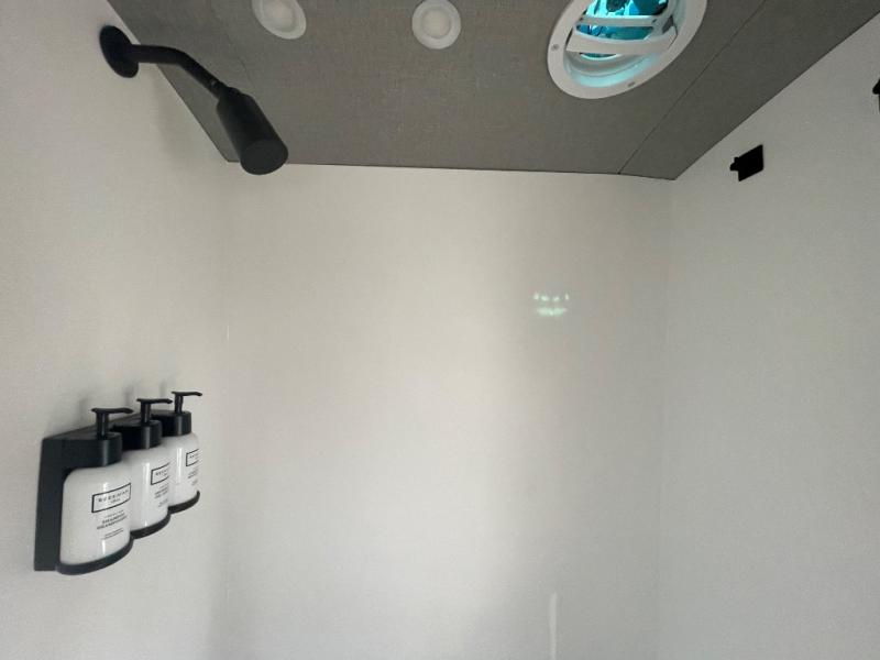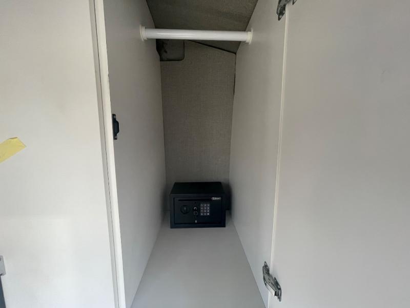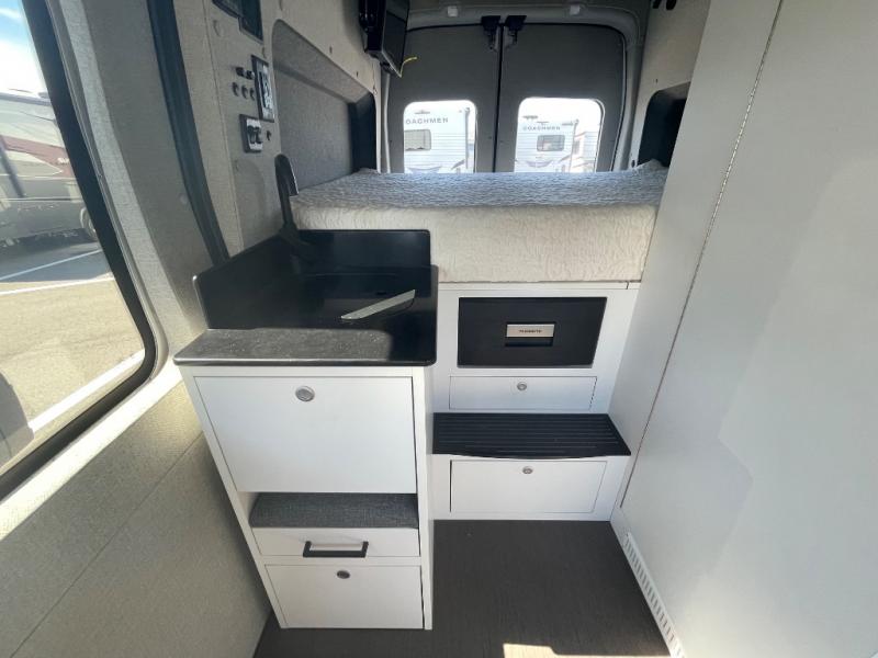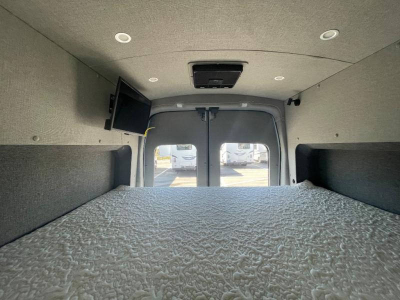 This camper van is perfect for two looking to start their van life or just enjoy weekend trips to the lake. The rear bed includes a 24" TV with a swivel mount so you can watch shows in bed, and there are storage drawers in the bedroom wall to keep your things organized. A wet bath includes a bath mirror, toilet paper holder, Eco Eclipse dispenser system, and more features that will allow you to easily clean up each day. You can make meals using the rear kitchen set up on the cooktop with a bamboo top, and there is a drawer refrigerator to keep food fresh.