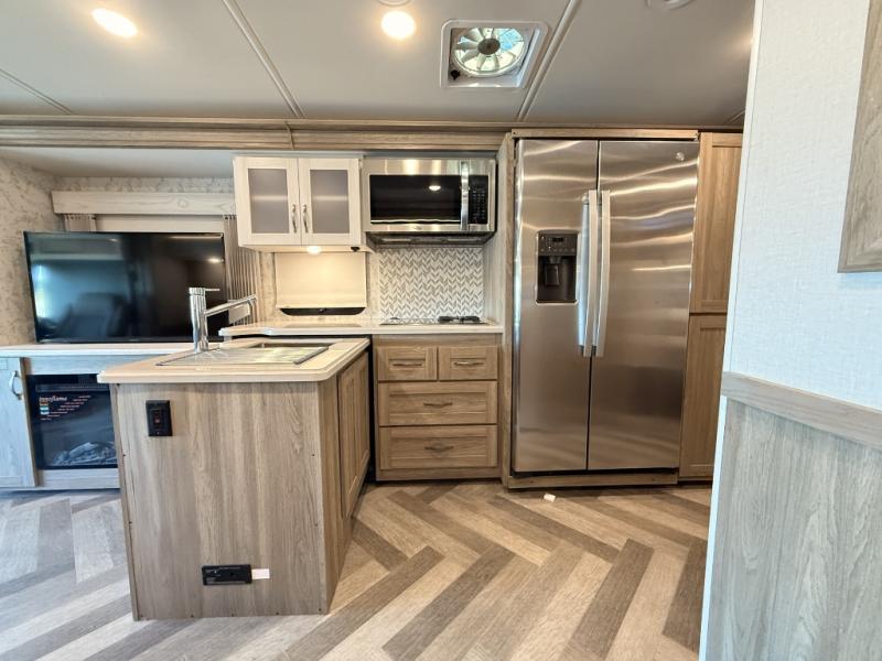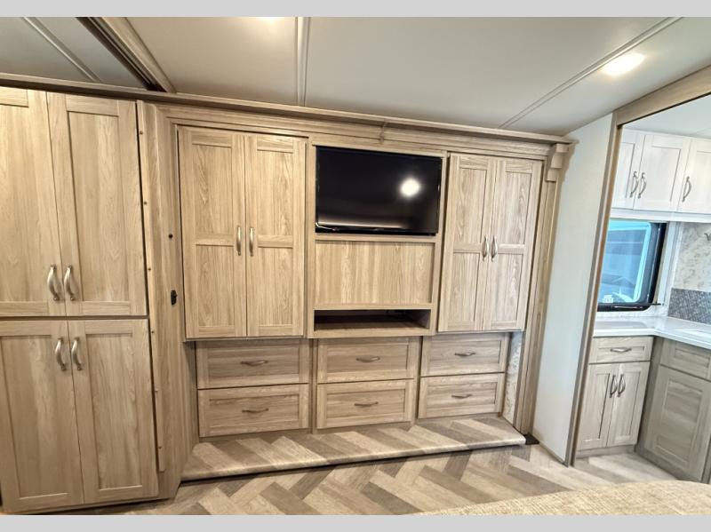 This Adventurer Class A gas motorhome is the perfect home on wheels for your next big adventure. The full-wall slide along with two additional slides provide an open and inviting space to stretch out. While the chef of the family is preparing dinner on the gas/induction range top, the kids or your guests can play a game at the dinette or watch a show on the retractable TV. Comfortable seating space will be found on the TrueComfort+ Sofa or the BenchMark Dinette, and these areas will convert into the kids' sleeping space at night! This model includes plenty of storage space, including a large bedroom wardrobe plus a pantry that can also be used to add an optional washer and dryer if you choose. Nothing says convenience like a full and half bath, and you'll get just that with this model. Plus, you can add the optional StudioLoft bed for additional sleeping space.
