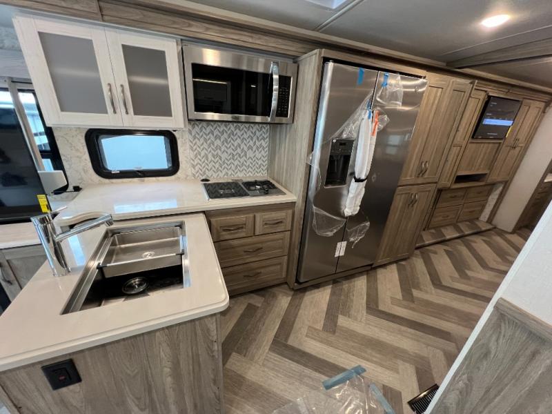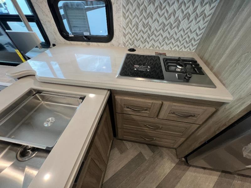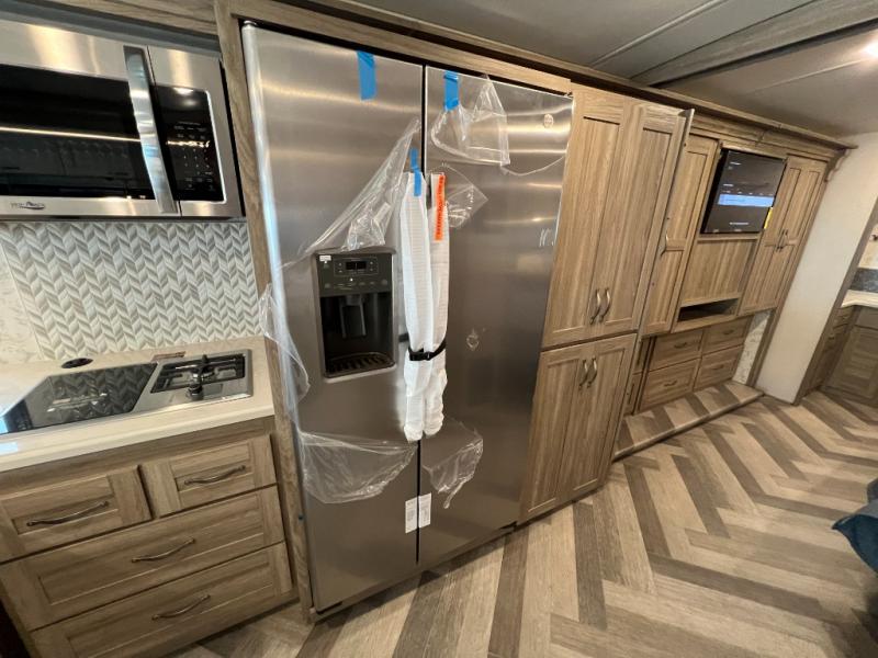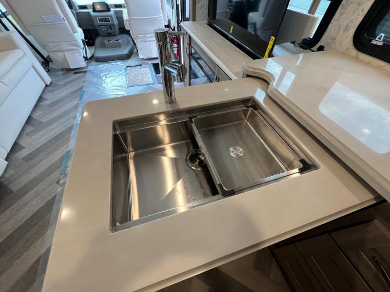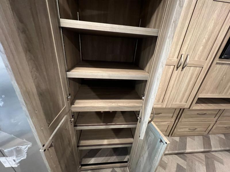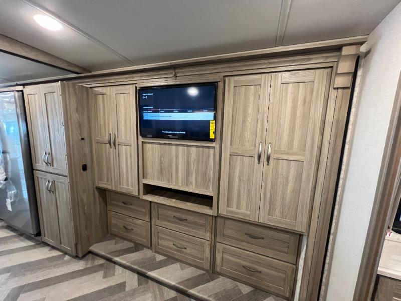 This Adventurer Class A gas motorhome is the perfect home on wheels for your next big adventure. The full-wall slide along with two additional slides provide an open and inviting space to stretch out. While the chef of the family is preparing dinner on the gas/induction range top, the kids or your guests can play a game at the dinette or watch a show on the retractable TV. Comfortable seating space will be found on the TrueComfort+ Sofa or the BenchMark Dinette, and these areas will convert into the kids' sleeping space at night! This model includes plenty of storage space, including a large bedroom wardrobe plus a pantry that can also be used to add an optional washer and dryer if you choose. Nothing says convenience like a full and half bath, and you'll get just that with this model. Plus, you can add the optional StudioLoft bed for additional sleeping space.