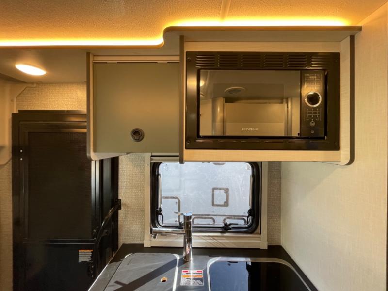 This Ekko all-wheel drive Class C gas motorhome is just unbelievably functional! Not only do you have plenty of storage space for all of your gear with the gear garage, under-bed storage, pantry, and 5.3-cubic foot refrigerator, but you also have a 24" x 30" wet bath with a pivoting lavatory wall so you can stay clean without having to stop at rest areas along the way. The cab area is excellently appointed with a radio/rearview monitor system, swivel/recline cab seats, and many driving safety features. Since the cab seats can swivel, you can use them as another place to sit down and eat at the fold-down table, and you can also use the swivel/adjustable work table for the passenger cab seat or as an extended countertop in the kitchen. Above the dining area is an access point to the optional pop-top sleeping area which would come in handy if you travel with multiple people.