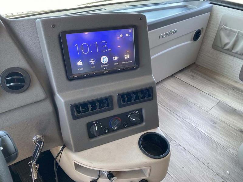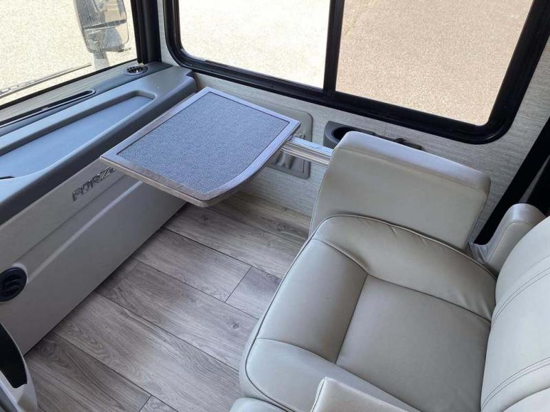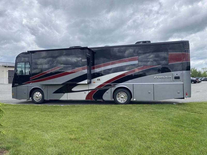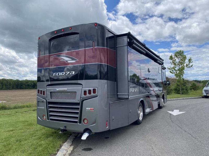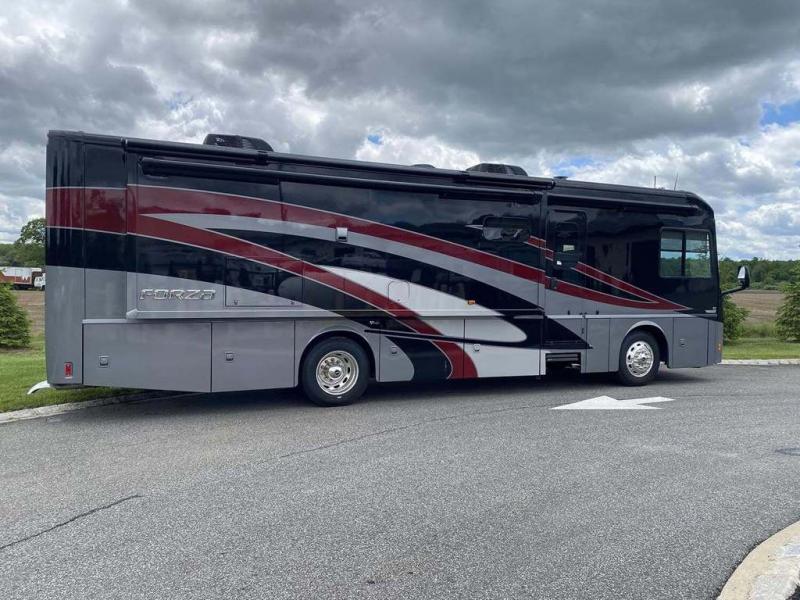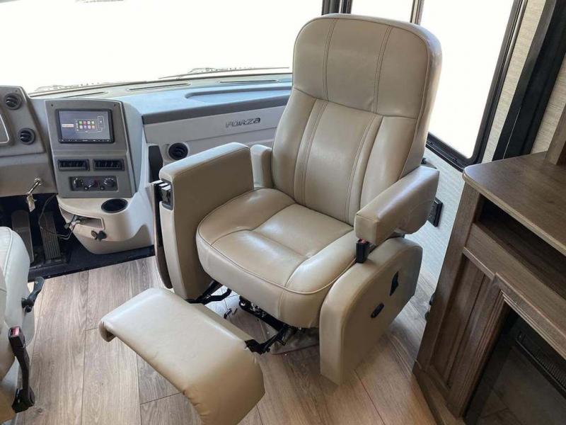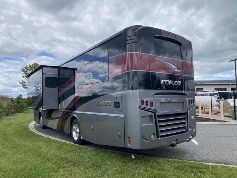 There isn't a thing you won't love about the Winnebago Forza Class A diesel motorhome! These powerful and practical coaches have excellent quality in their construction, and the undercarriage lighting is quite stylish and impressive. You'll find NeWay air suspension with V-Ride, automatic hydraulic leveling jacks, a 10,000-lb. hitch, and automatic entrance steps. Sitting in the cab will be enjoyable with the multi-adjustable swivel and recline seats, the radio/rearview monitor system with 9" LCD color touchscreen, the cellphone interface to radio, and the TRW® tilt/telescopic steering column with foot-actuated pedal. The interior has a Firefly switch panel that lights up when it's dark, and the 6,000W gas generator is what you need to power your coach. You will also find vinyl flooring throughout, blackout roller shades, Corian countertops, a textured glass shower door, and many more comforts you'd expect to find at home!