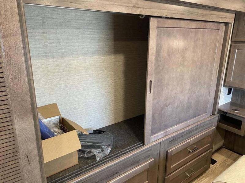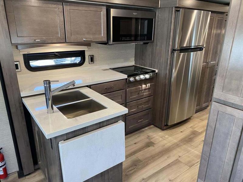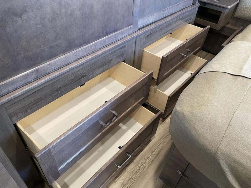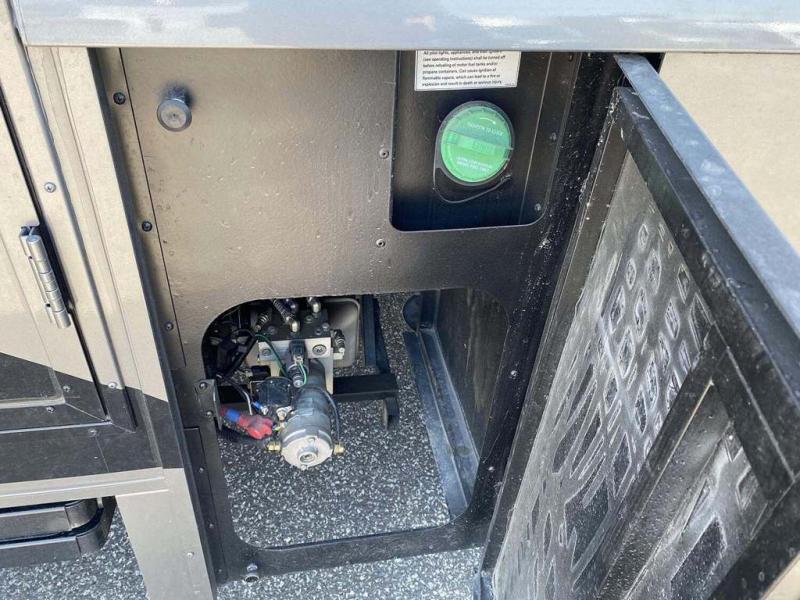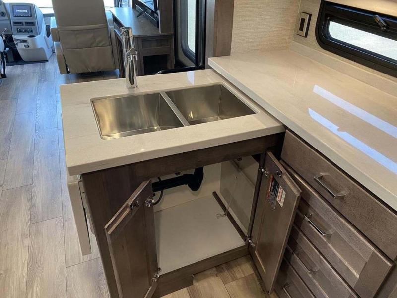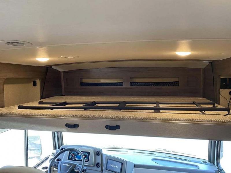 With this Forza Class A diesel motorhome, you won't even need to plan a destination because this coach is the only getaway you need! You could park it in your backyard and still feel as if you've gone away on a retreat. The interior has great accommodations with its BenchMark dinette, theater seating, and swivel/recline cab seats, and the large slide provides extra space for you to spread out and relax. The kitchen is fully equipped with the best tools, and the flip-up countertop extension is going to be helpful for providing extra counter space when it is pulled out into place. You will find another large slide that carries over from the kitchen into the bedroom, and the bedroom even has its very own 32" HDTV so that you can watch your favorite shows while lying down on the king-size bed. You can also choose the optional Studio Loft drop-down bed on this model if you are needing more sleeping space!
