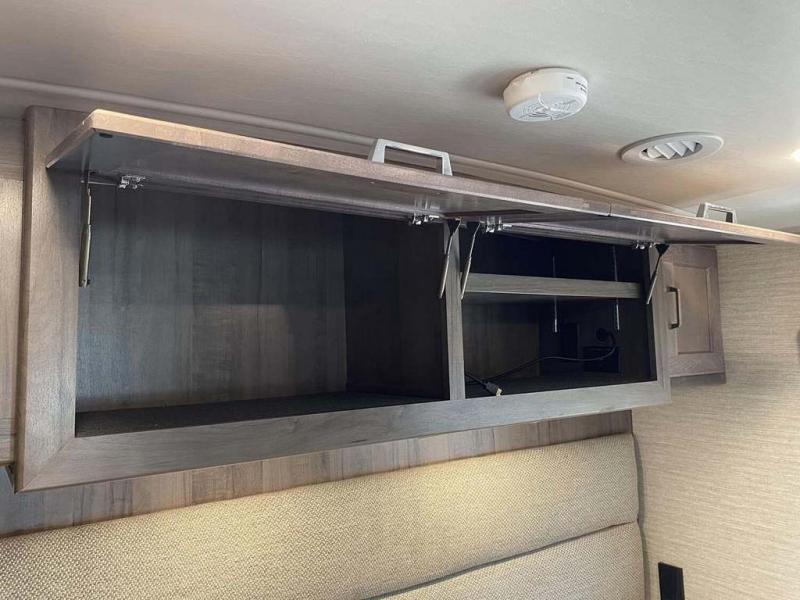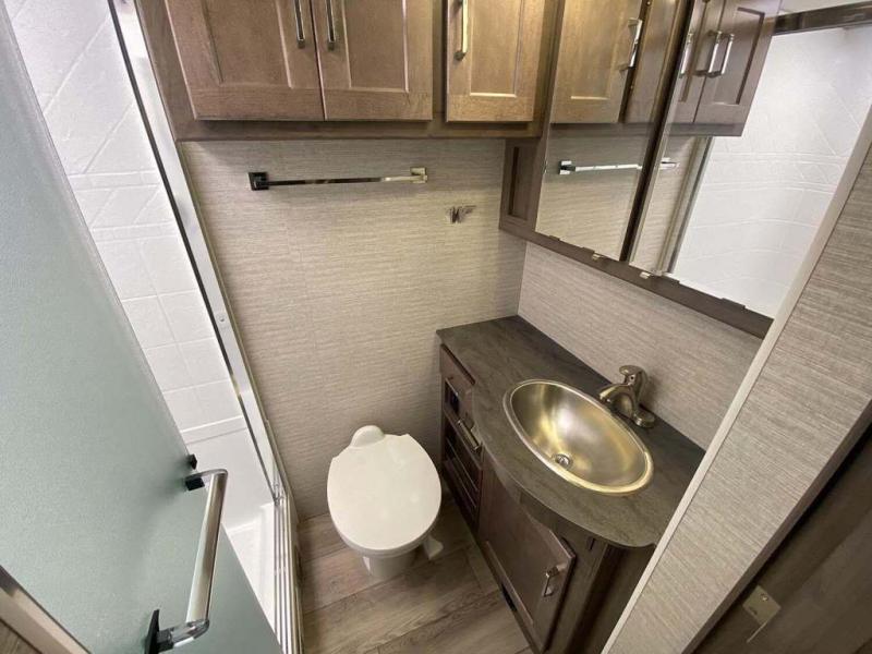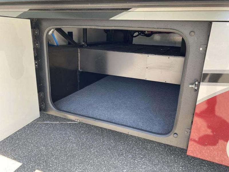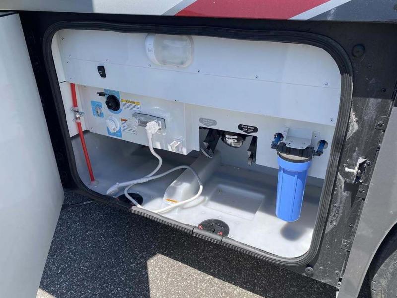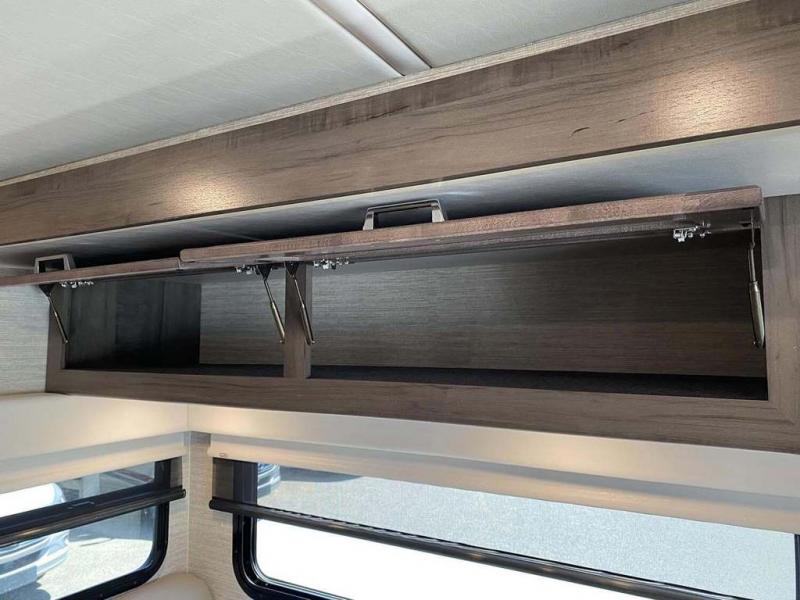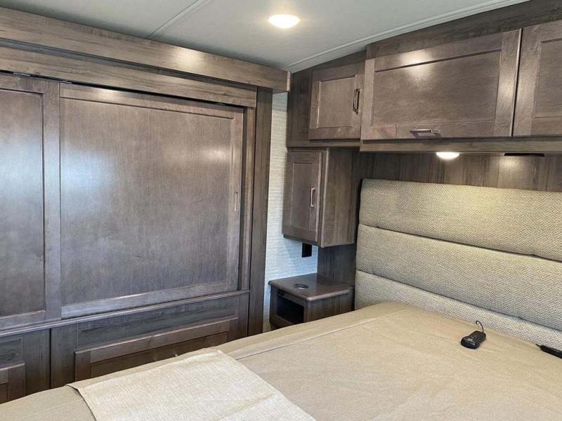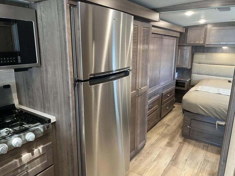 With this Forza Class A diesel motorhome, you won't even need to plan a destination because this coach is the only getaway you need! You could park it in your backyard and still feel as if you've gone away on a retreat. The interior has great accommodations with its BenchMark dinette, theater seating, and swivel/recline cab seats, and the large slide provides extra space for you to spread out and relax. The kitchen is fully equipped with the best tools, and the flip-up countertop extension is going to be helpful for providing extra counter space when it is pulled out into place. You will find another large slide that carries over from the kitchen into the bedroom, and the bedroom even has its very own 32" HDTV so that you can watch your favorite shows while lying down on the king-size bed. You can also choose the optional Studio Loft drop-down bed on this model if you are needing more sleeping space!