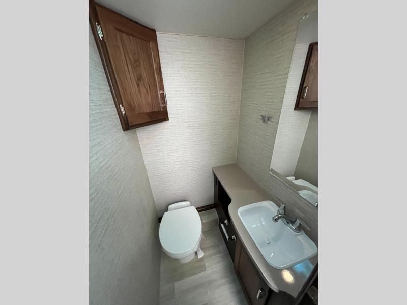 You won't want to travel any other way once you step inside this motorhome! It features a rear private bedroom with a 60" x 80" queen bed that has wardrobes on either side and 24" HDTV for entertainment. The separated bathroom makes it easy for one person to freshen up in the 26" x 30" shower with a skylight while another uses the private toilet and sink. A sliding door closes off the bathroom from the kitchen area which has a three burner range with glass cover and oven and a two way large double door 8 cu. ft. refrigerator/freezer with woodgrain paneling to store your perishables. Enjoy your meals at the 45" x 82" U-shaped dinette then relax on the 40" x 60" sofa bed which can be switched out for either the optional theater seating or optional 58" x 74" TrueComfort sofa. You even have a 57" x 95" bunk over cab for sleeping or storage space!