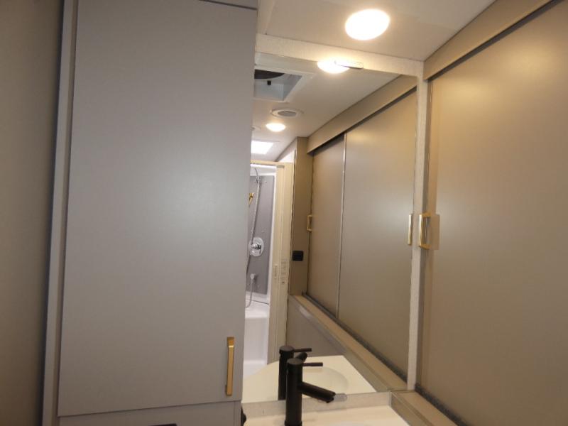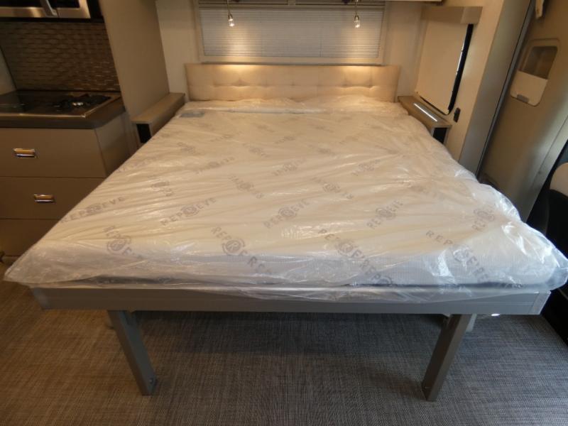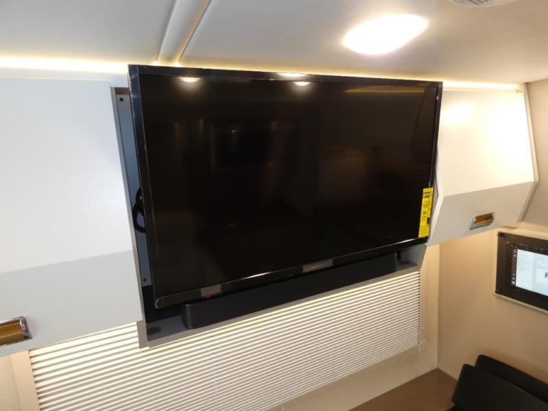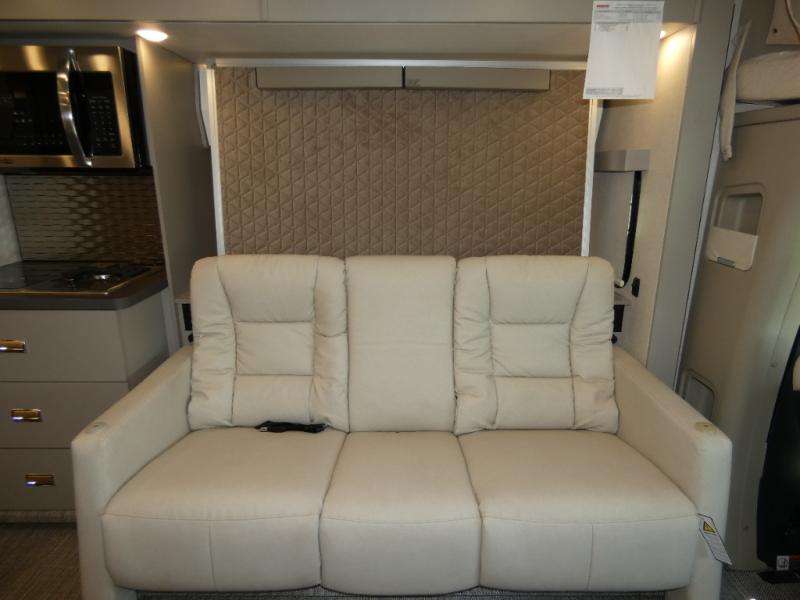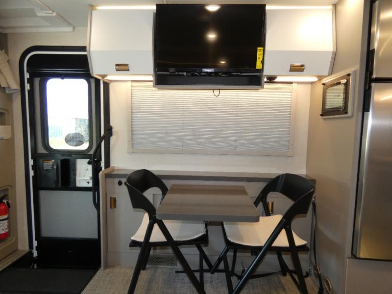The perfect couples coach or for a family of three or four! This versatile Murphy bed unit will offer you sleeping space when you need it, then a comfortable living area during the day with plenty of seating all while keeping your same coach length. You will be able to easily set up the queen Murphy+ bed when it's time for bedtime while the kids or your guests sleep on the 49" x 75" cabover bunk. Everyone can get cleaned up in the full bathroom that has a space-saving sliding door and large bath wardrobe along the very rear that features a gear garage below. Create yummy meals and snacks using the kitchen appliances and the flip-up counter, then dine at the fold-down table with chairs, or eat seated on the theater seating with lap tables nearby on either side.