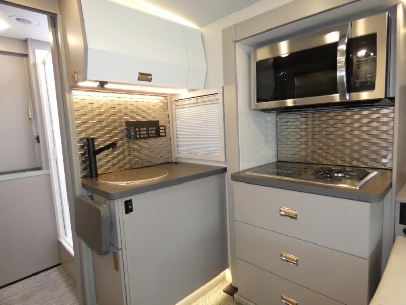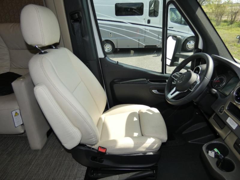 The Winnebago Navion 24T Class C diesel motorhome is functional, innovative, and stylish! You can rule the interstate with the Mercedes-Benz RWD Sprinter chassis. A Lithium Power Package comes with a 320-amp-hour lithium battery and a dedicated second alternator that will allow you to charge the batteries faster while you're on the road. There are also two 120-watt solar panels to keep you going when you're off-grid. Since there is a heated gear garage with L-track cargo tie-downs, you can bring along two full-size bikes and additional gear for hiking, plus there are 110V/12V charging ports and LED lighting here for added convenience. The contemporary interior features blackout roller shades for the lounge and dining area, woven vinyl flooring throughout, and dimmable LED lighting. There is also a Winnebago Connect that is integrated into your Winnebago app that acts as your RV companion. Now you can stay informed on vehicle system alerts, travel prep resources, energy management, and more!