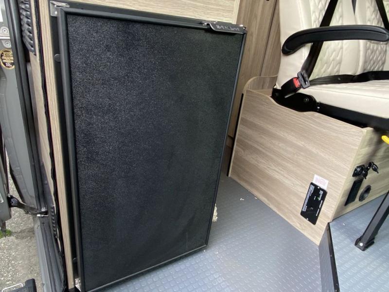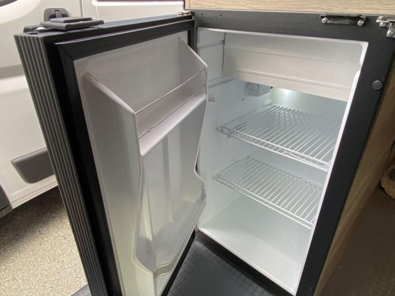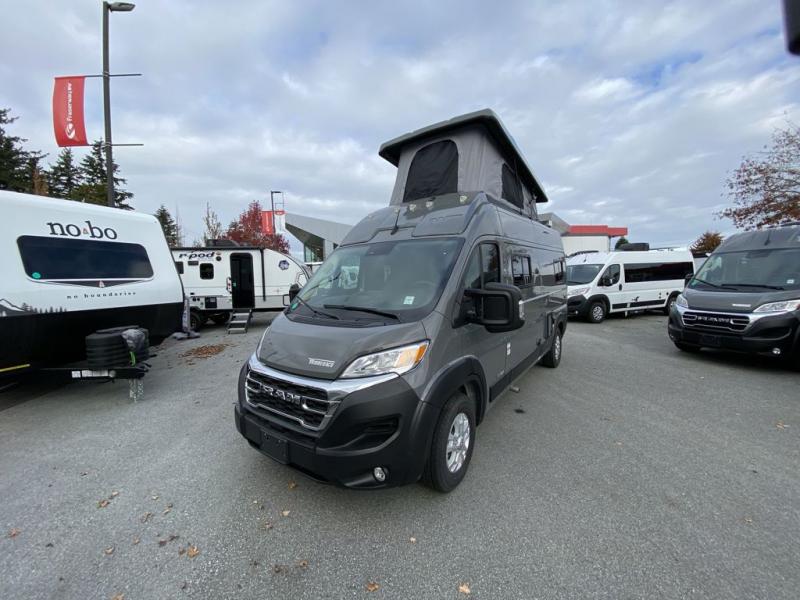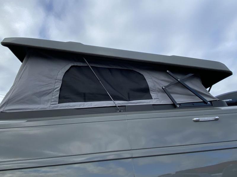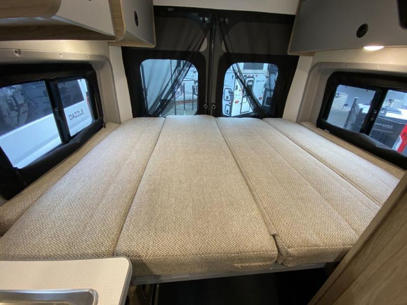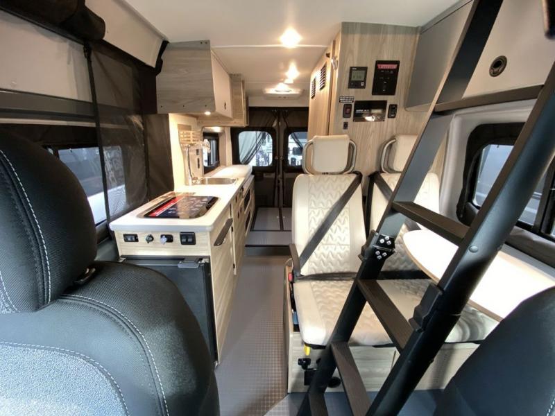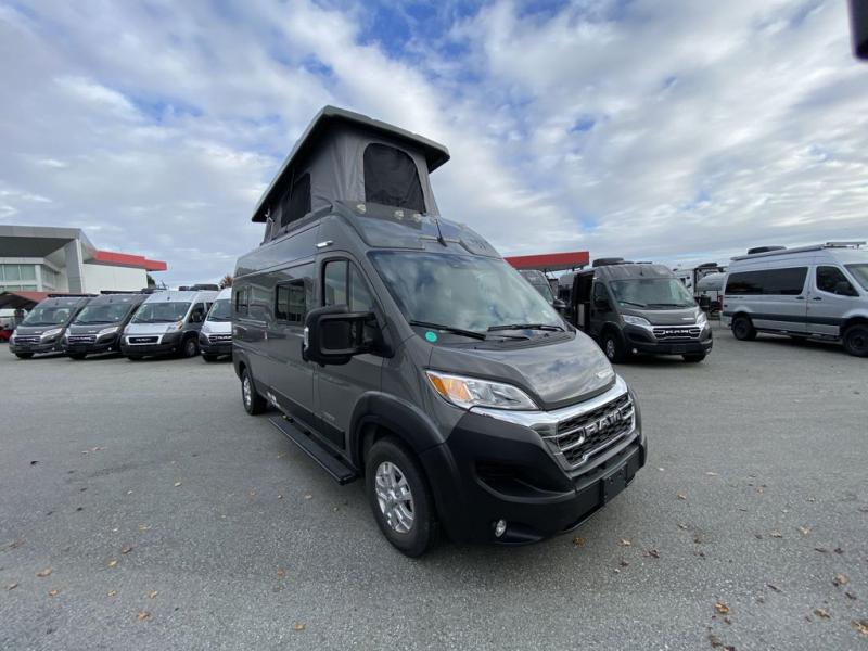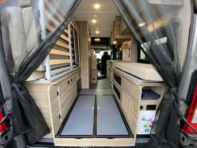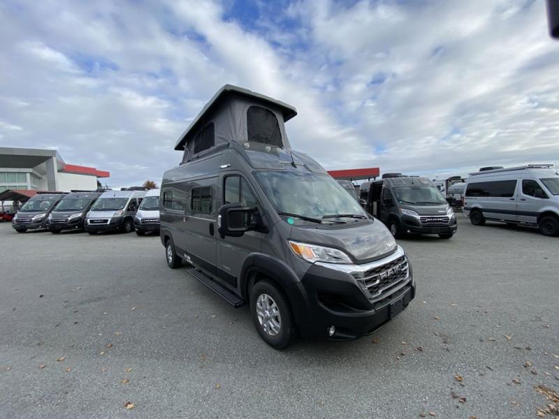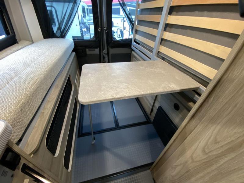 Enjoy a weekend ride in the mountains or make it an overnight stay with versatile sleeping options in this camper van. You'll find the Murphy+ bed in the back will provide a great night's rest, or you can choose the optional sofa/bed with added belted seating if you have more tag-alongs. And of course the little ones will love the pop-top sleeping area to climb into each night. After you've freshened up in the convenient wet bath, prepare breakfast on the two burner range, and the milk and eggs can go back in the 3.0 cu. ft. single door refrigerator/freezer. This model also includes rear double doors with screens to let the breeze in and keep bugs out!