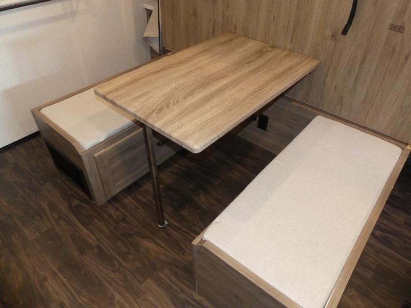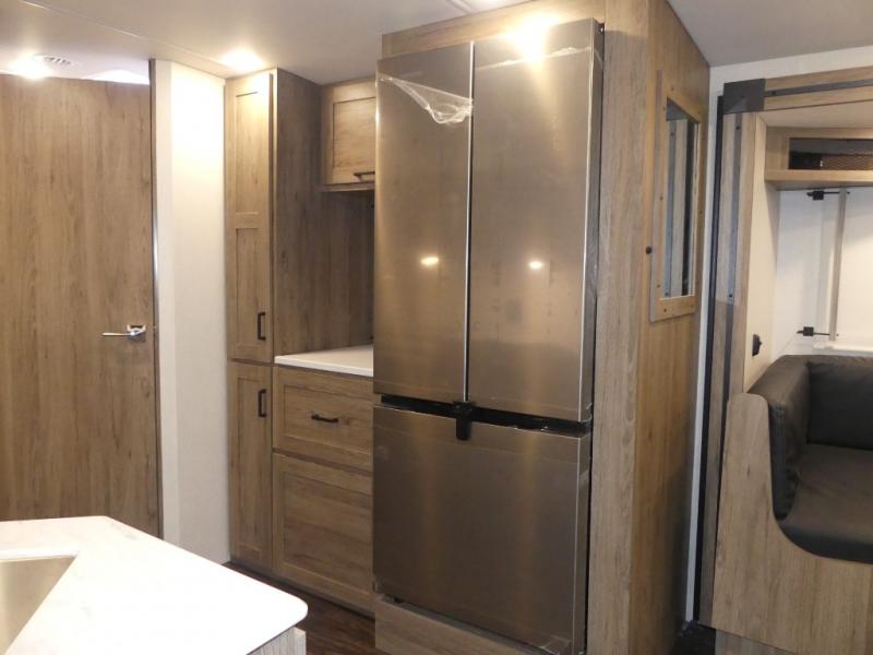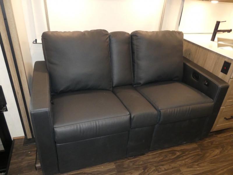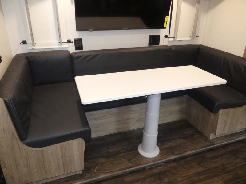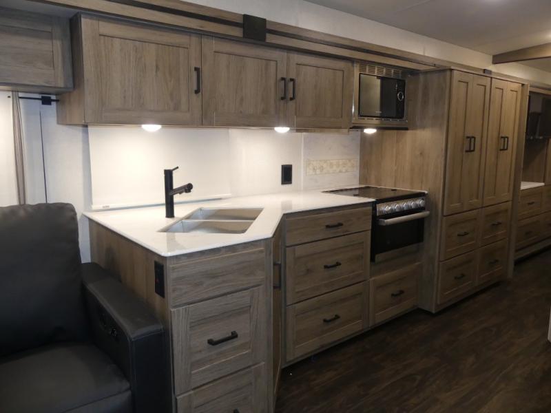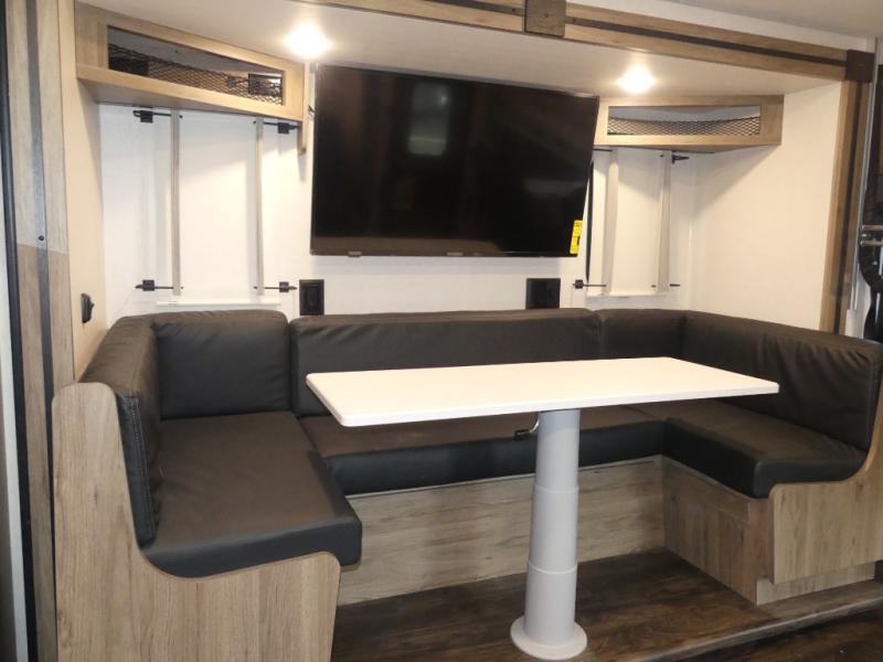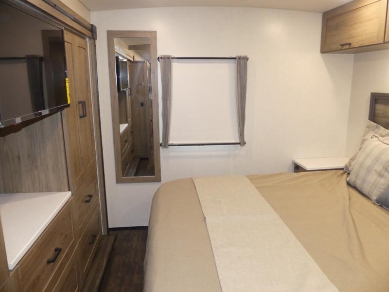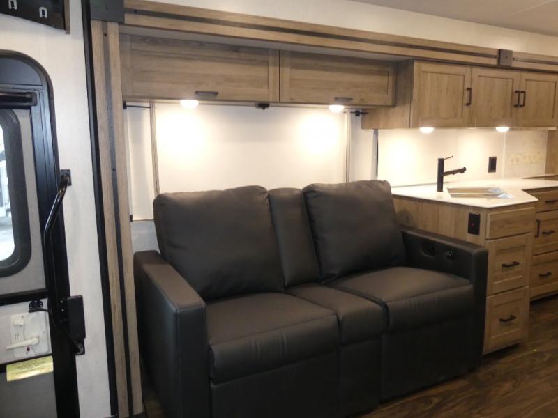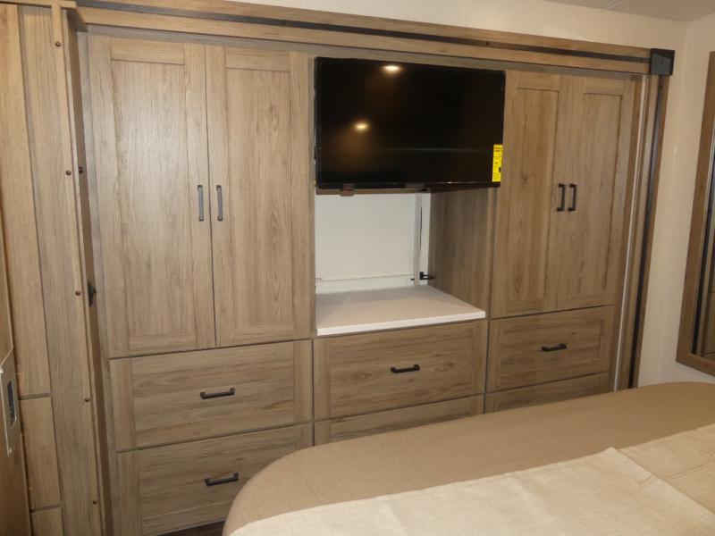 One look at this versatile coach and you'll be hooked! The rear bedroom includes a king Murphy bed with a dinette workstation you can utilize when the bed is folded up for the day. You'll also find dual bedroom wardrobes and a dresser plus easy access to the dual entry bath. The full-wall slide and second slide will open up your space to be able to move about freely, and you'll find seating space on the sofa/bed and U-shaped dinette. The chef of your group will love the full kitchen with a large pantry with exterior storage access, a three burner range, and plenty of counter space to prep meals. Your guests can sleep on the furniture at night!
