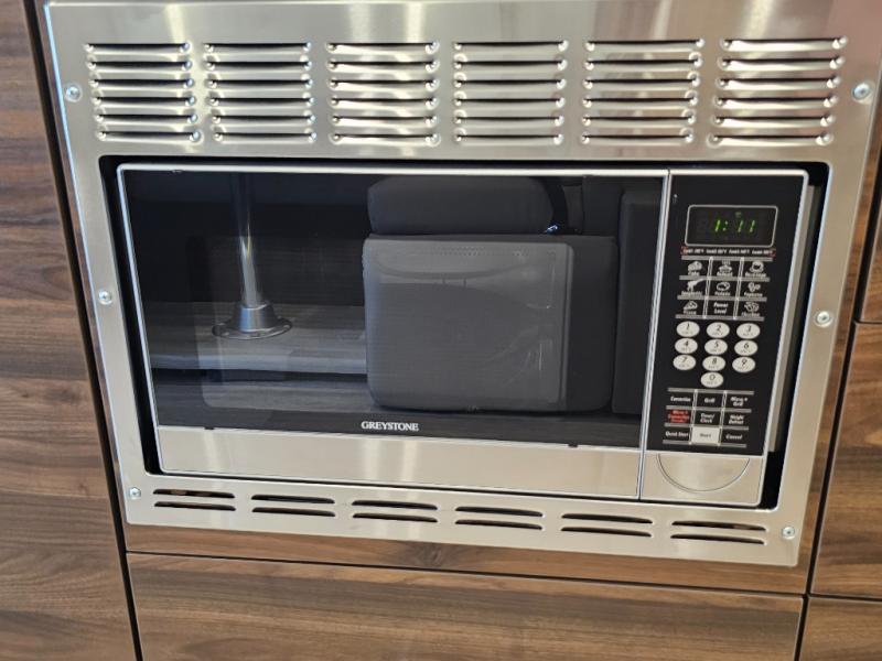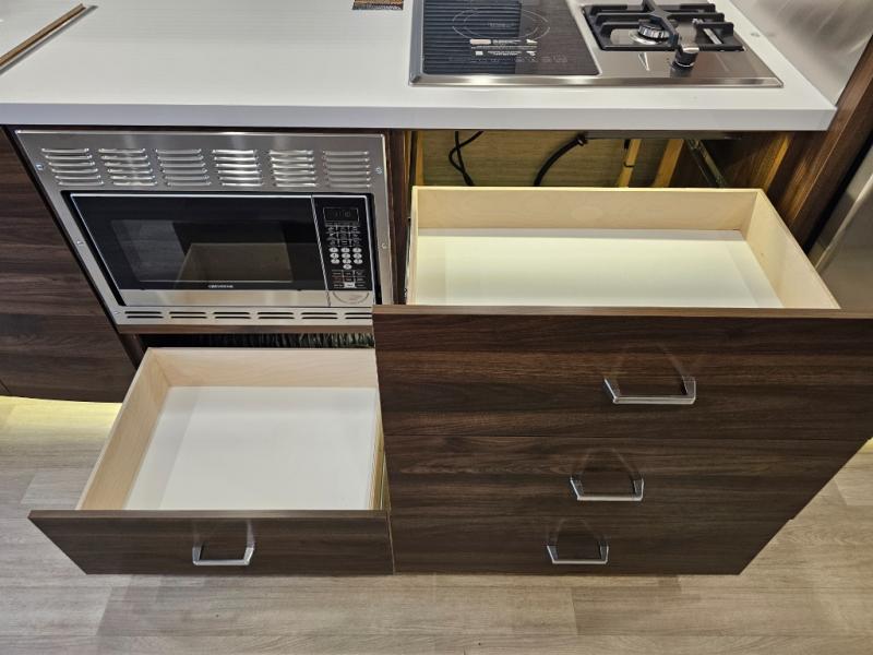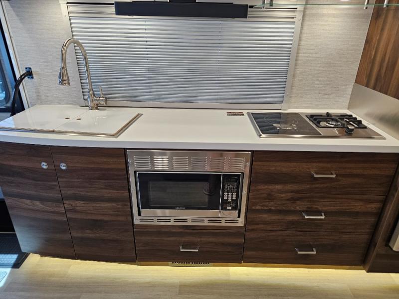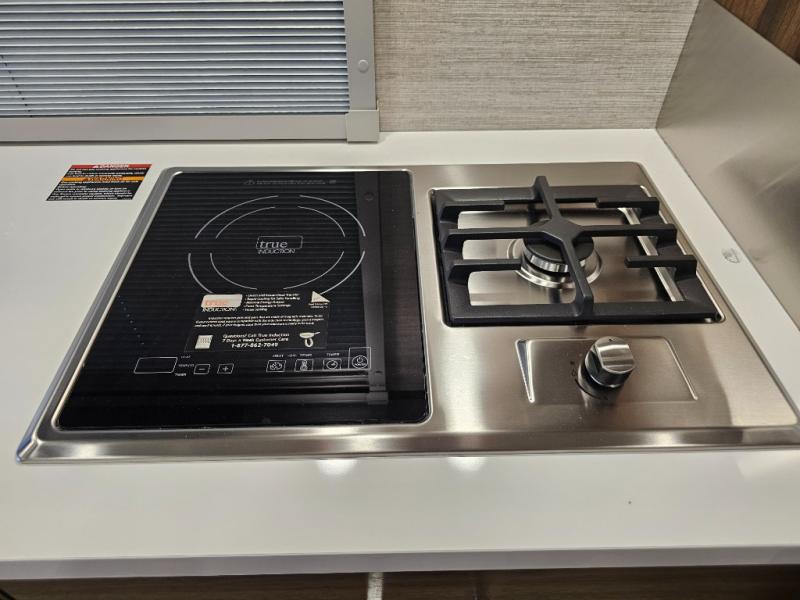 Fully equipped galley kitchen with convection microwave/oven, two-burner cooktop, and refrigerator