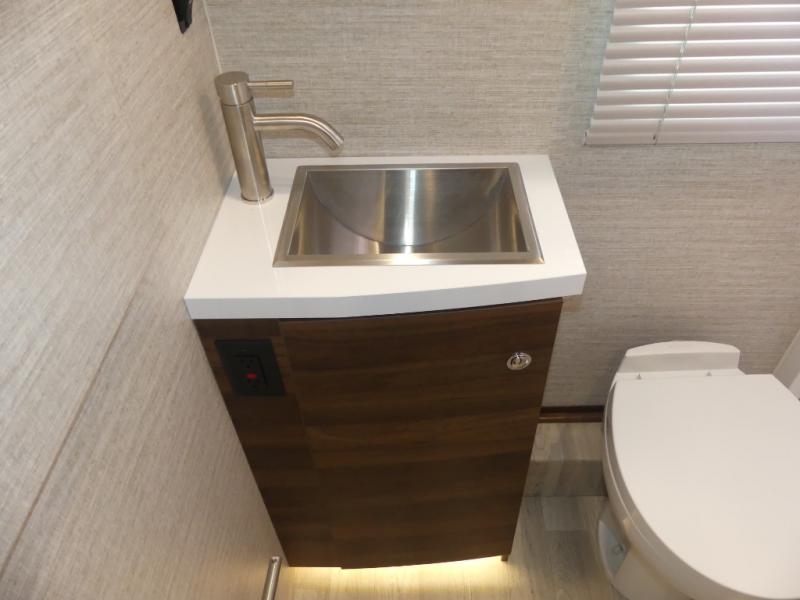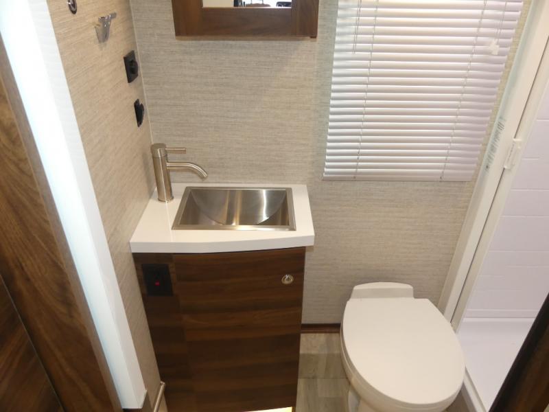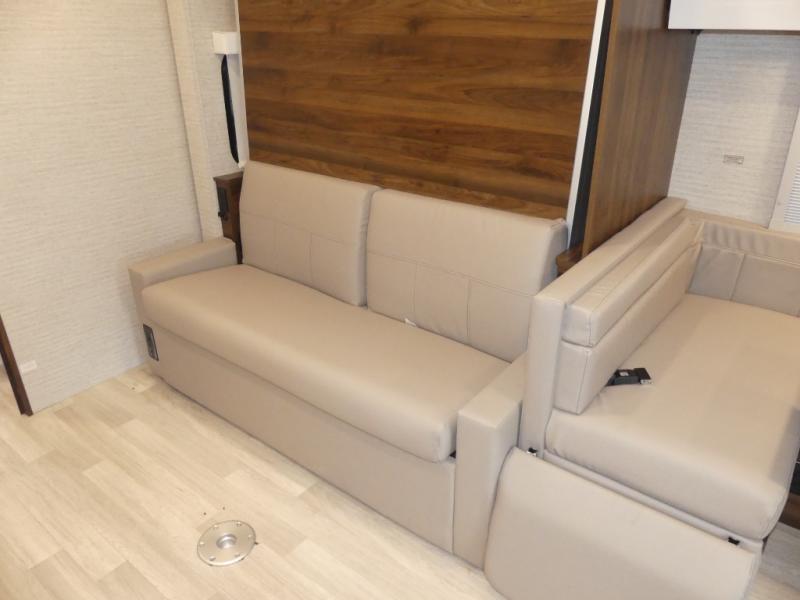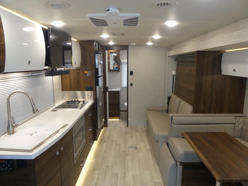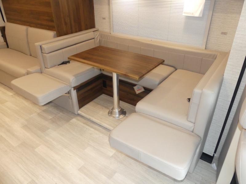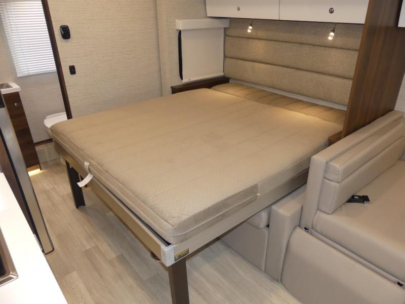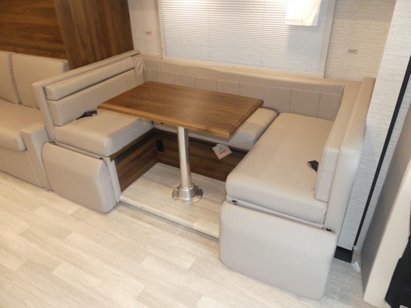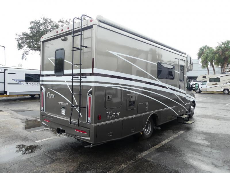 A couple or family will enjoy the look of the interior each time they take this View Class C diesel motorhome on the road. You will be able to easily set up the queen Murphy+ bed when it's time for bedtime while the kids sleep on the bunk above the cab or the U-shaped dinette. You might like to add the theater seating option with swivel tables if you don't need that extra sleeping space. Everyone can get cleaned up in the full rear bathroom that has a space-saving sliding door before making meals with full kitchen amenities including a convection microwave/oven.