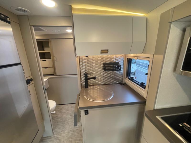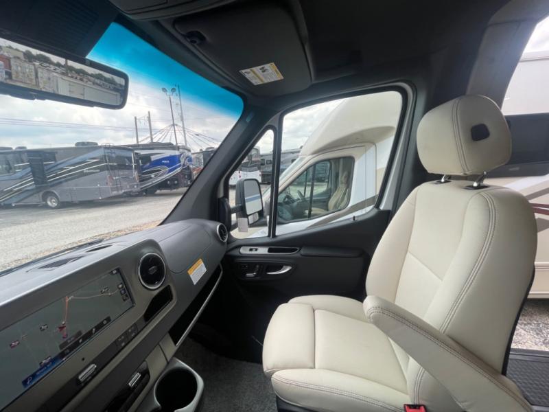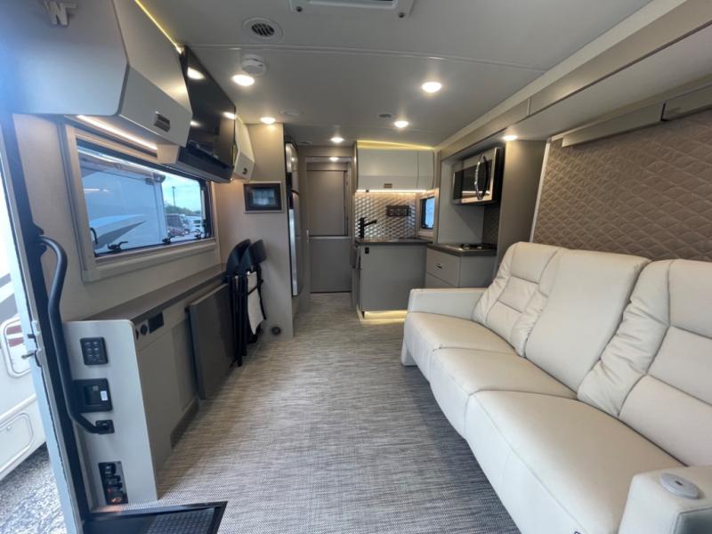The Winnebago View 24T Class C diesel motorhome is functional, innovative, and stylish! You can rule the interstate with the Mercedes-Benz RWD Sprinter chassis, or choose the optional Mercedes-Benz AWD Sprinter chassis to tackle tougher terrain. A Lithium Power Package comes with a 320-amp-hour lithium battery and a dedicated second alternator that will allow you to charge the batteries faster while you're on the road. There are also two 120-watt solar panels to keep you going when you're off-grid. Since there is a heated gear garage with L-track cargo tie-downs, you can bring along two full-size bikes and additional gear for hiking, plus there are 110V/12V charging ports and LED lighting here for added convenience. The contemporary interior features blackout roller shades for the lounge and dining area, woven vinyl flooring throughout, and dimmable LED lighting. There is also a Winnebago Connect that is integrated into your Winnebago app that acts as your RV companion. Now you can stay informed on vehicle system alerts, travel prep resources, energy management, and more!