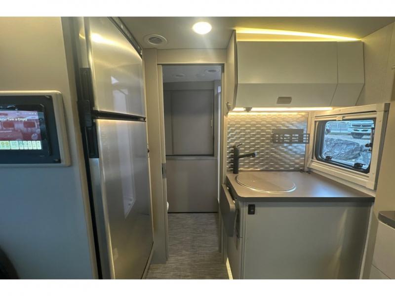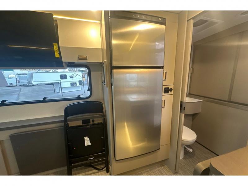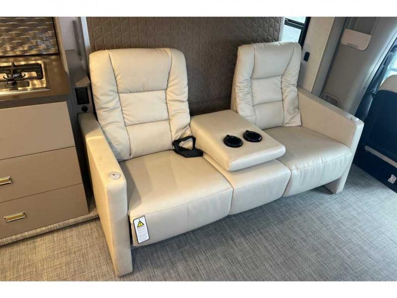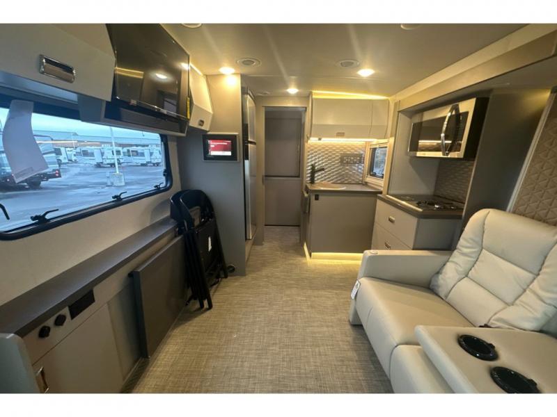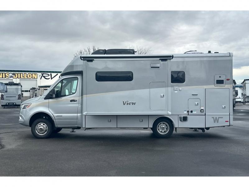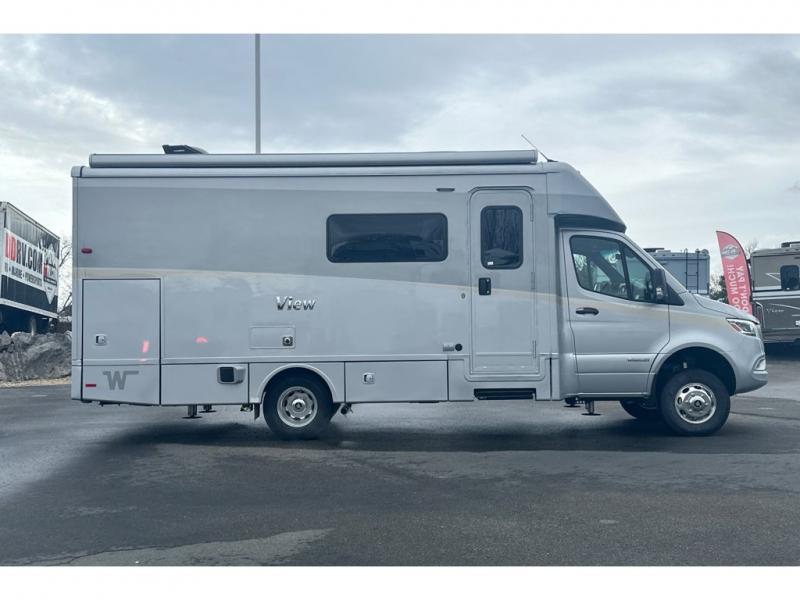 The Winnebago View 24T Class C diesel motorhome is functional, innovative, and stylish! You can rule the interstate with the Mercedes-Benz RWD Sprinter chassis, or choose the optional Mercedes-Benz AWD Sprinter chassis to tackle tougher terrain. A Lithium Power Package comes with a 320-amp-hour lithium battery and a dedicated second alternator that will allow you to charge the batteries faster while you're on the road. There are also two 120-watt solar panels to keep you going when you're off-grid. Since there is a heated gear garage with L-track cargo tie-downs, you can bring along two full-size bikes and additional gear for hiking, plus there are 110V/12V charging ports and LED lighting here for added convenience. The contemporary interior features blackout roller shades for the lounge and dining area, woven vinyl flooring throughout, and dimmable LED lighting. There is also a Winnebago Connect that is integrated into your Winnebago app that acts as your RV companion. Now you can stay informed on vehicle system alerts, travel prep resources, energy management, and more!