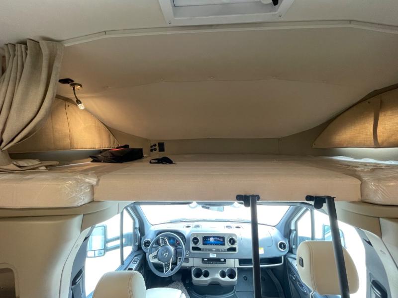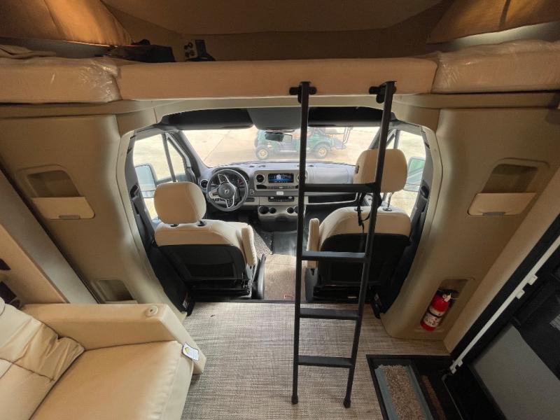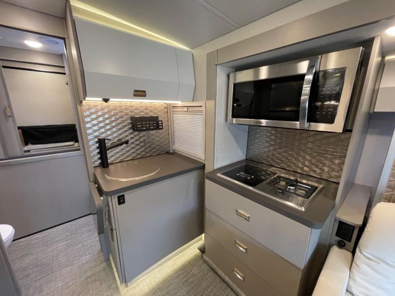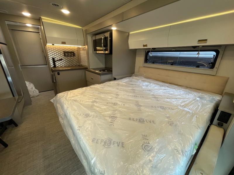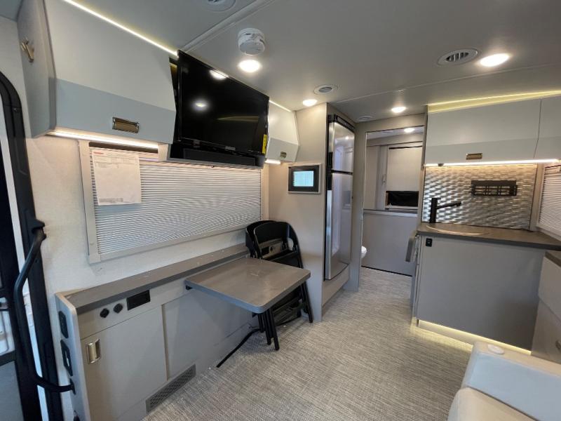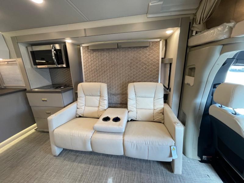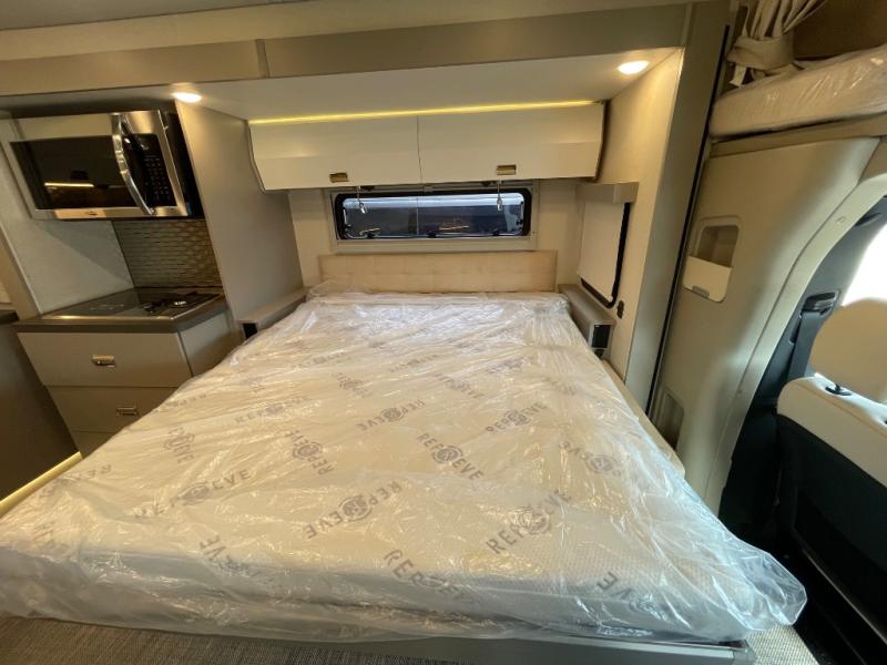 The Winnebago View 24T Class C diesel motorhome is functional, innovative, and stylish! You can rule the interstate with the Mercedes-Benz RWD Sprinter chassis, or choose the optional Mercedes-Benz AWD Sprinter chassis to tackle tougher terrain. A Lithium Power Package comes with a 320-amp-hour lithium battery and a dedicated second alternator that will allow you to charge the batteries faster while you're on the road. There are also two 120-watt solar panels to keep you going when you're off-grid. Since there is a heated gear garage with L-track cargo tie-downs, you can bring along two full-size bikes and additional gear for hiking, plus there are 110V/12V charging ports and LED lighting here for added convenience. The contemporary interior features blackout roller shades for the lounge and dining area, woven vinyl flooring throughout, and dimmable LED lighting. There is also a Winnebago Connect that is integrated into your Winnebago app that acts as your RV companion. Now you can stay informed on vehicle system alerts, travel prep resources, energy management, and more!