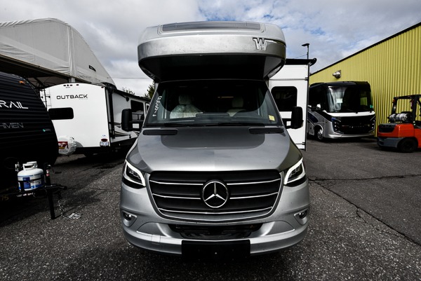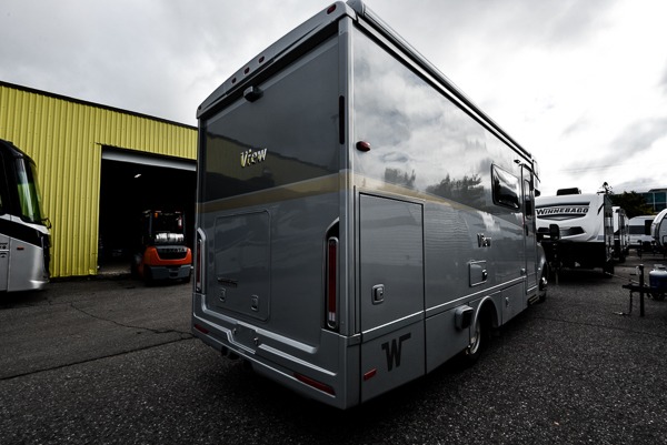 The Winnebago View 24T Class C diesel motorhome is functional, innovative, and stylish! You can rule the interstate with the Mercedes-Benz RWD Sprinter chassis, or choose the optional Mercedes-Benz AWD Sprinter chassis to tackle tougher terrain. A Lithium Power Package comes with a 320-amp-hour lithium battery and a dedicated second alternator that will allow you to charge the batteries faster while you're on the road. There are also two 120-watt solar panels to keep you going when you're off-grid. Since there is a heated gear garage with L-track cargo tie-downs, you can bring along two full-size bikes and additional gear for hiking, plus there are 110V/12V charging ports and LED lighting here for added convenience. The contemporary interior features blackout roller shades for the lounge and dining area, woven vinyl flooring throughout, and dimmable LED lighting. There is also a Winnebago Connect that is integrated into your Winnebago app that acts as your RV companion. Now you can stay informed on vehicle system alerts, travel prep resources, energy management, and more!