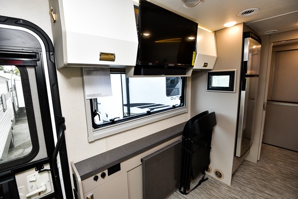 The perfect couples coach or for a family of three or four! You will be able to easily set up the queen Murphy+ bed when it's time for bedtime while the kids or your guests sleep on the 49" x 75" cabover bunk. You can also choose the optional low profile front cap with storage if you do not need the added sleeping space. An optional 3800W RVMP Flex Power generator is also available with this model. Everyone can get cleaned up in the full bathroom that has a space-saving sliding door and large wardrobe along the very rear that features a gear garage below. Create yummy meals and snacks using the kitchen appliances and the flip-up counter, then dine at the fold-down table with chairs, or eat seated on the theater seating with lap tables nearby on either side.