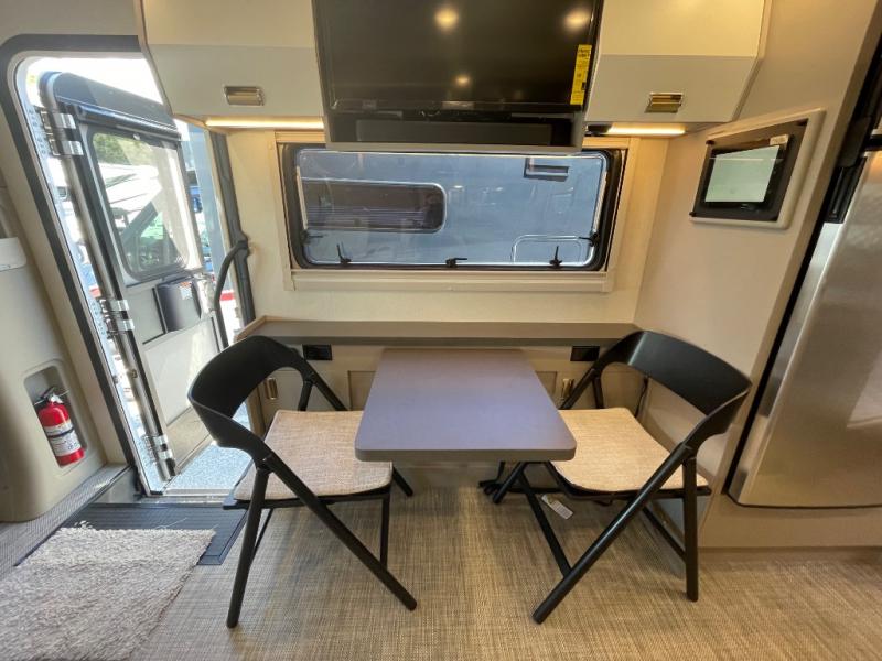 The Winnebago View 24T Class C diesel motorhome is functional, innovative, and stylish! You can rule the interstate with the Mercedes-Benz RWD Sprinter chassis, or choose the optional Mercedes-Benz AWD Sprinter chassis to tackle tougher terrain. A Lithium Power Package comes with a 320-amp-hour lithium battery and a dedicated second alternator that will allow you to charge the batteries faster while you're on the road. There are also two 120-watt solar panels to keep you going when you're off-grid. Since there is a heated gear garage with L-track cargo tie-downs, you can bring along two full-size bikes and additional gear for hiking, plus there are 110V/12V charging ports and LED lighting here for added convenience. The contemporary interior features blackout roller shades for the lounge and dining area, woven vinyl flooring throughout, and dimmable LED lighting. There is also a Winnebago Connect that is integrated into your Winnebago app that acts as your RV companion. Now you can stay informed on vehicle system alerts, travel prep resources, energy management, and more!