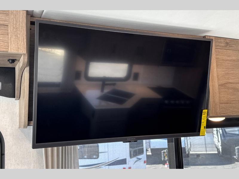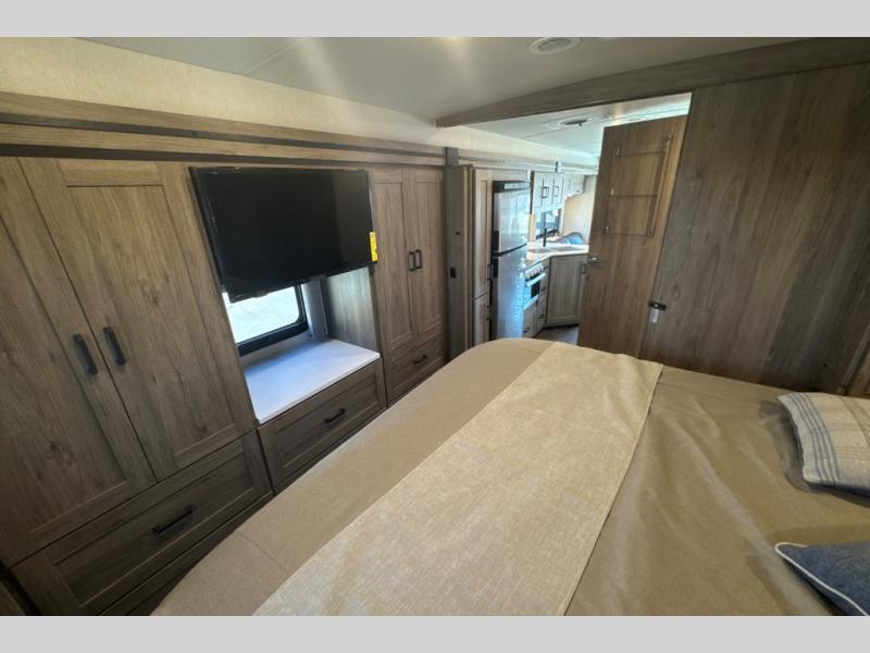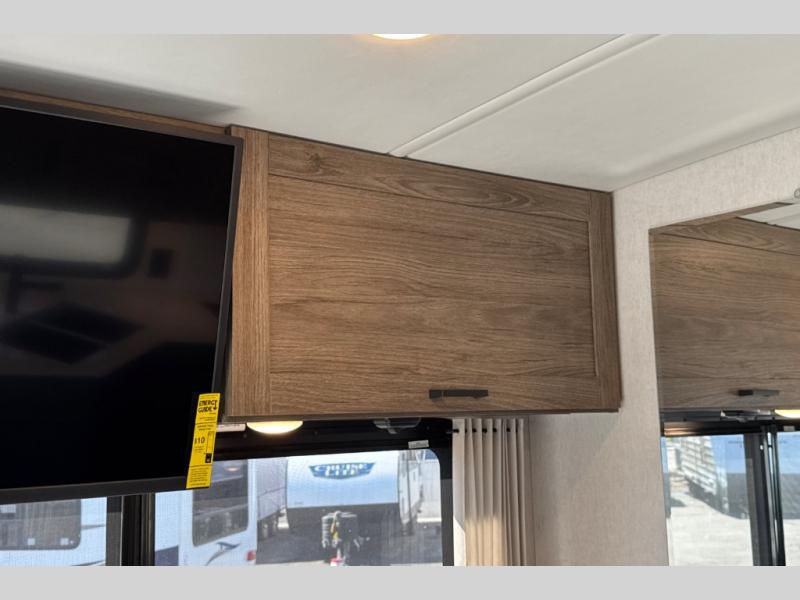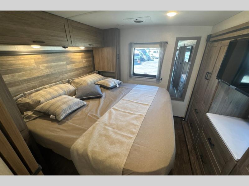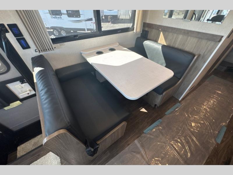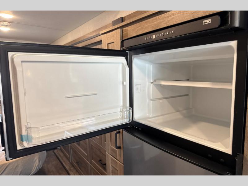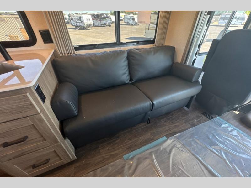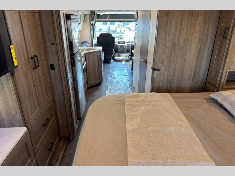 This motorhome will be your home away from home! It features a rear private bedroom with a 72" x 75" king bed across from one end of the full wall slide that spans the entire length of the unit. In the bedroom portion of the slide you will find two wardrobes with storage between and a space where you can add an optional TV. Start and end your days getting clean in the full bath including a 26" x 38" shower, large vanity with sink, and toilet. Cooking will be easy with the indoor and outdoor spaces. Inside, find a stainless steel 2-door 10 cu. ft. refrigerator for your perishables and a pantry for everyone's favorite snacks. The 42" x 70" dinette with Hi-Lo table comes with storage to keep your games close, and the 40" x 66" sofa bed can be switched out for optional theater seating to relax in true comfort while you watch your favorite movies if you like. You can also add an optional StudioLoft powered 50" x 80" bed above the swivel cab seats for added sleeping space for one or two more guests. This model also includes the Tailgate Package with LP quick-connect, a stainless steel sink, a paper towel holder, a refrigerator, plus more!