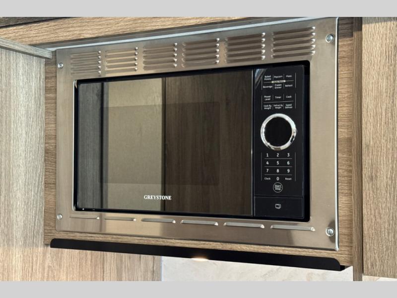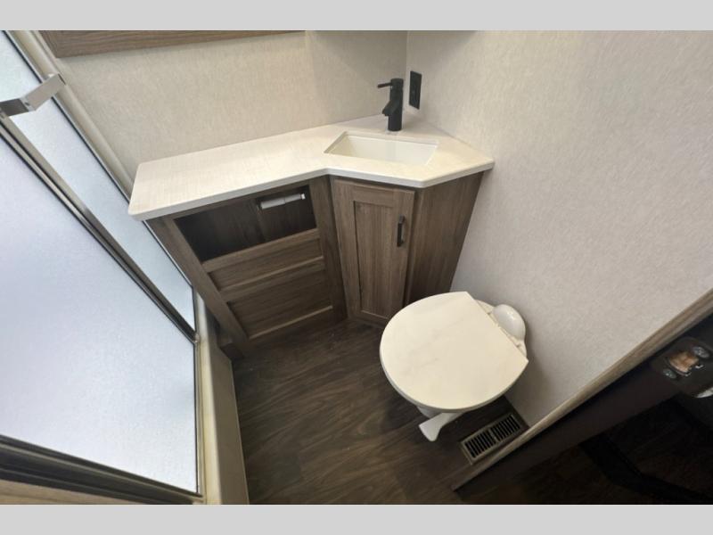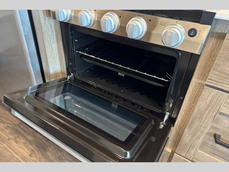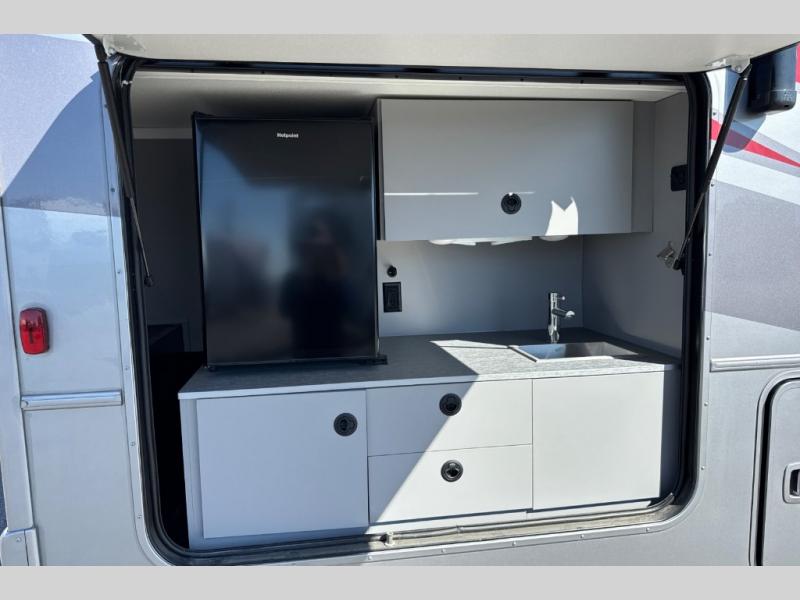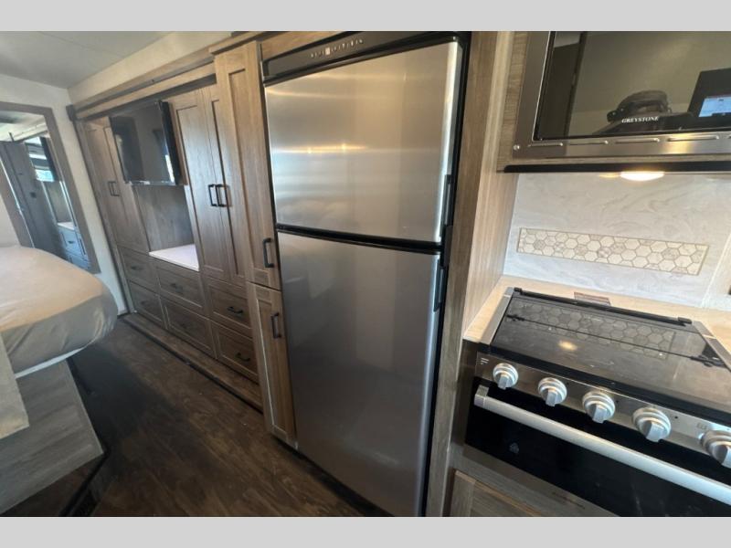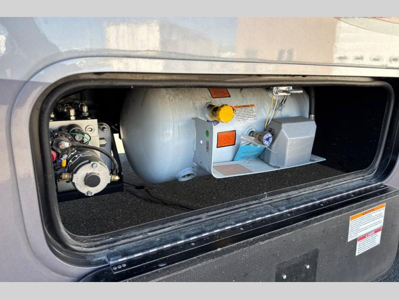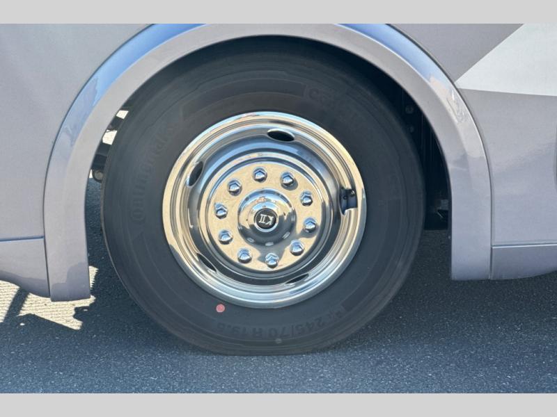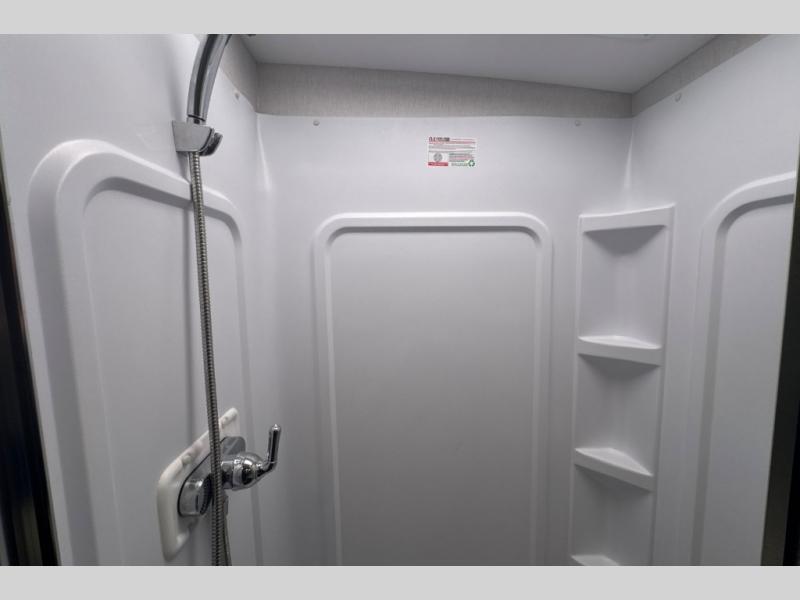This motorhome will be your home away from home! It features a rear private bedroom with a 72" x 75" king bed across from one end of the full wall slide that spans the entire length of the unit. In the bedroom portion of the slide you will find two wardrobes with storage between and a space where you can add an optional TV. Start and end your days getting clean in the full bath including a 26" x 38" shower, large vanity with sink, and toilet. Cooking will be easy with the indoor and outdoor spaces. Inside, find a stainless steel 2-door 10 cu. ft. refrigerator for your perishables and a pantry for everyone's favorite snacks. The 42" x 70" dinette with Hi-Lo table comes with storage to keep your games close, and the 40" x 66" sofa bed can be switched out for optional theater seating to relax in true comfort while you watch your favorite movies if you like. You can also add an optional StudioLoft powered 50" x 80" bed above the swivel cab seats for added sleeping space for one or two more guests. This model also includes the Tailgate Package with LP quick-connect, a stainless steel sink, a paper towel holder, a refrigerator, plus more!