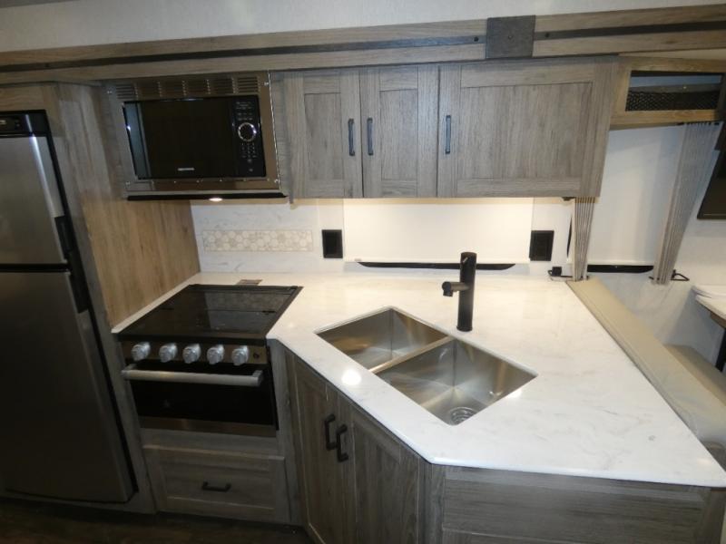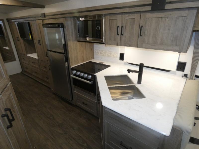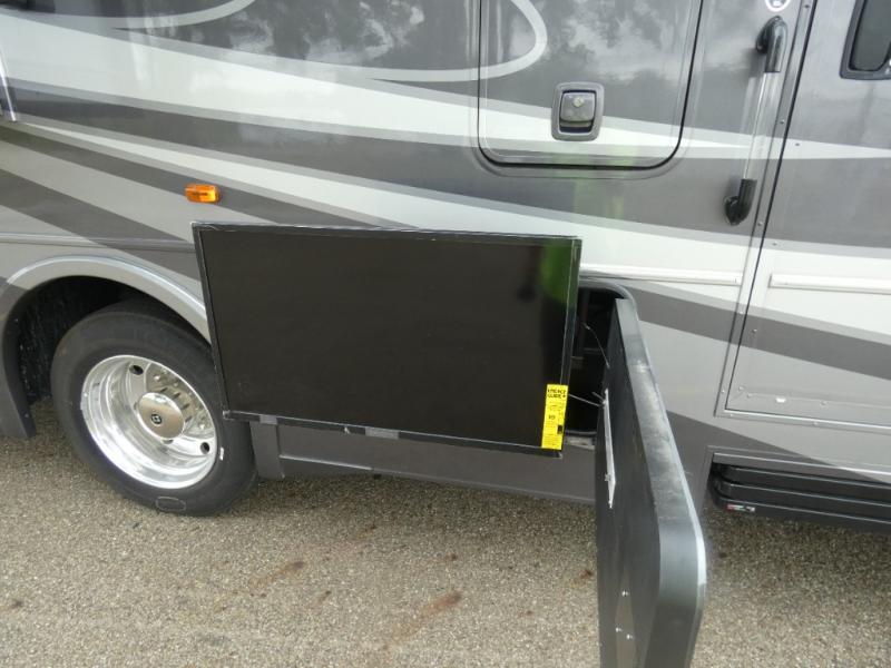 This Class A Vista from Winnebago has tons of great features. You'll love the private bedroom that includes a king bed, dual wardrobes, and a full rear bath with a 36" x 36" shower. An additional half bath is convenient for guests or when you have a big group travelling together. There are plenty of places to sleep, with a standard sofa bed and a StudioLoft drop-down bed that is designed to accommodate two additional guests with a generous 600-lb. capacity. The well-equipped kitchen has a three-burner cooktop, stainless steel double sink, 10 cu. ft. refrigerator, and two pantries. An additional coat closet by the door plus exterior lighted storage compartments means there's plenty of room for all your gear.