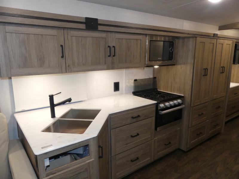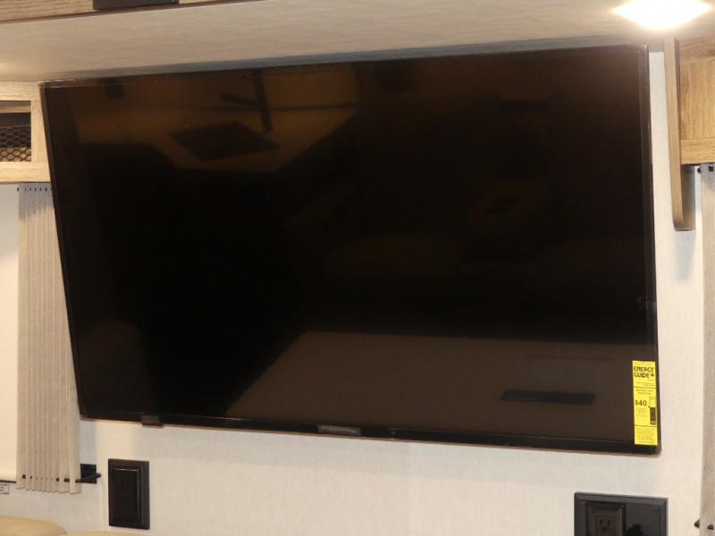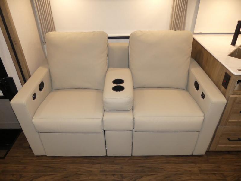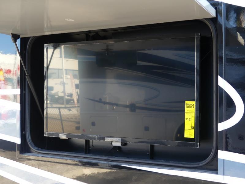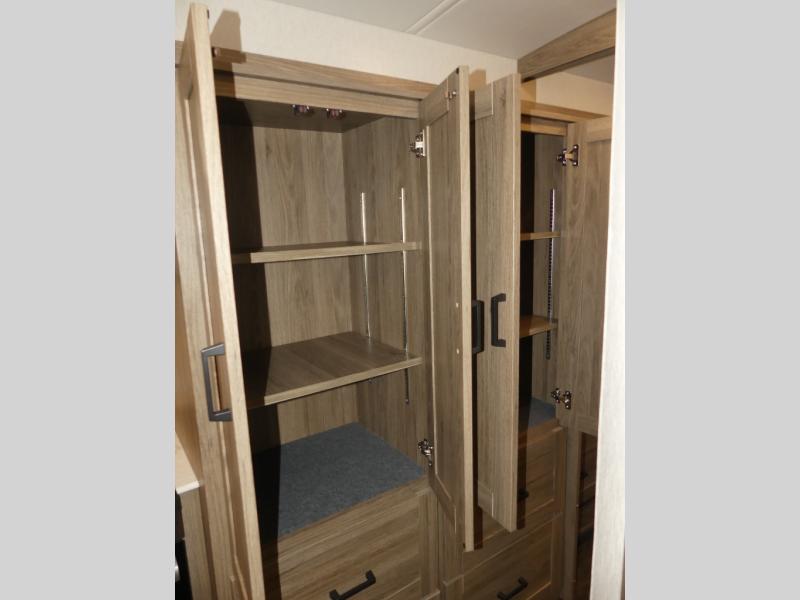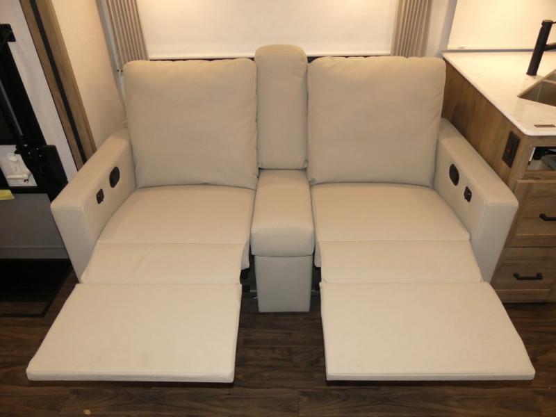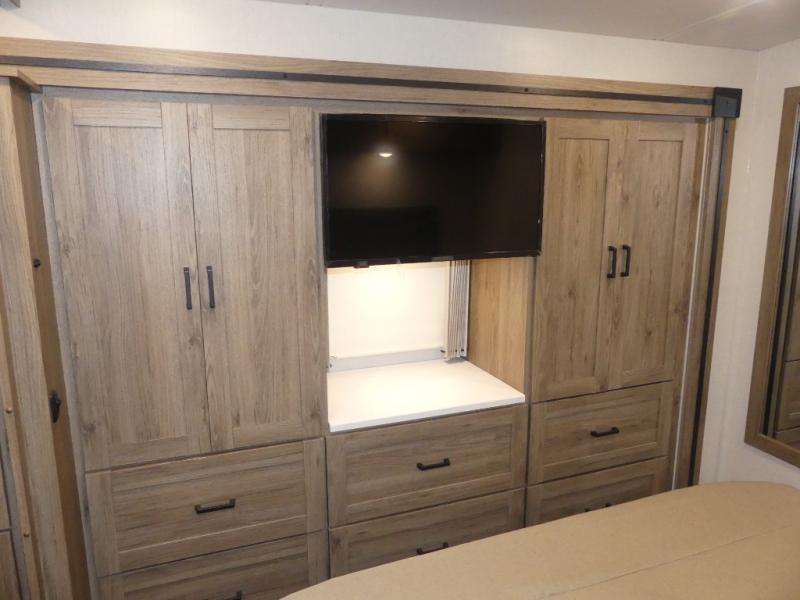 x 75" king Murphy bed that folds down and when it's stored away there is a dinette workstation for you to get some work done in comfort, plus wardrobes on either side of a dresser and an entrance into the dual entry bathroom. Across from the bathroom is a large pantry with exterior storage access for your convenience. The chef will have an easy time preparing delicious meals in the fully equipped kitchen, and they can be enjoyed at the 42" x 95" U-shaped dinette slide. The theater seating is a great for relaxing while watching a movie on the 39" LCD HDTV.