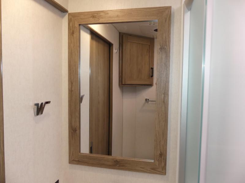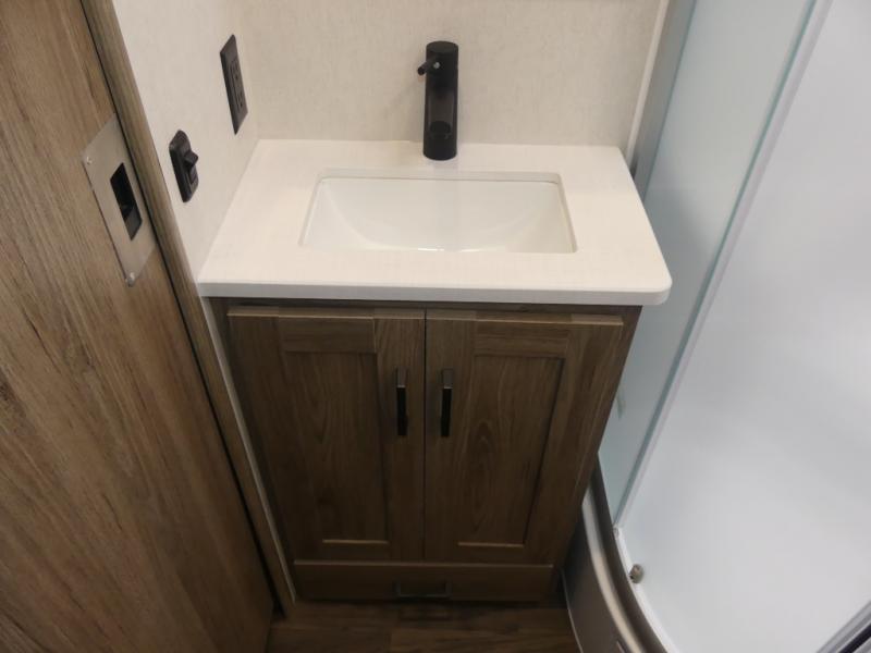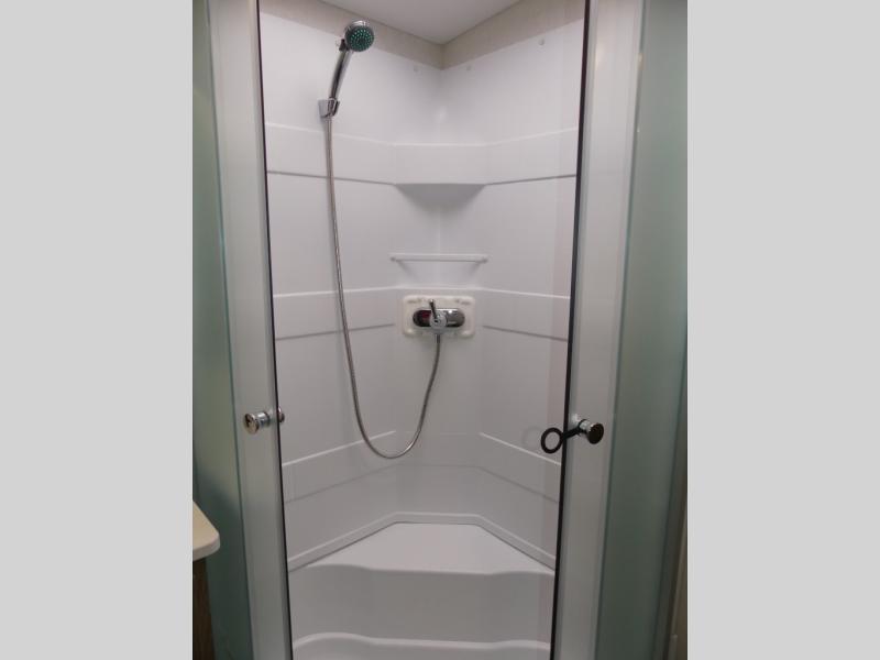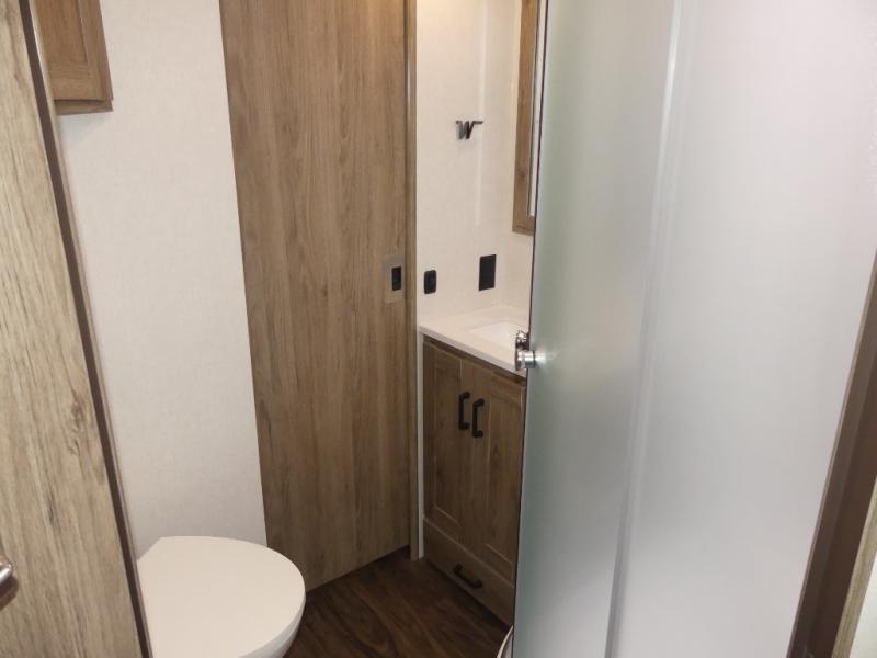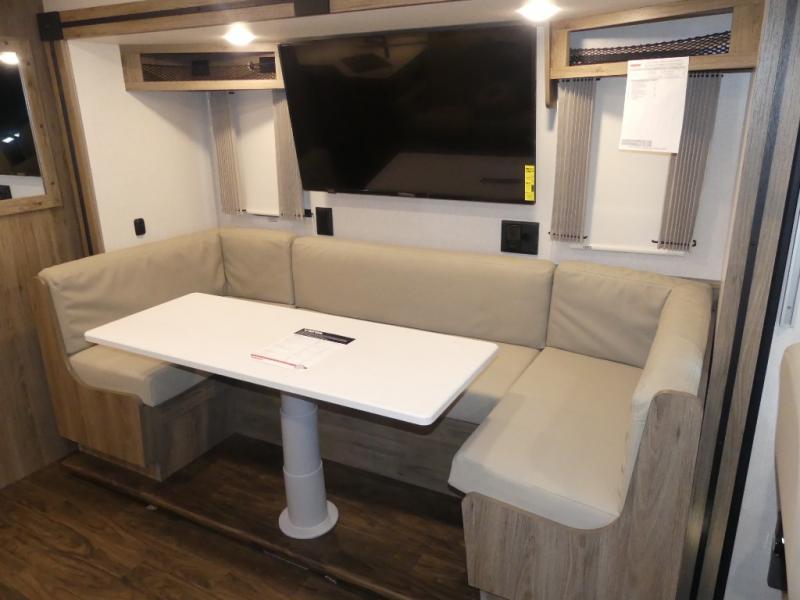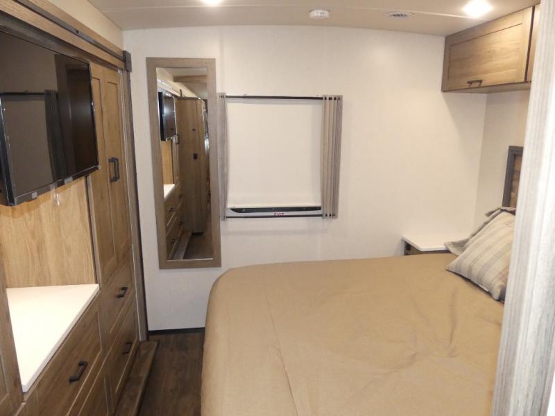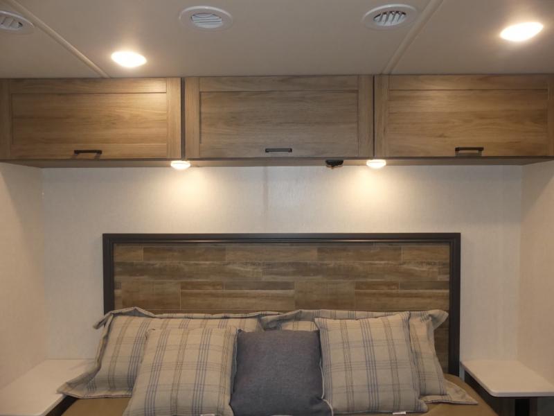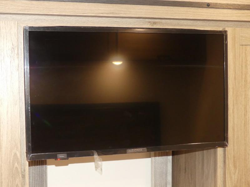 x 75" king Murphy bed that folds down and when it's stored away there is a dinette workstation for you to get some work done in comfort, plus wardrobes on either side of a dresser and an entrance into the dual entry bathroom. Across from the bathroom is a large pantry with exterior storage access for your convenience. The chef will have an easy time preparing delicious meals in the fully equipped kitchen, and they can be enjoyed at the 42" x 95" U-shaped dinette slide. The theater seating is a great for relaxing while watching a movie on the 39" LCD HDTV.