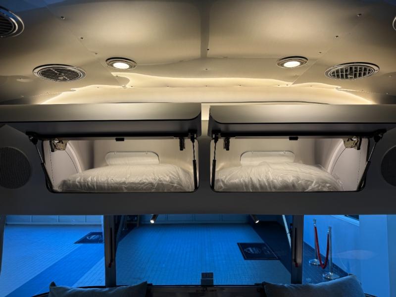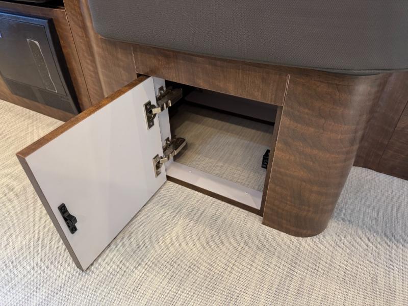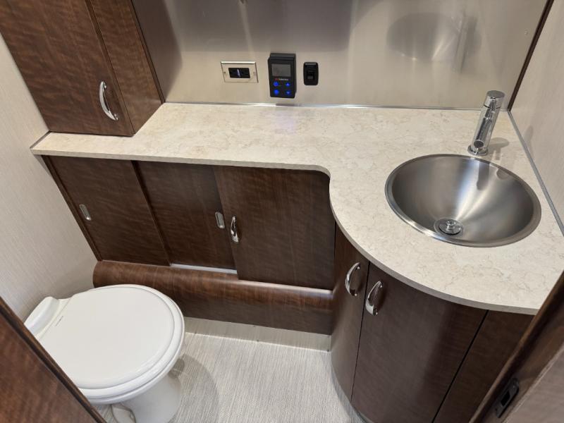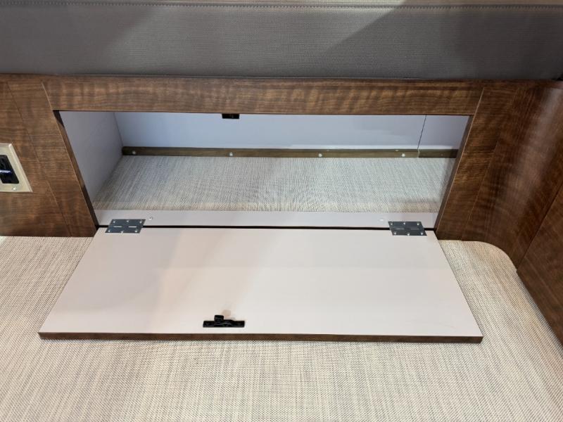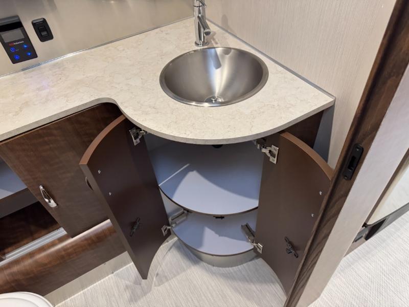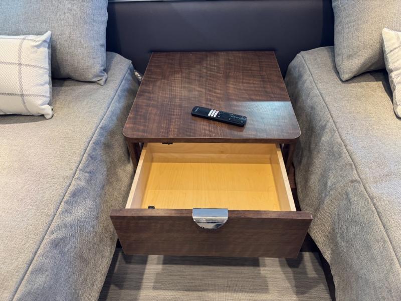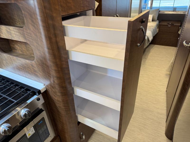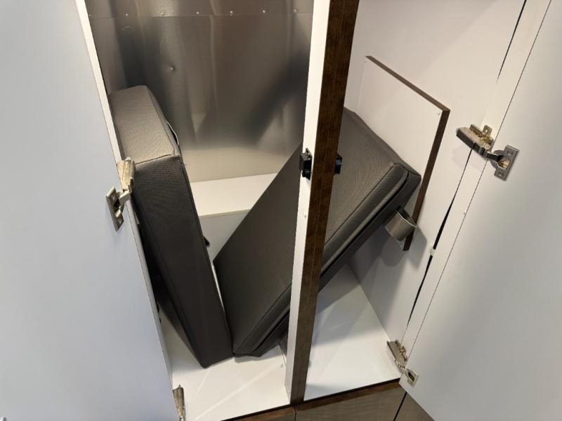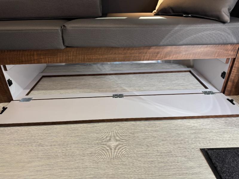 Start traveling the country in true luxury with this travel trailer! It features a front wrap around lounge with stain resistant Spradling Hitch fabric that can be pulled out and the table lowered to create a 38" x 84" bed. A separated bathroom makes it easy for one person to freshen up in the shower with a seat while another is across the way utilizing the private toilet and vanity. The rear twin beds have AdaptaFlex memory foam mattresses to enjoy a good night's rest, nightstands to set your glass of water, and an HD 12V TV to watch your favorite movie in bed. You will find plenty of storage throughout between the upper and lower kitchen cabinets, a slide-out pantry, multifunctional storage bins that are flush to the surface behind the deep stainless steel Moen sink, under-the-bed storage, and a closet to hang your clothes.
