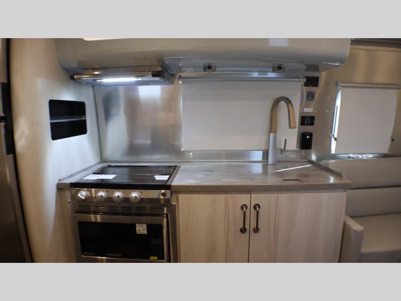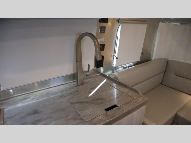 Every time you step foot into the Airstream International travel trailer, you will feel as if you are breathing in a breath of fresh air! The fresh coastal décor was inspired by the waterfront, and the stylish interior delivers a relaxing environment and comfortable luxury. The panoramic windows increase the amount of natural sunlight that streams through to the interior, but they also have blackout shades that you can close whenever you need a darkened room. The beautiful handcrafted marine-grade Lite-Ply laminated cabinetry is an attractive base for the overhead storage lockers that have sliding doors and LED lighting. The dimmable interior LED lighting will create the perfect amount of illumination for you as you spend time indoors. The exterior has excellent features as well with its enclosed aluminum insulated heated underbelly, unique front door key with heavy-duty deadbolt, optional solar package, solar front window protection, and exterior shower with hot and cold water.