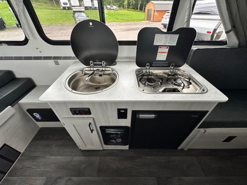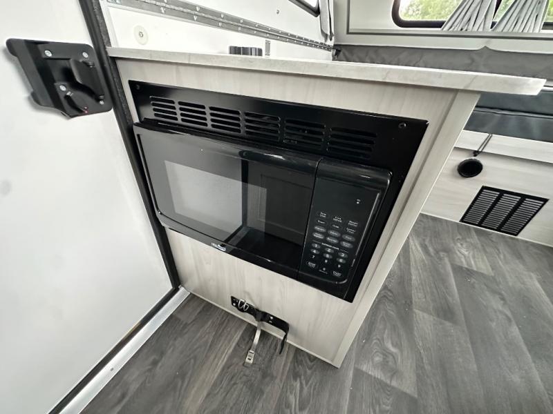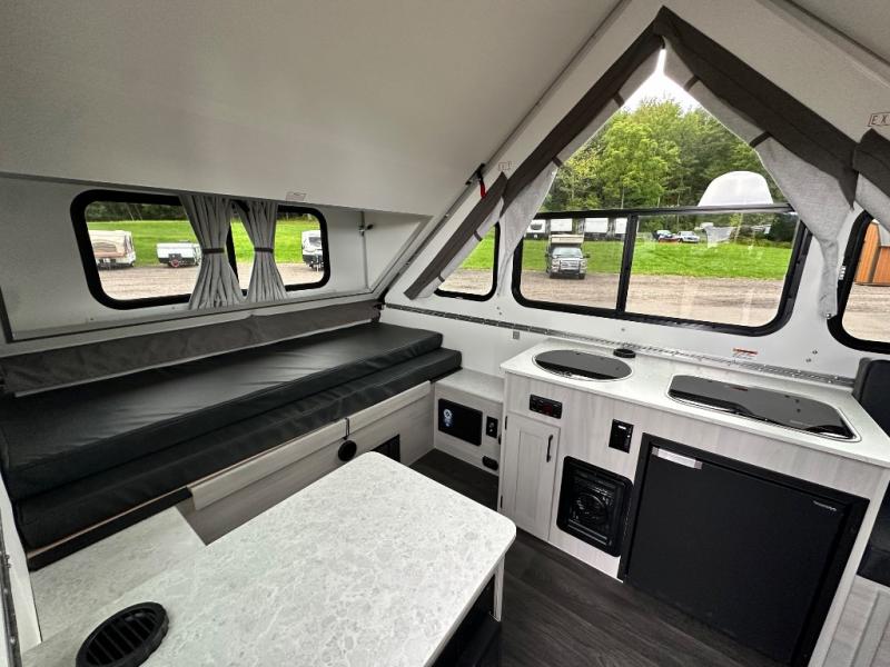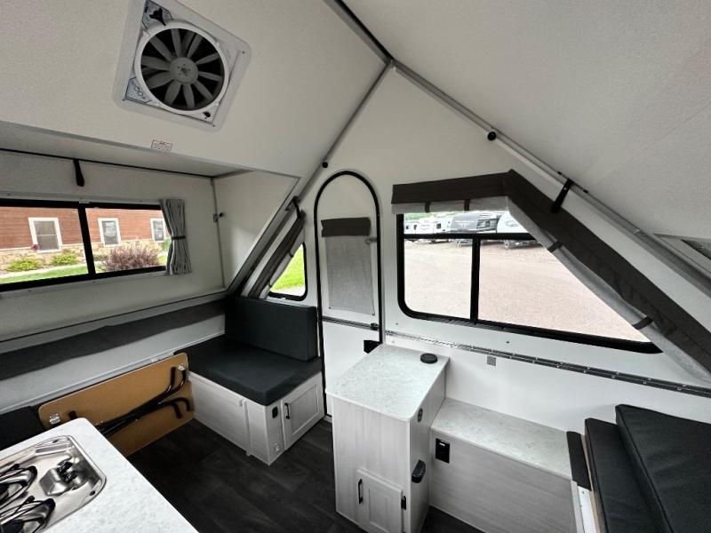 Camping has never been easier than in this A-frame camper. Once you arrive at your destination, grab your gear from the two exterior baggage doors, then head inside to make lunch on the two-burner stove top. The sofa bed can convert to a 60" x 76" bed, and the dinette converts to a 46" x 76" bed for comfortable sleeping space at night. You will also enjoy LED interior lights and electrical outlets to keep you charged up, and there is plenty of storage for your camp gear. And an optional front and/or rear hard dormer can be added if you want additional standing space!