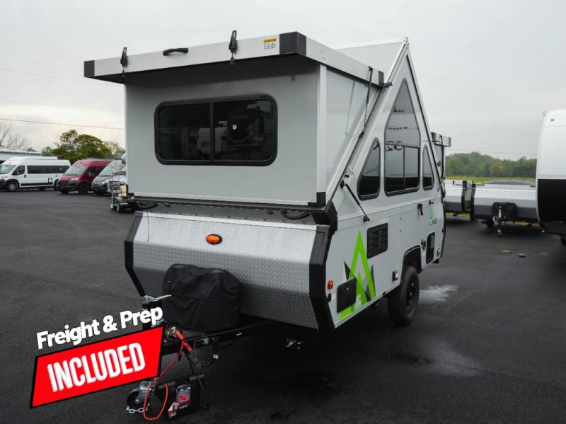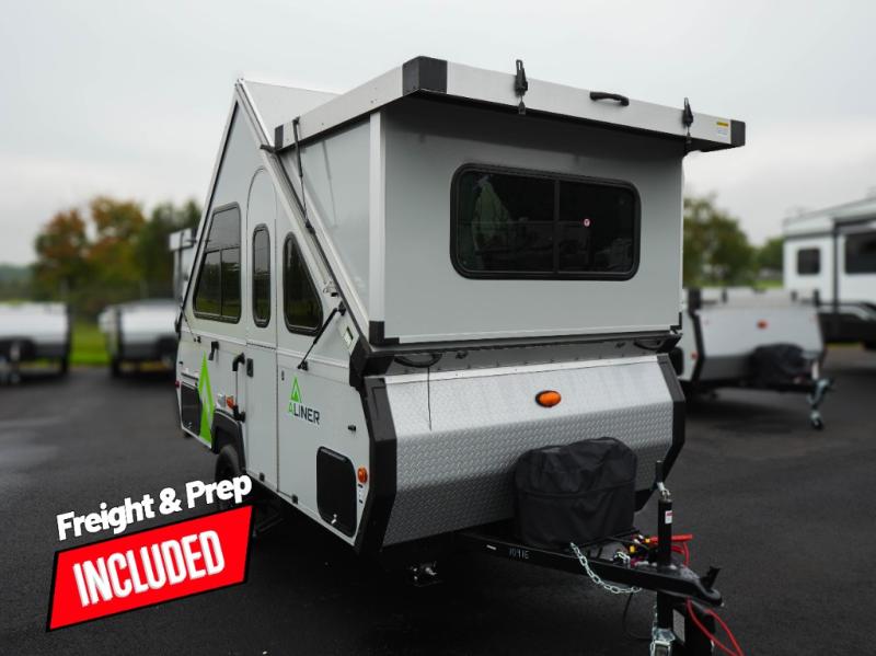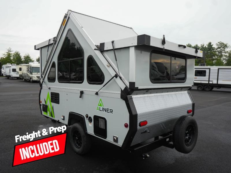 With any Aliner Classic A-frame folding pop-up camper you will find Azdel lightweight, composite interior wall and ceiling panels for added durability and strength. The additional corner windows provide panoramic views, and the hardwood cabinet doors will give these campers a more at-home feel. Four stabilizer jacks come standard, along with an LP connection, an exterior outlet, and an outside shower. It's no wonder these campers are named classic! Choose your model and start camping today!