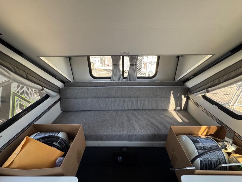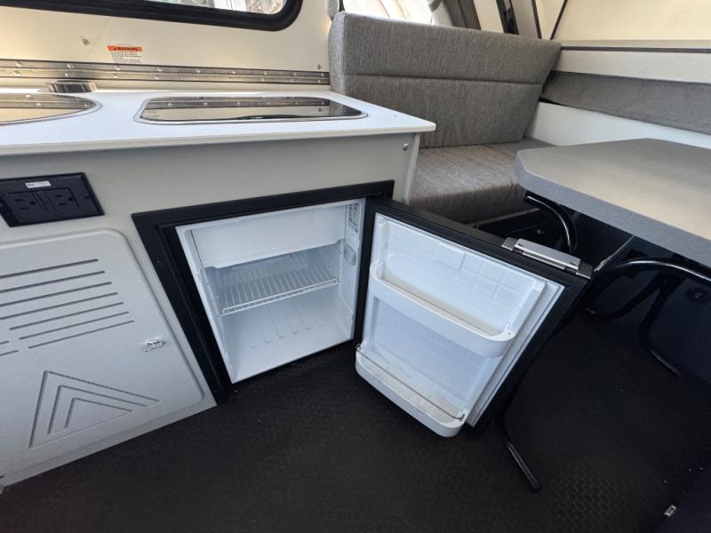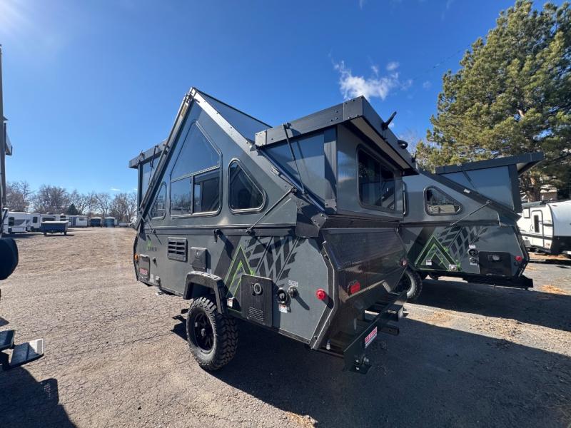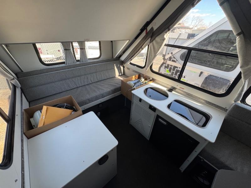 The Evolution A-frame camper by Aliner is coming to you with residential features and solid construction materials. You'll love the slate gray exterior, aluminum wheels, and the Azdel composite panels to help prolong the life of your camper. There are LED running lights, exterior baggage doors, and four stabilizer jacks to help keep your camper secure. You will also appreciate the keyless entry, the dual LP tanks with a cover, and the 200-watt solar panel on the front dormer for some off-grid power. The lift kit and 15" off-road tires add 3" to the height, allowing you to explore more roads, and you'll find many interior comforts to make you feel right at home!