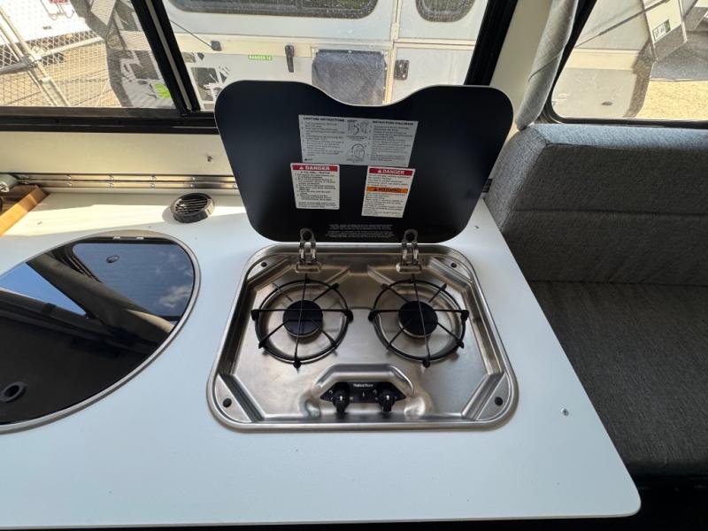 If you're looking for a lightweight camper that can sleep four, take a look at this Evolution 12! There is a sofa bed in the back that will convert to a 56" x 76" bed each night, and a dinette that converts to a 46" x 76" bed. In the morning you can prepare breakfast on the two-burner stove, clean up with the flush mount sink, and store cold items in the 3.2 cu. ft. 12V refrigerator.