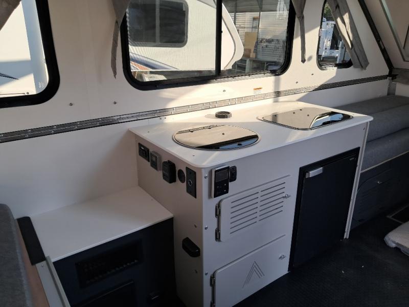 The Evolution A-frame camper by Aliner is coming to you with residential features and solid construction materials. You'll love the slate gray exterior, and the Azdel composite panels included help prolong the life of your camper. There are 15" off-road tires with graphics package, LED running lights, exterior baggage doors, plus many more exterior conveniences. The Evolution A-Frame camper comes with commercial grade, raised coin polyvinyl flooring, SIMONA BOATBOARD interior cabinets and furniture, and three indoor electrical outlets to name a few interior comforts.
