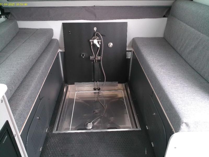 Don't wait another minute, head to the campground in this camper today! There is a two-burner cooktop to make lunch on and a 3.2 cu. ft. 12V refrigerator for your cold items. The sofa bed converts to a queen-size bed, and the dinette also converts to a queen-size bed. You'll find storage space for your items, and there is a 32" x 32" hidden shower under the dinette so you can clean up each day. This model also has a dry weight of 2,400 lbs. for easy towing!