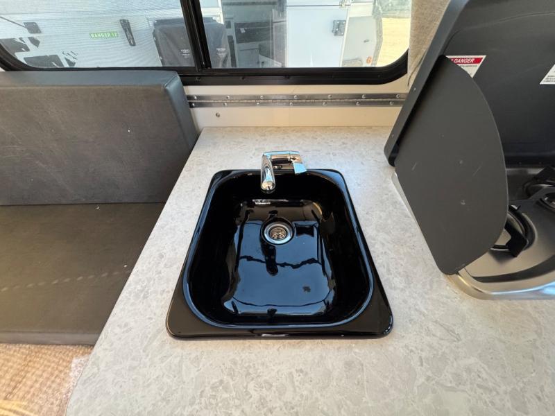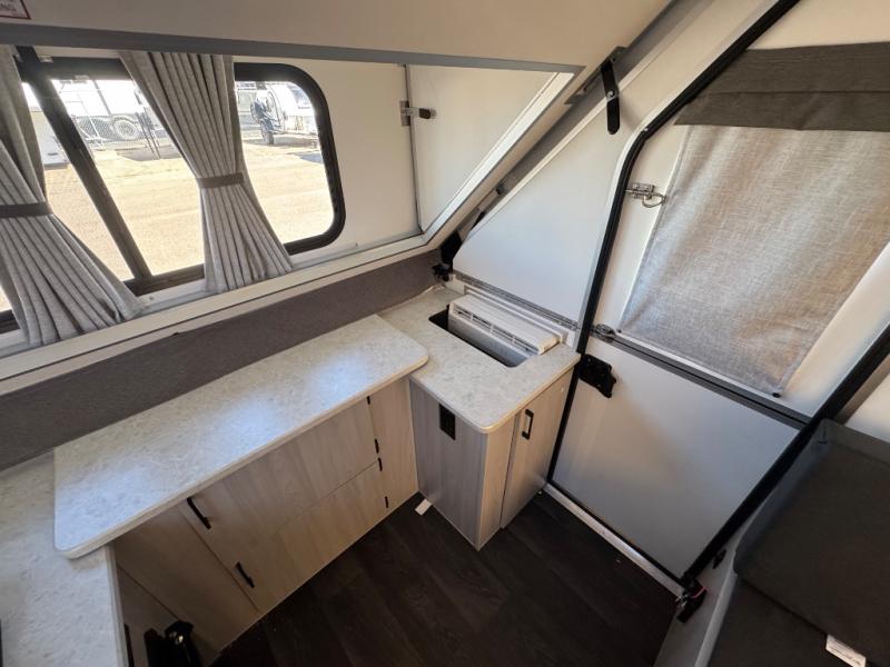 When you only need sleeping space for one or two, enjoy making last minute plans, and prefer your everyday vehicle to do your towing, this camper makes sense! The front kitchen makes it easy to walk around as you prepare meals using the two-burner stove and sink, and there is more counter space plus extra storage near the entry. And you'll appreciate the 1.7 cu. ft. 12V refrigerator for food storage. The rear dinette converts into a 40" x 76" bed so you can utilize this space for dining and sleeping space!